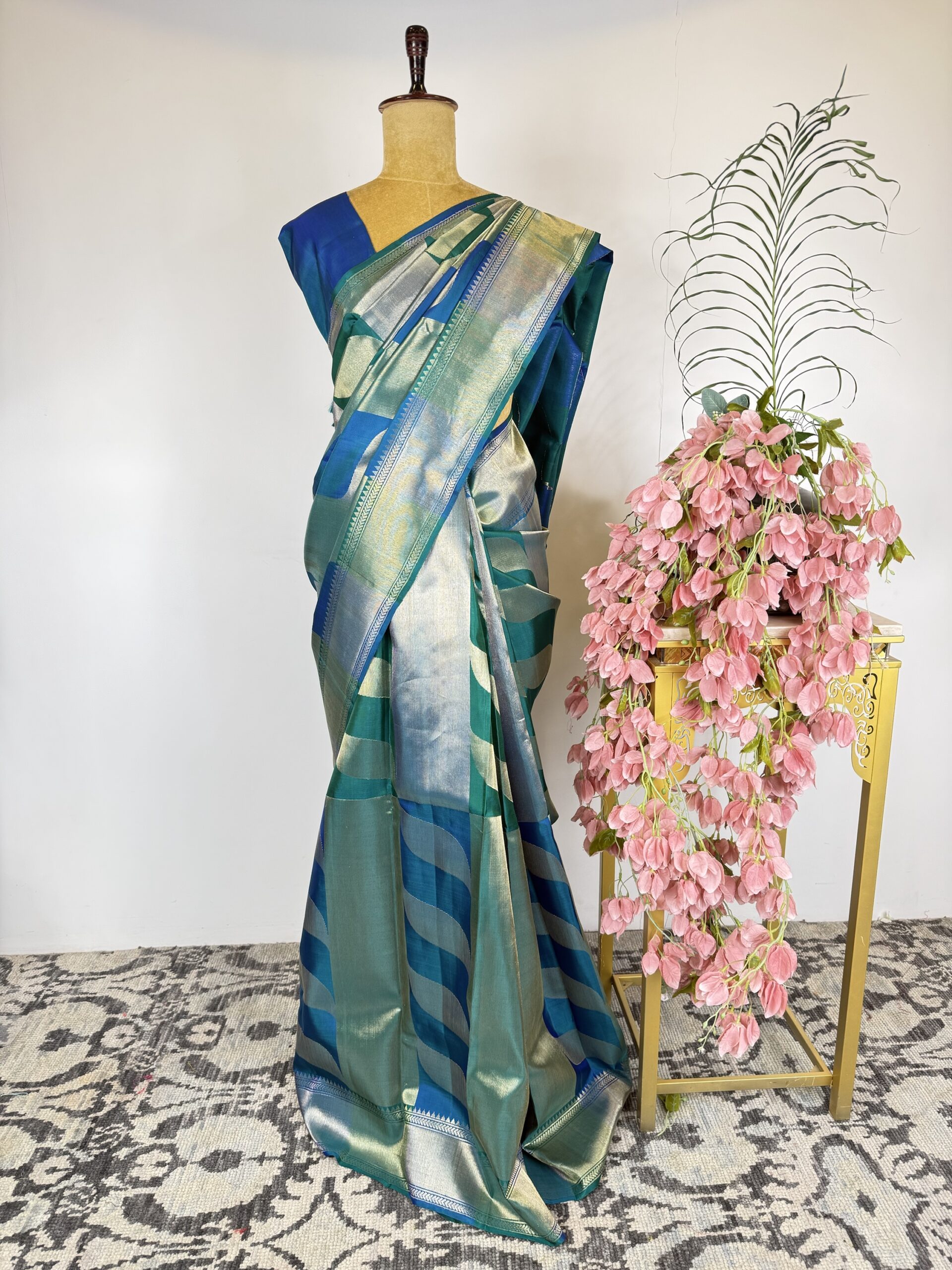 - Graceful Glimmers: Double-Shaded White & Peach Gown with Zari & Thread Embroidery
