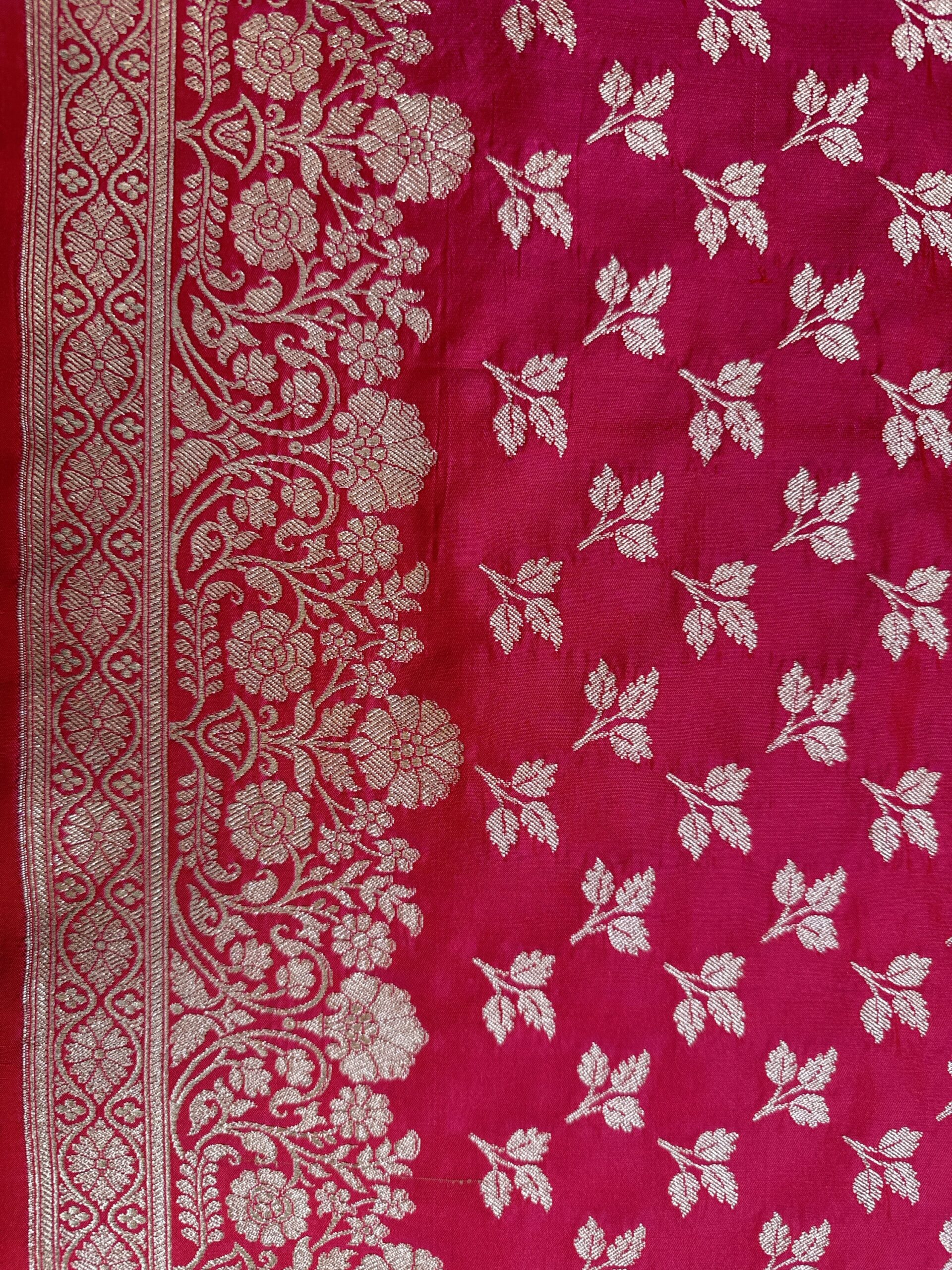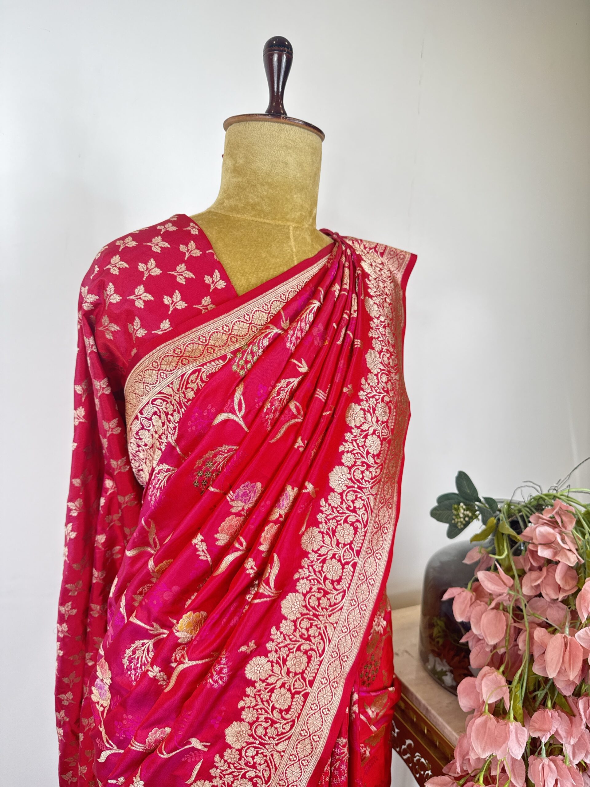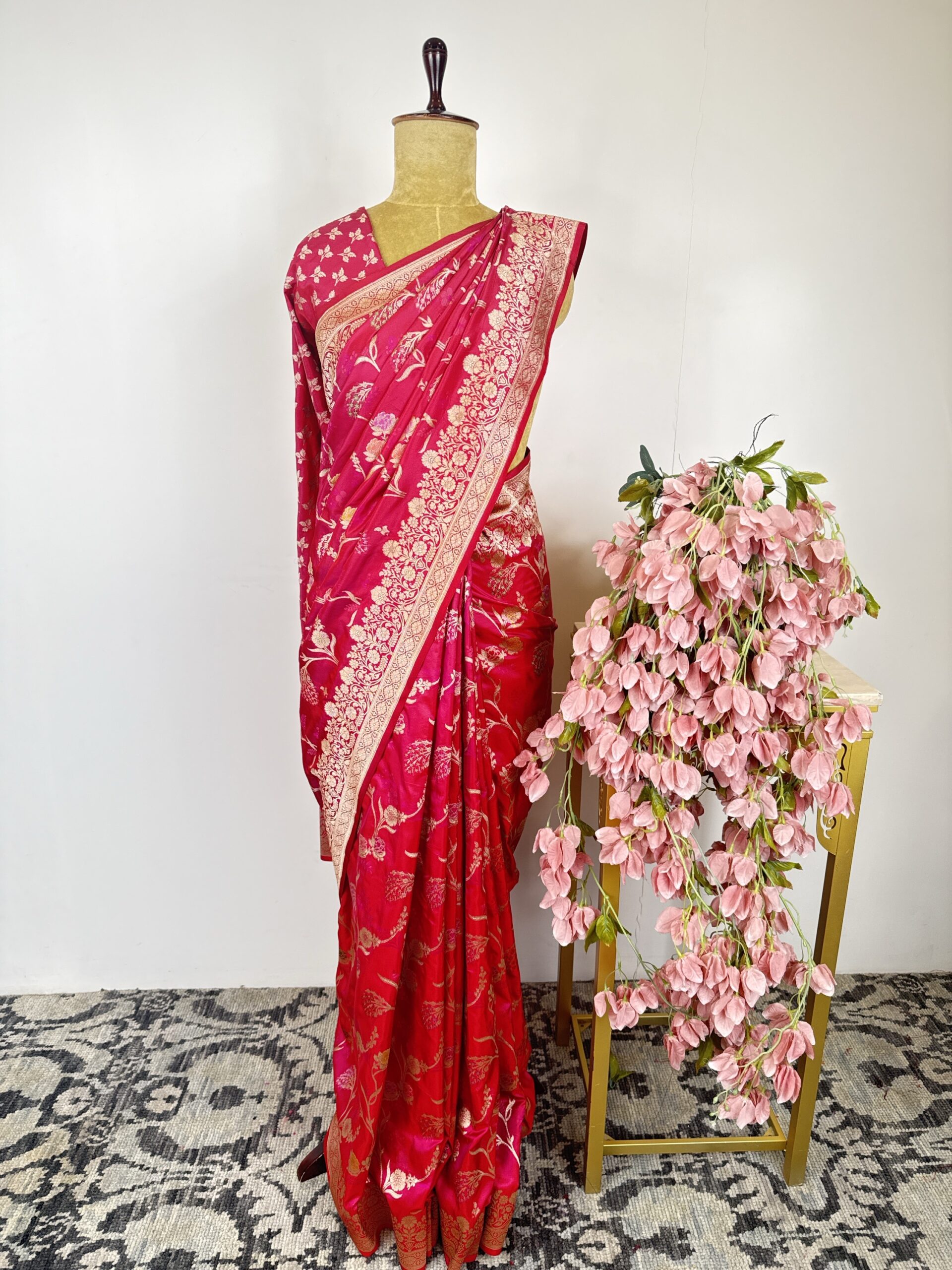 Pink and orange (dual shade) Banarasi silk saree with floral motifs all over jaal and detailed with meenakari