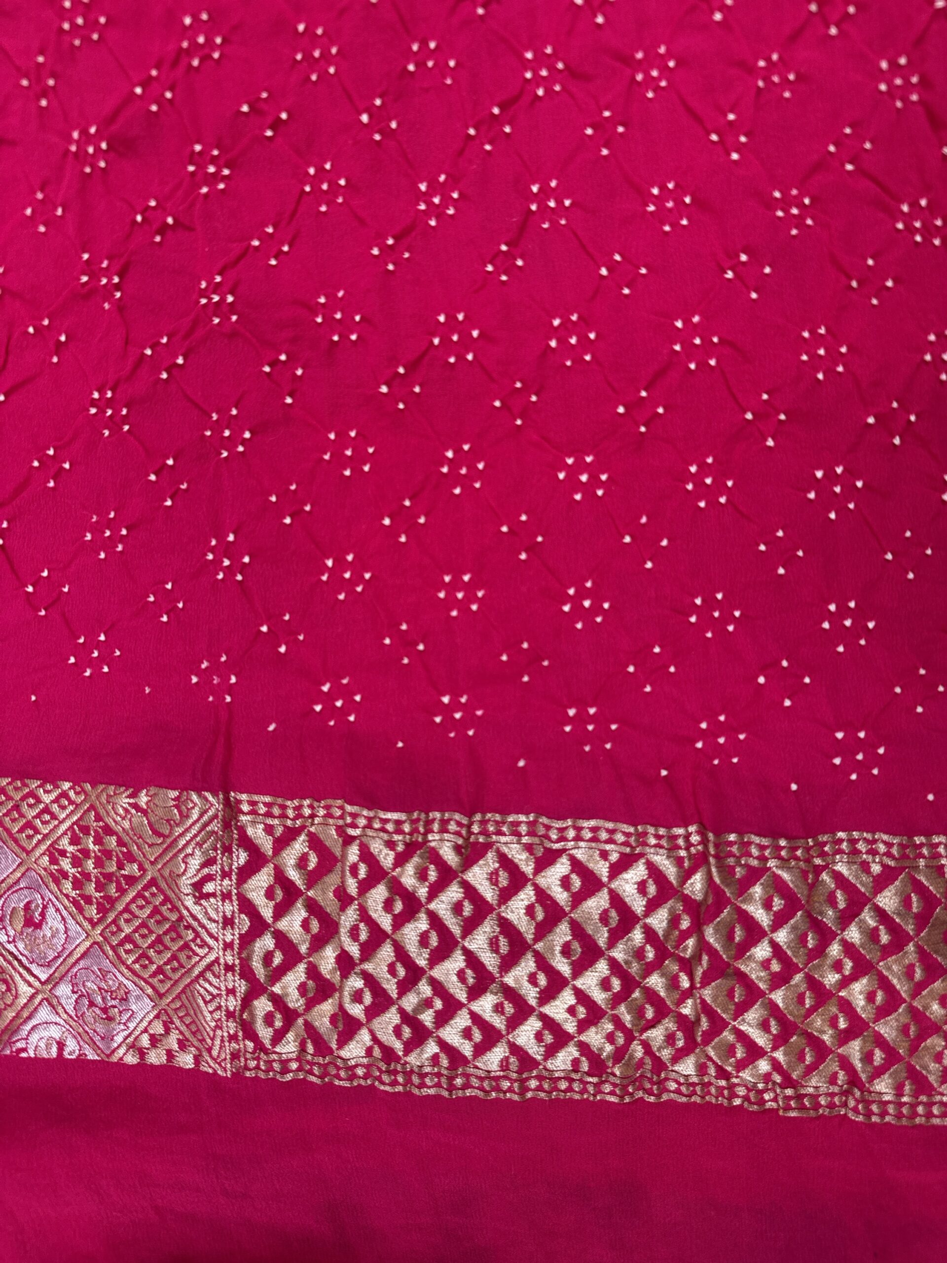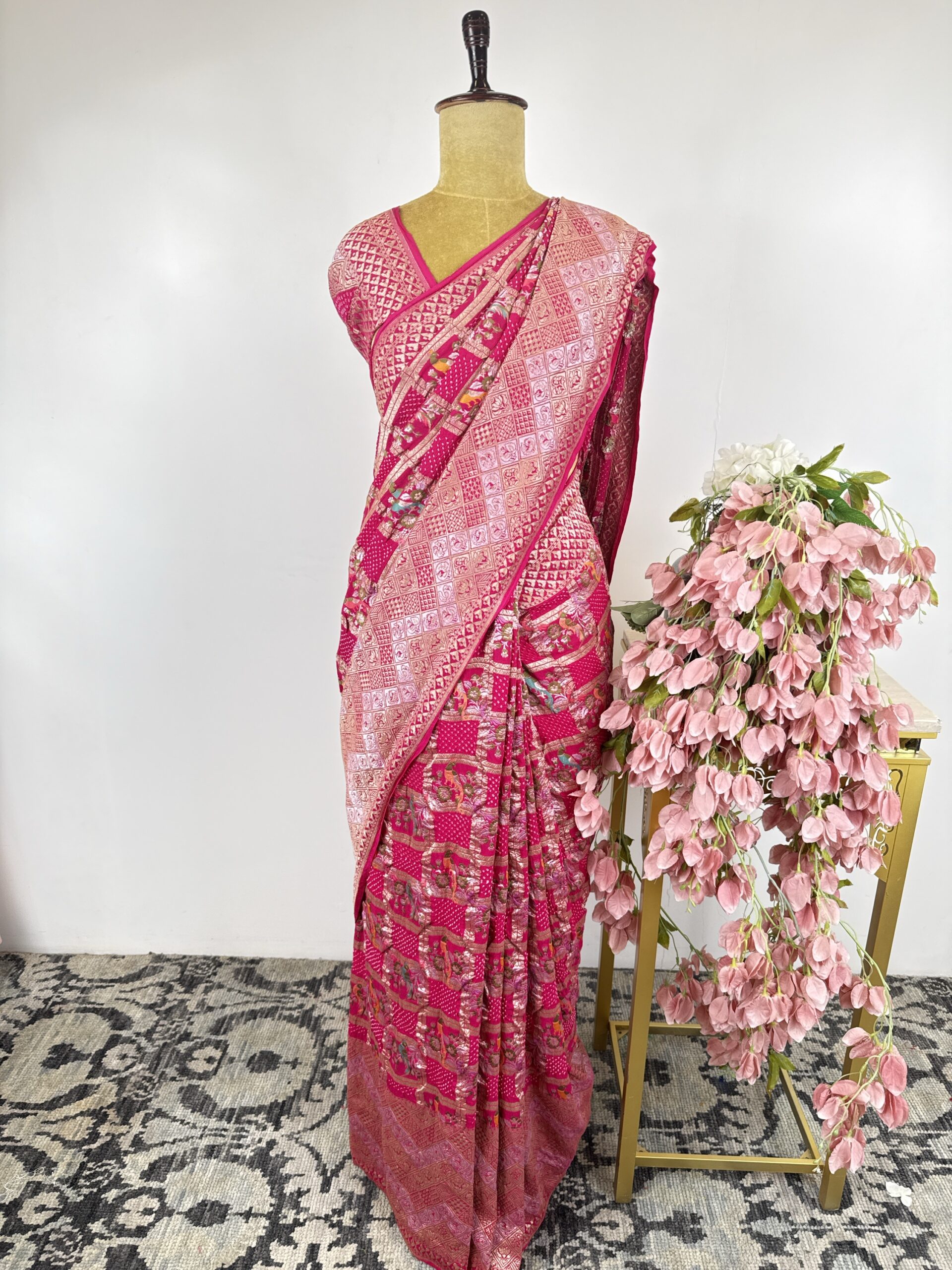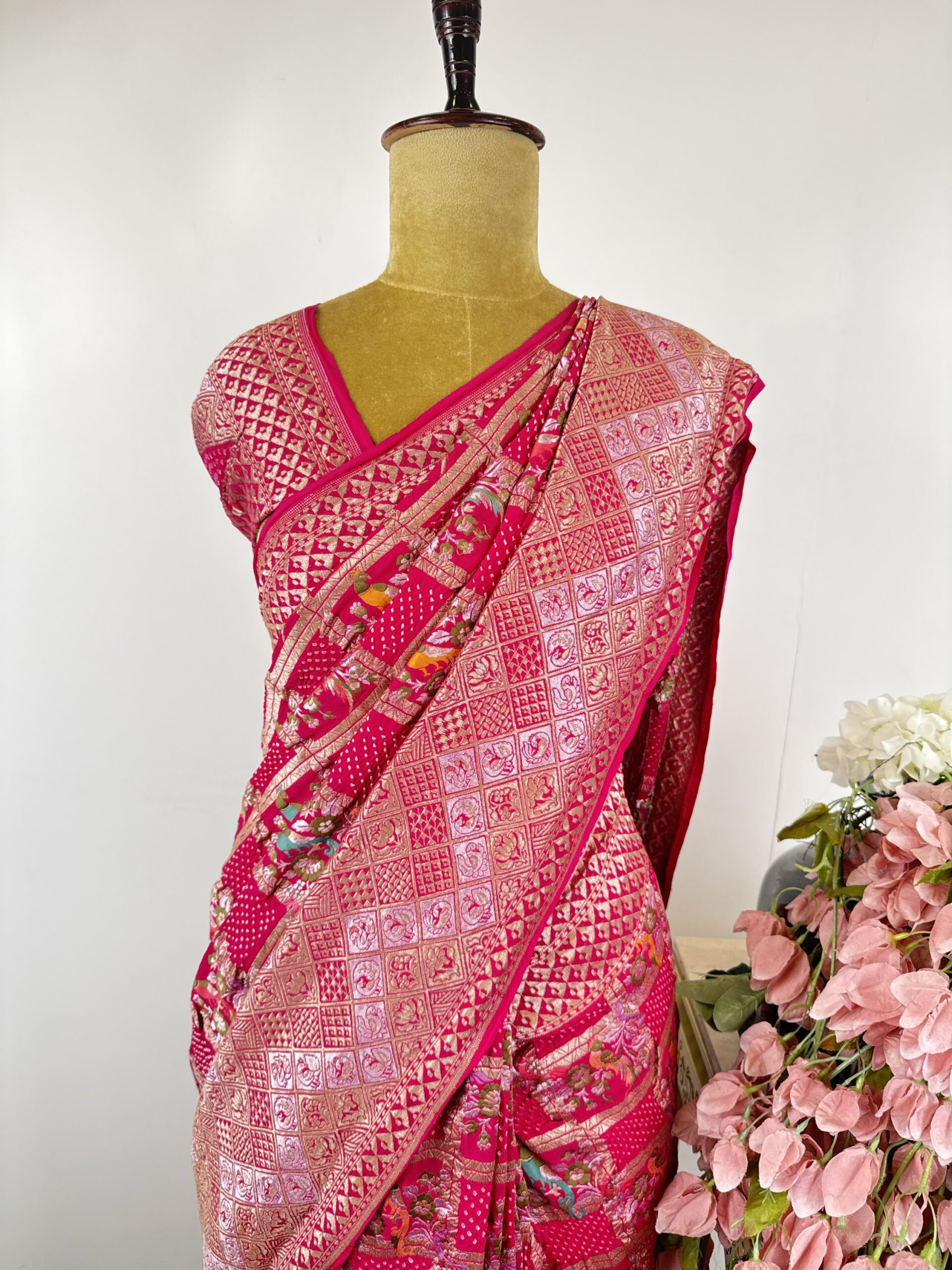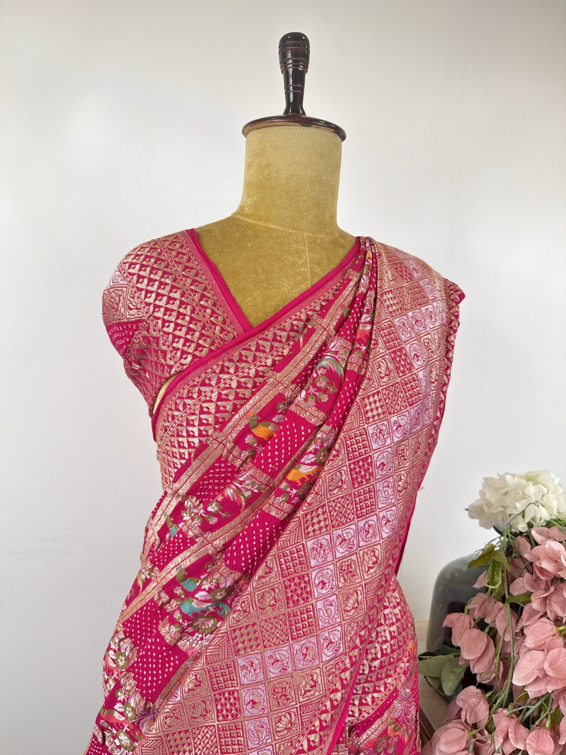 Pink colour bandhani saree with floral and parrots motifs detailed with Meenakari and silver and gold zari