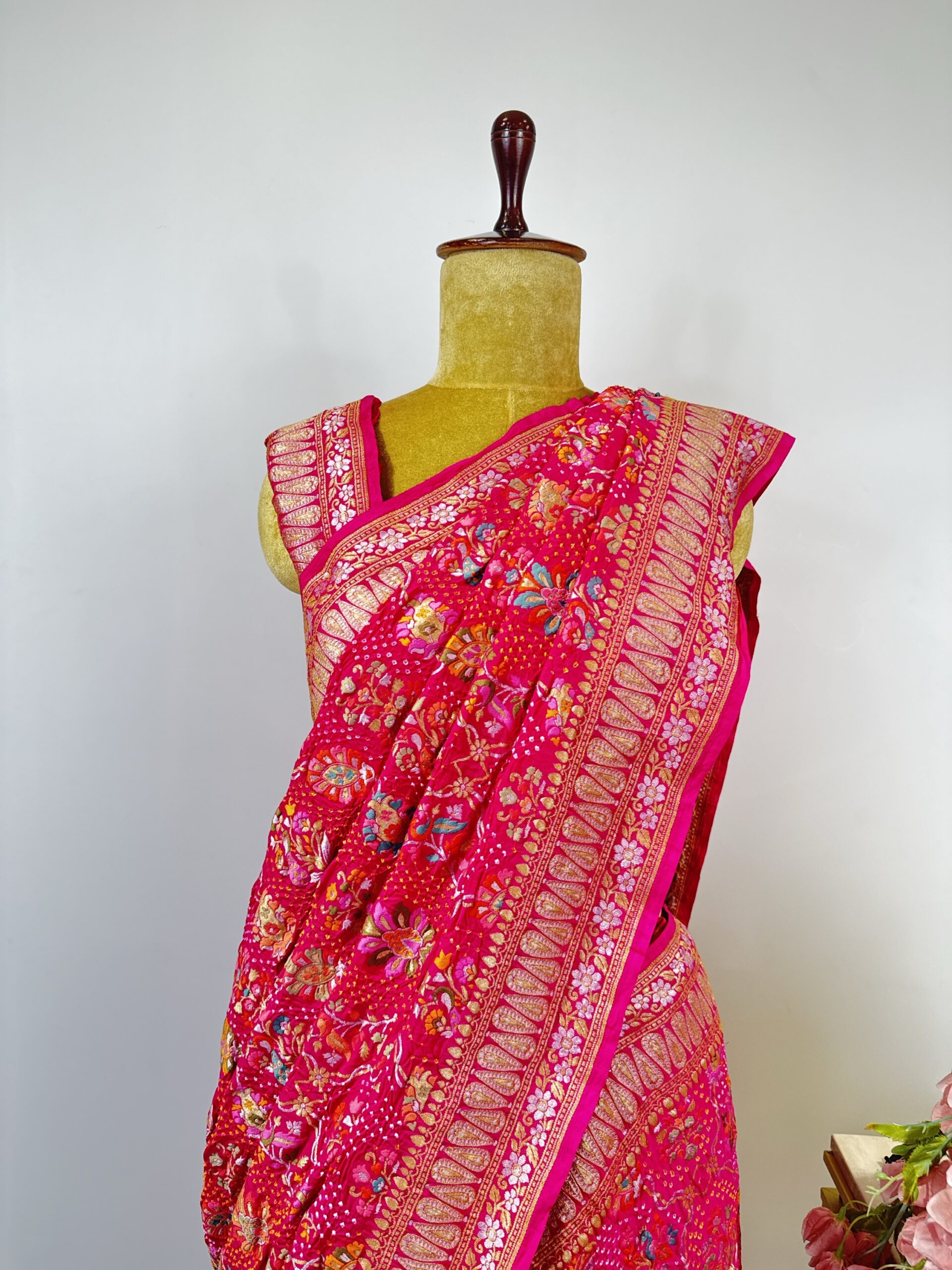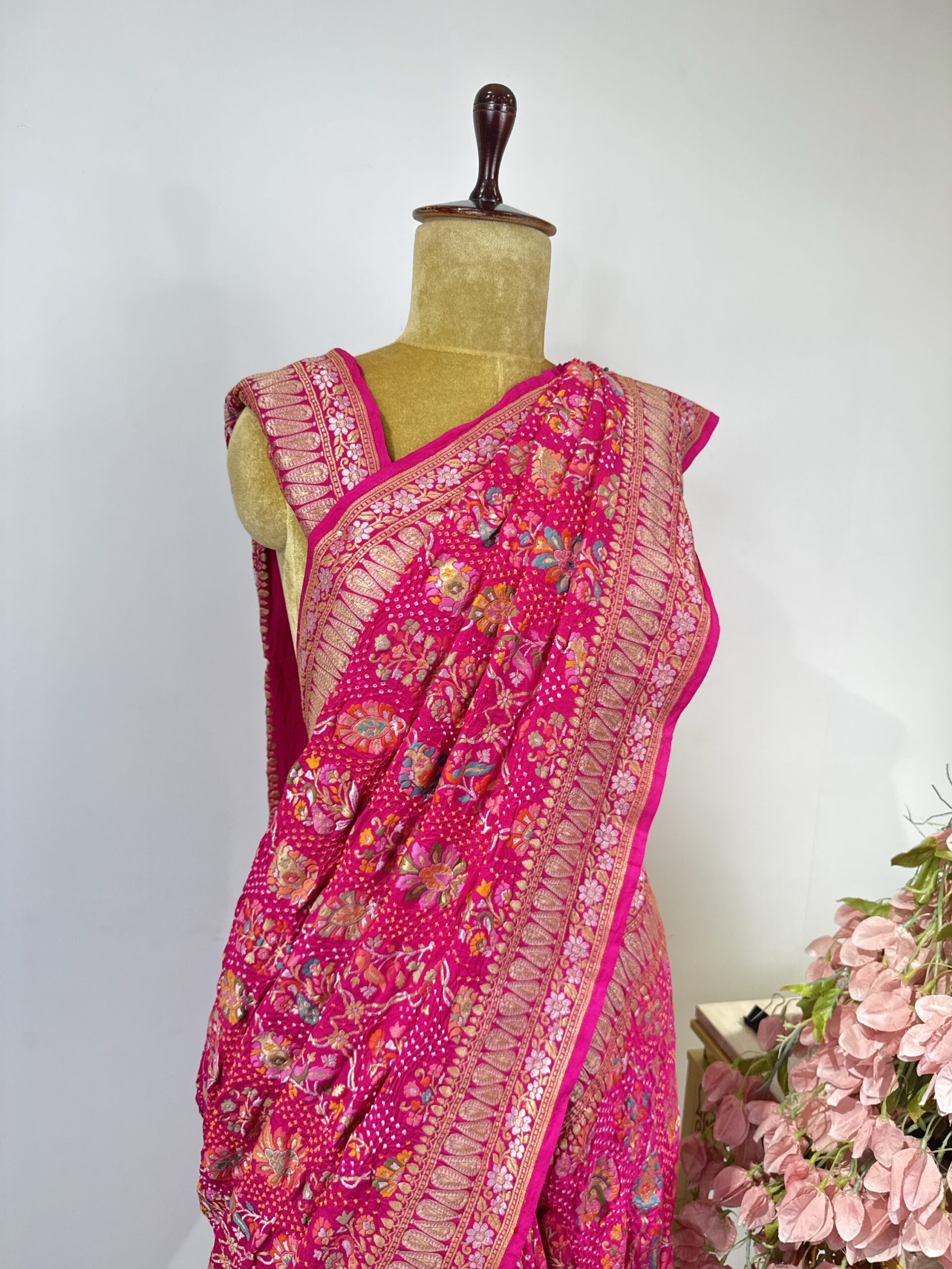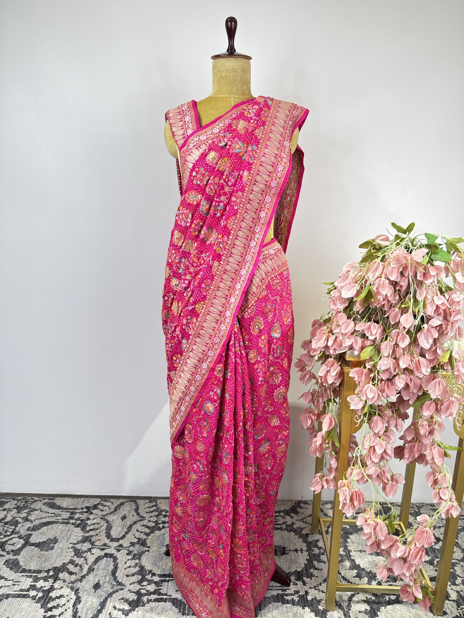 Pink colour bandhani Georgette saree with silver and gold zari floral motifs detailed with meenakari .