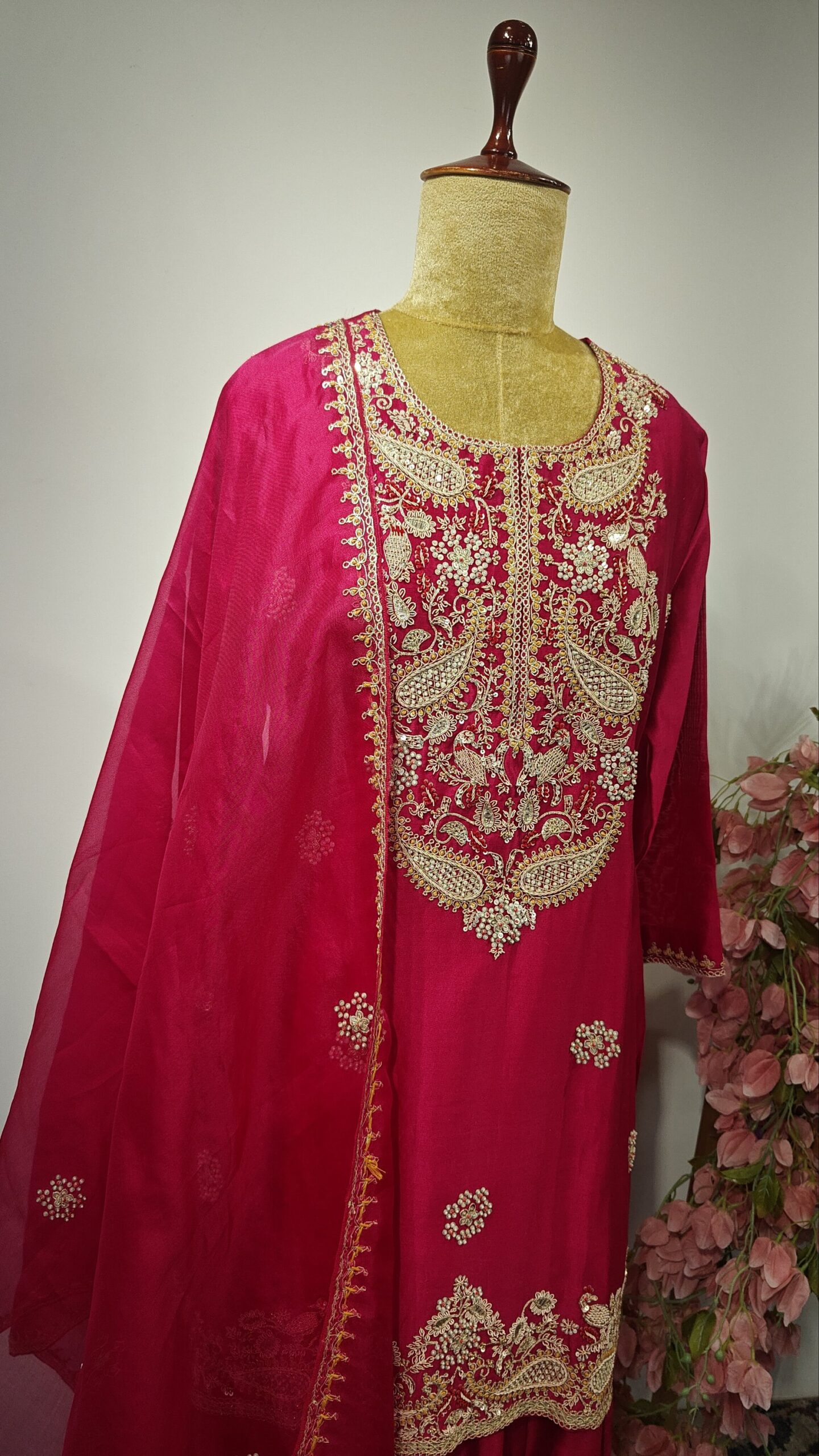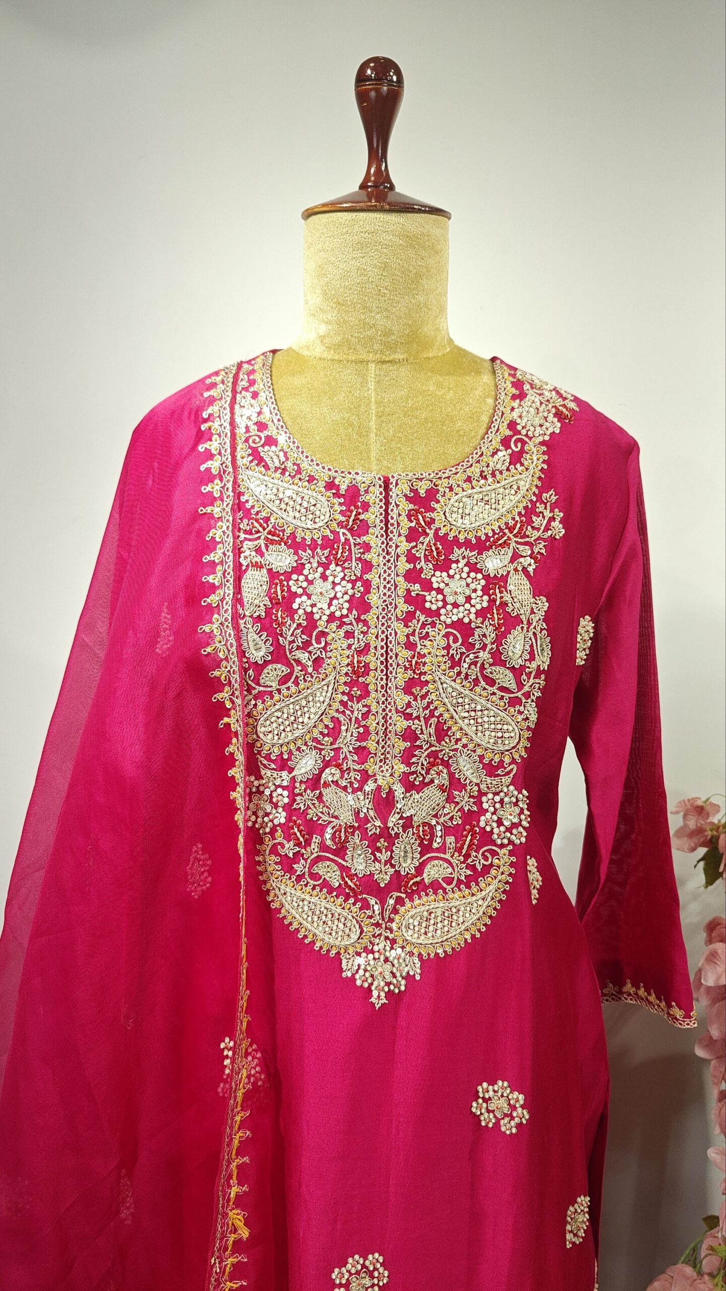 Pink colour 3 pcs kurthi set. Top has beautiful hand done dori and zardosi work at York and bottom part and pant has also dori and zardosi work at bottom part and duppatta has four sides border with work