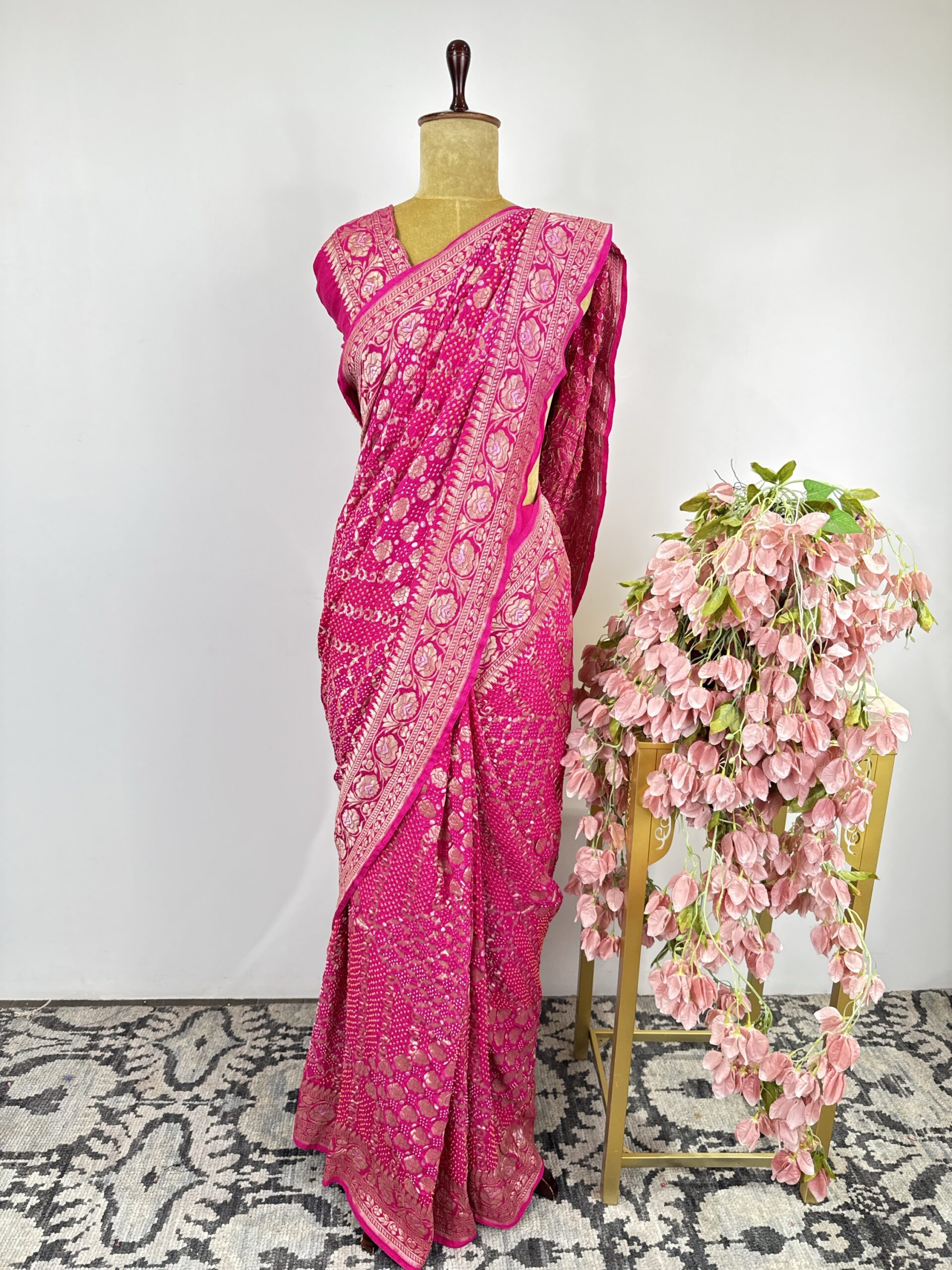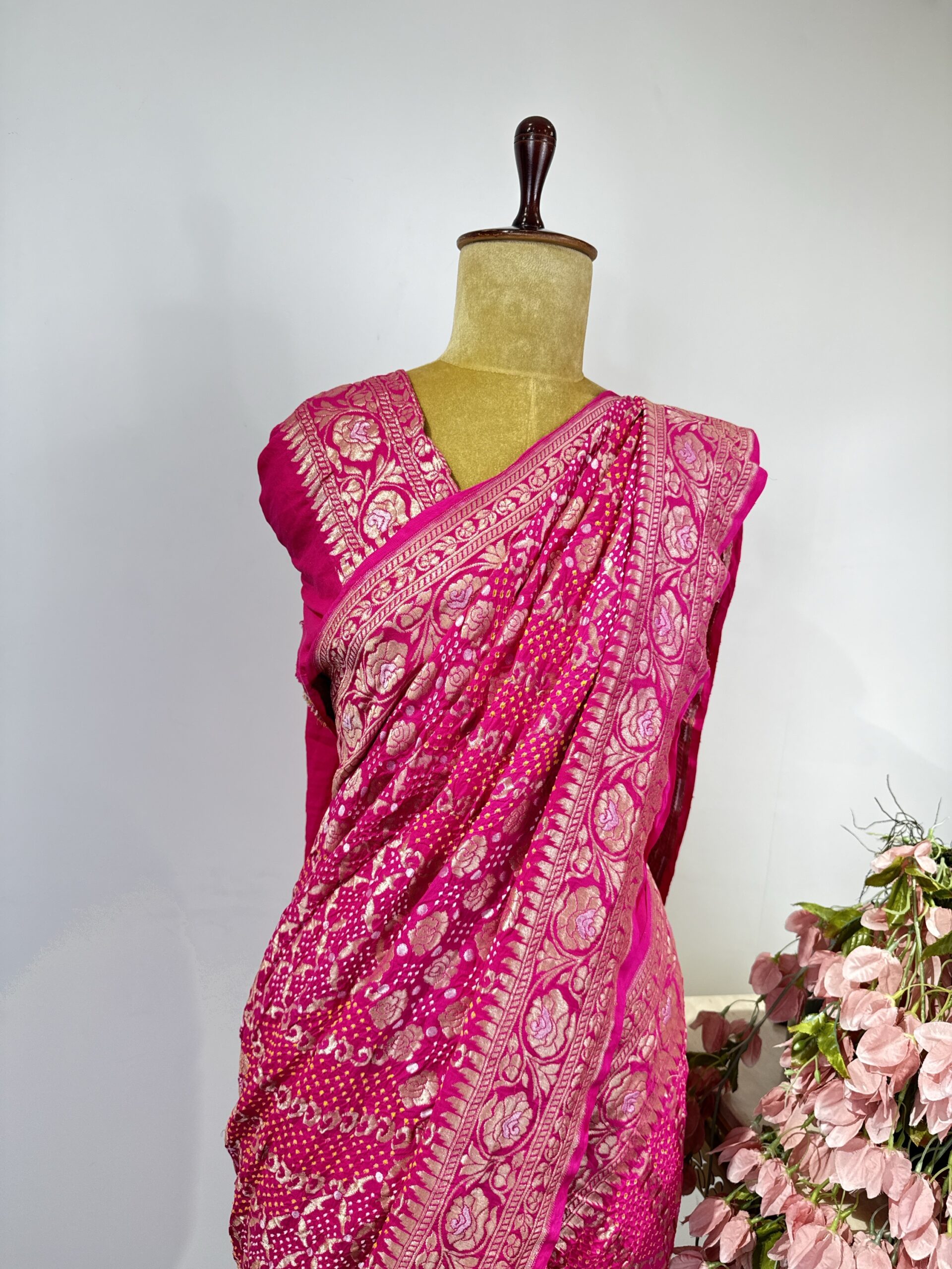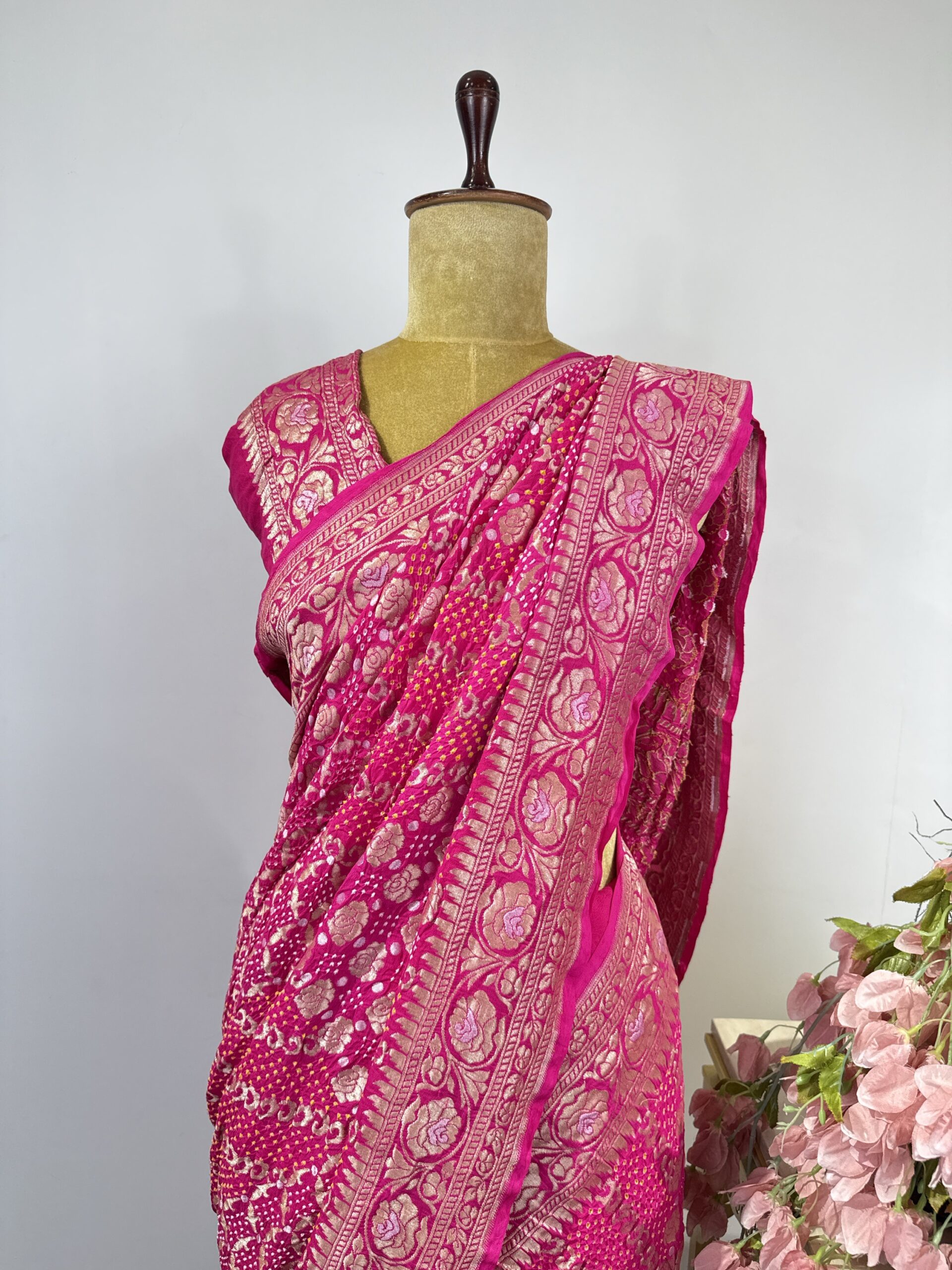 Pink colour pure Georgette Bandhani saree with beautiful rose floral motifs detailed with gold and silver zari