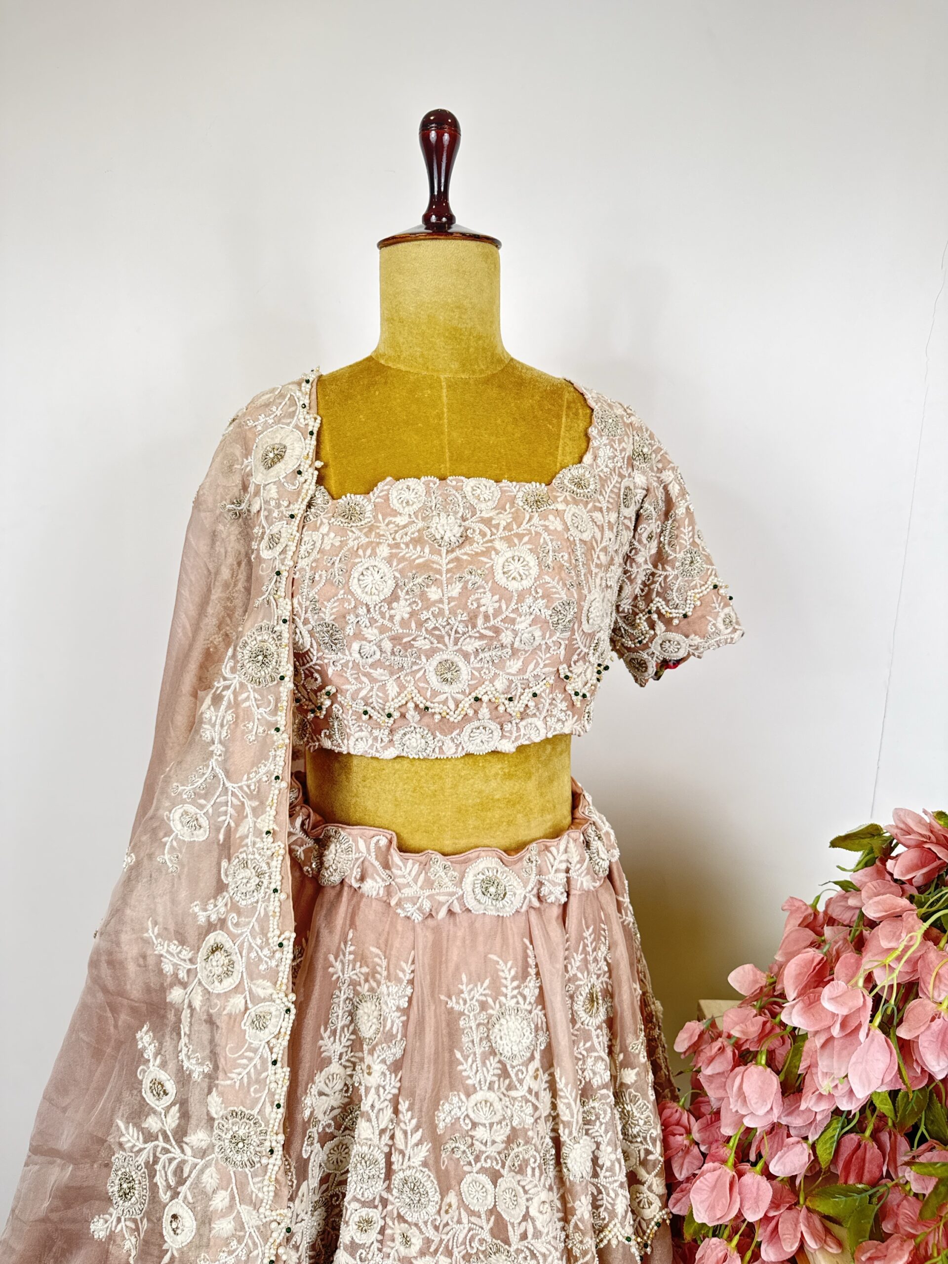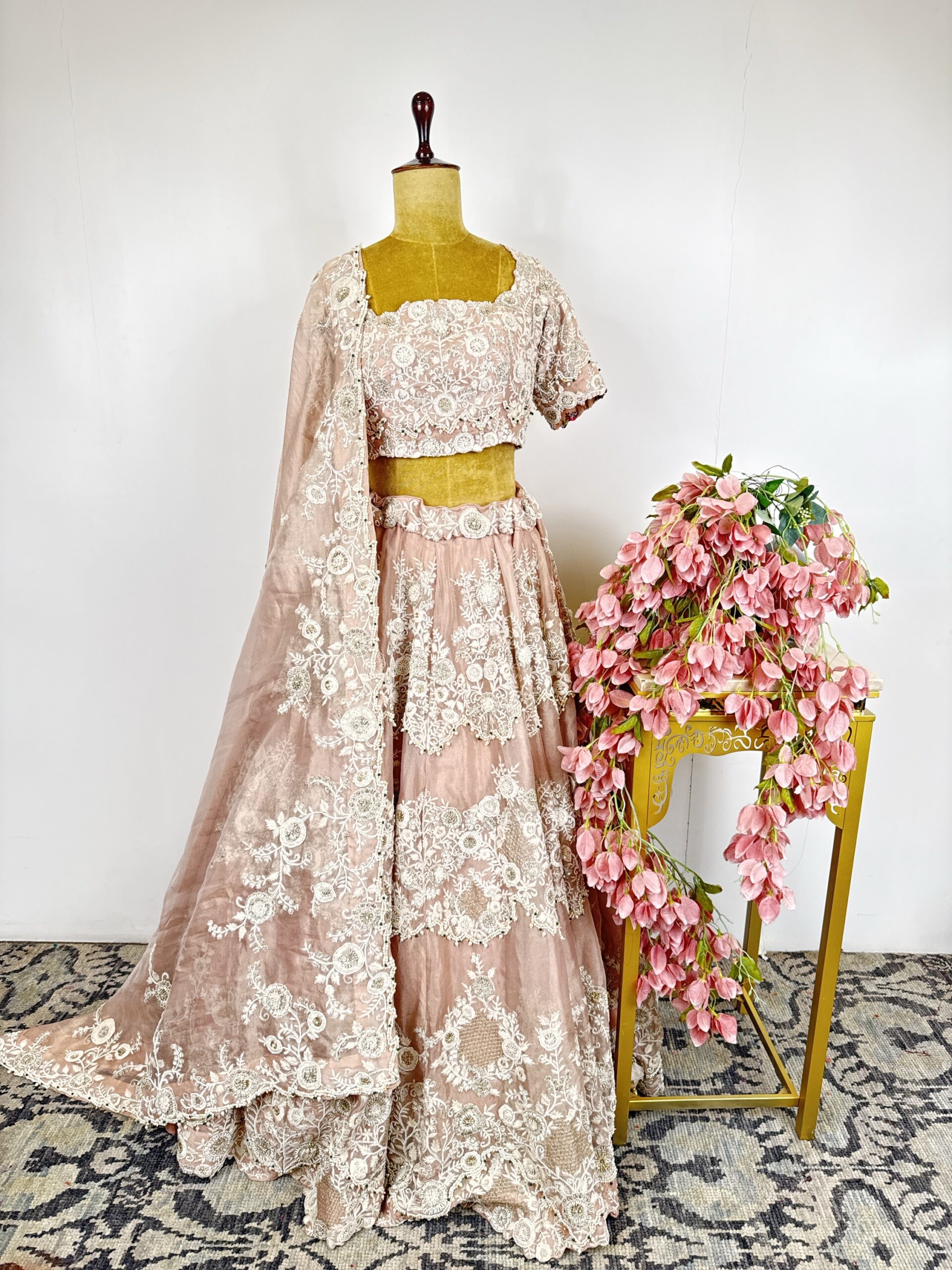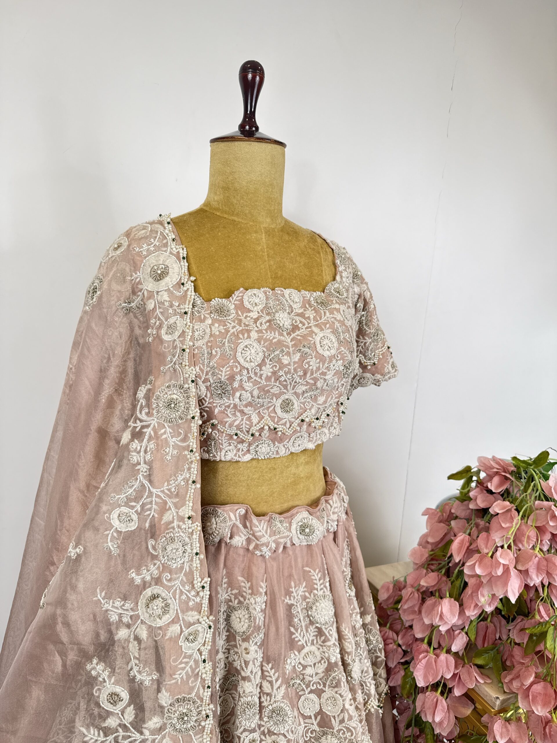 Powder pink colour tissue lehenga with thread embroidery and pearl embellishment with embroidered blouse and paired with dupatta