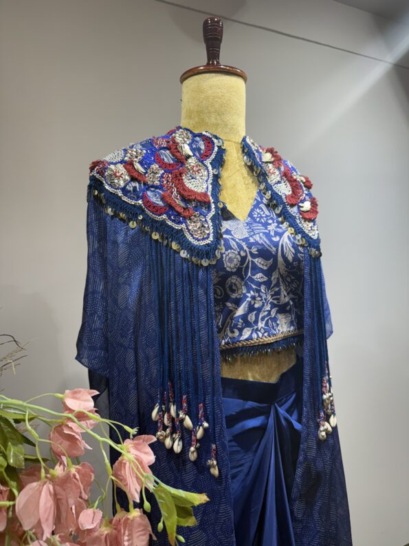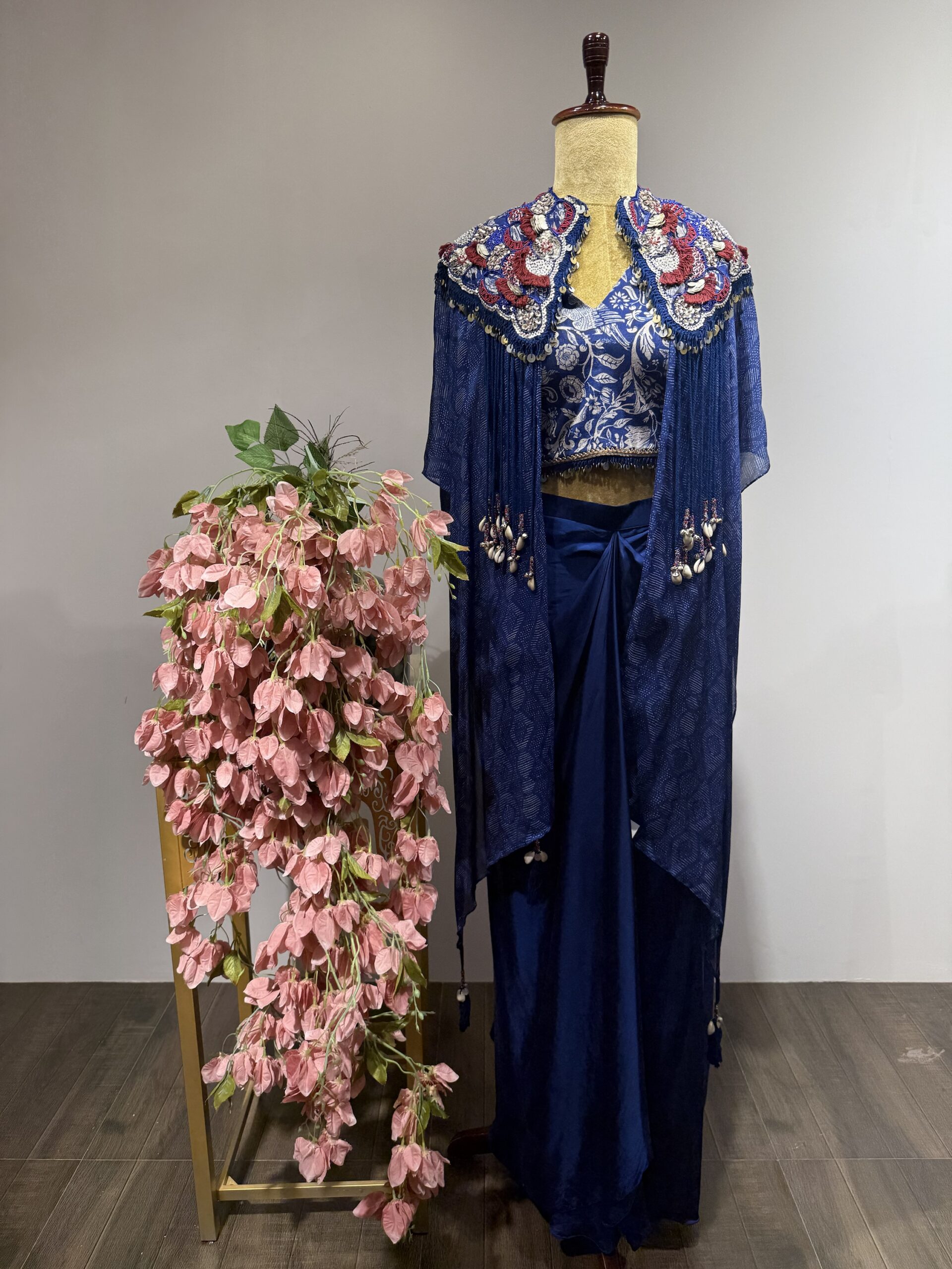 Midnight Muse – Drape Skirt & Tassel Layered Top with Sheer Cape