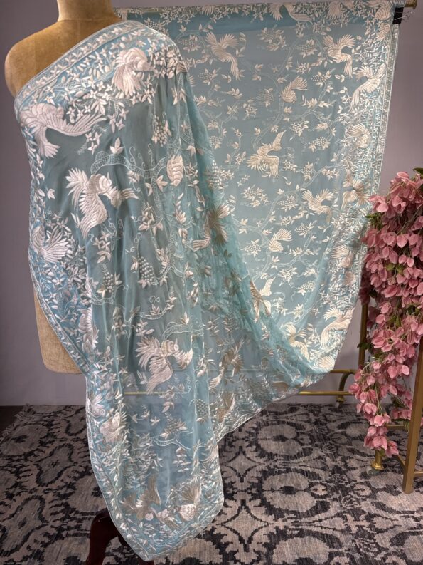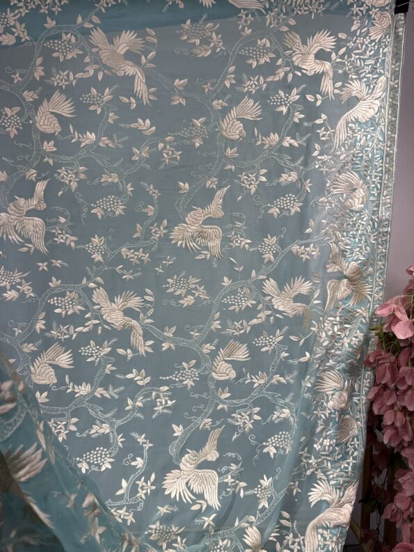 Blue Georgette Parsi Duppatta with floral jal and birds motifs all over duppatta.