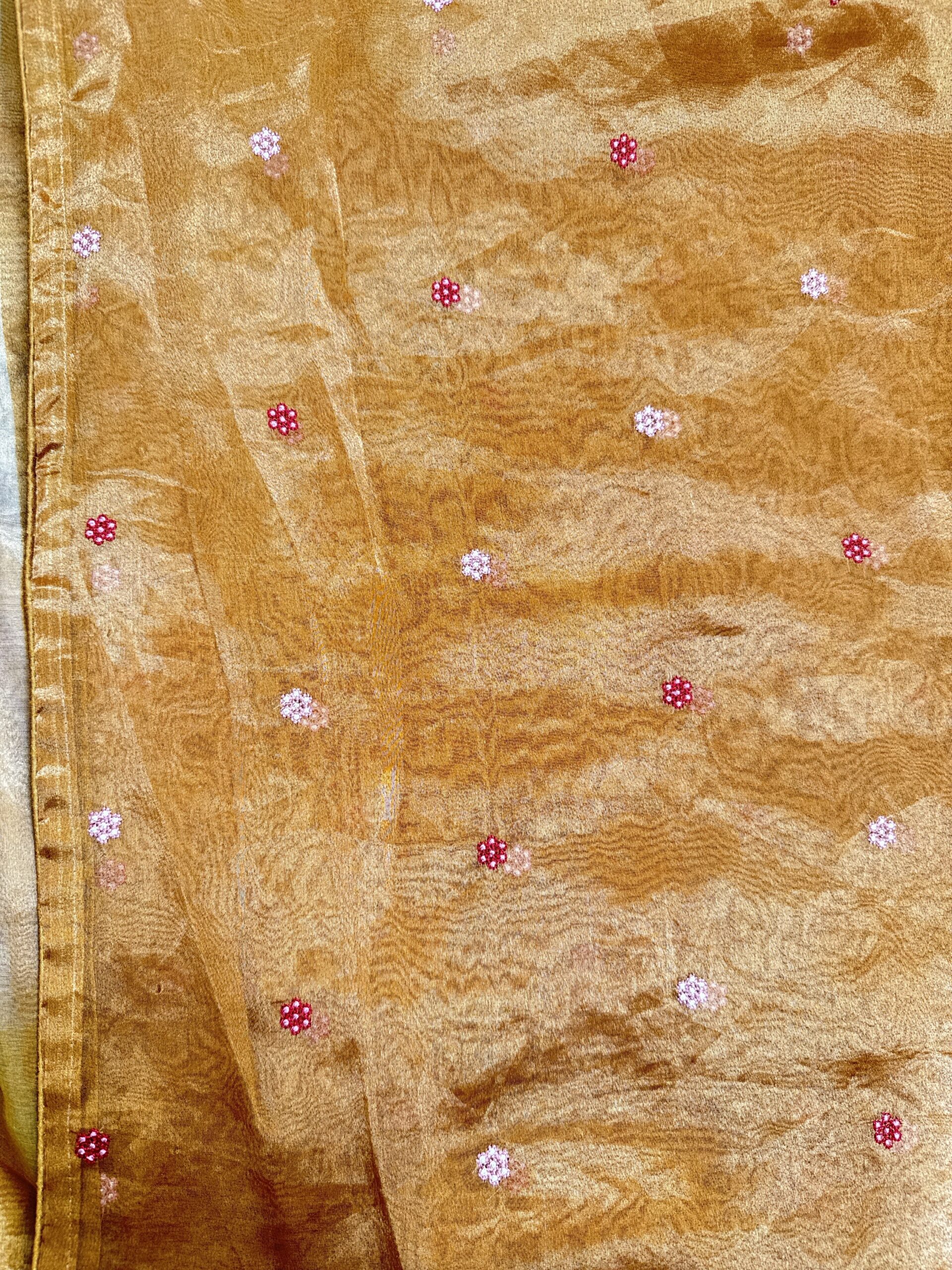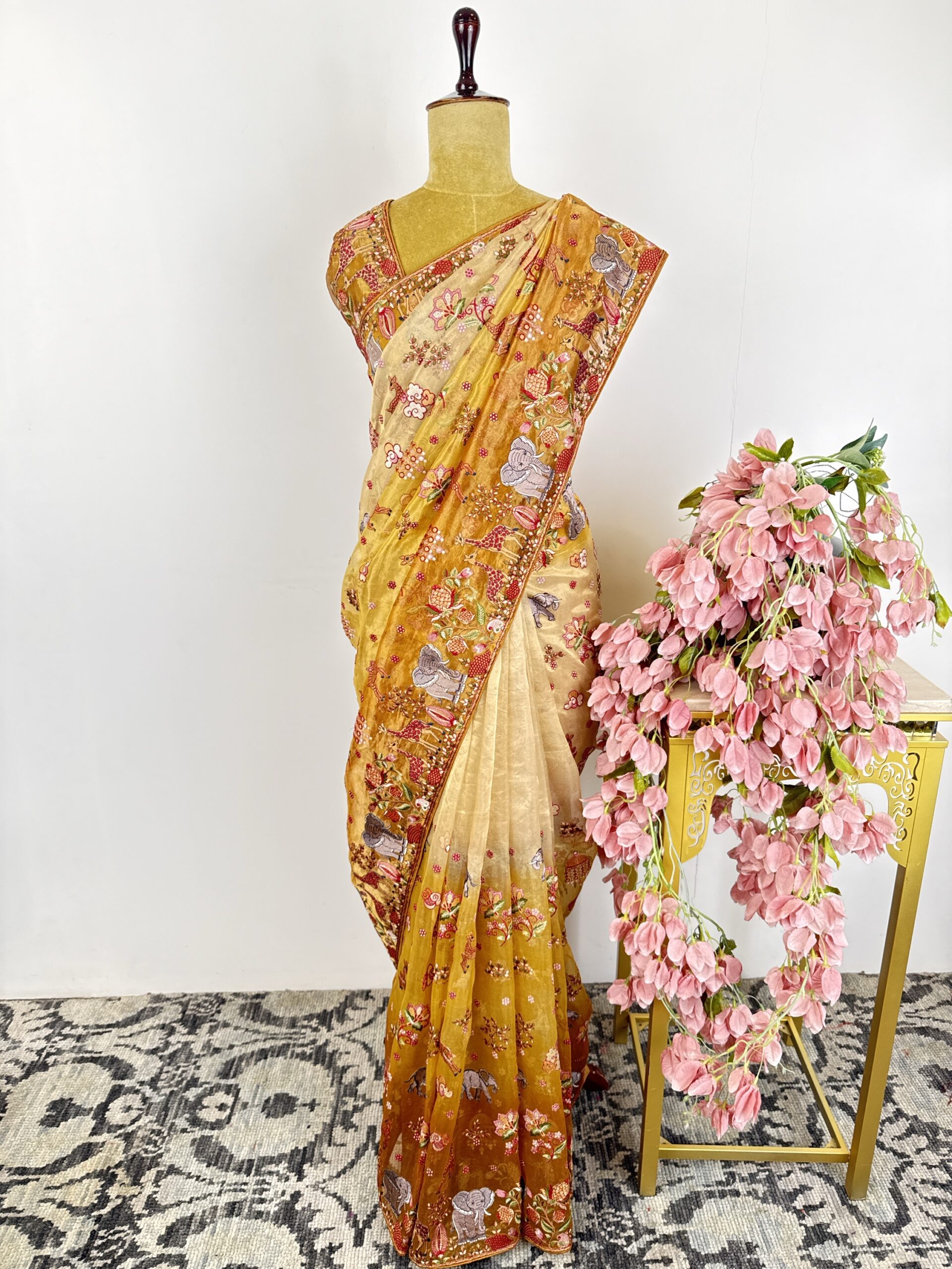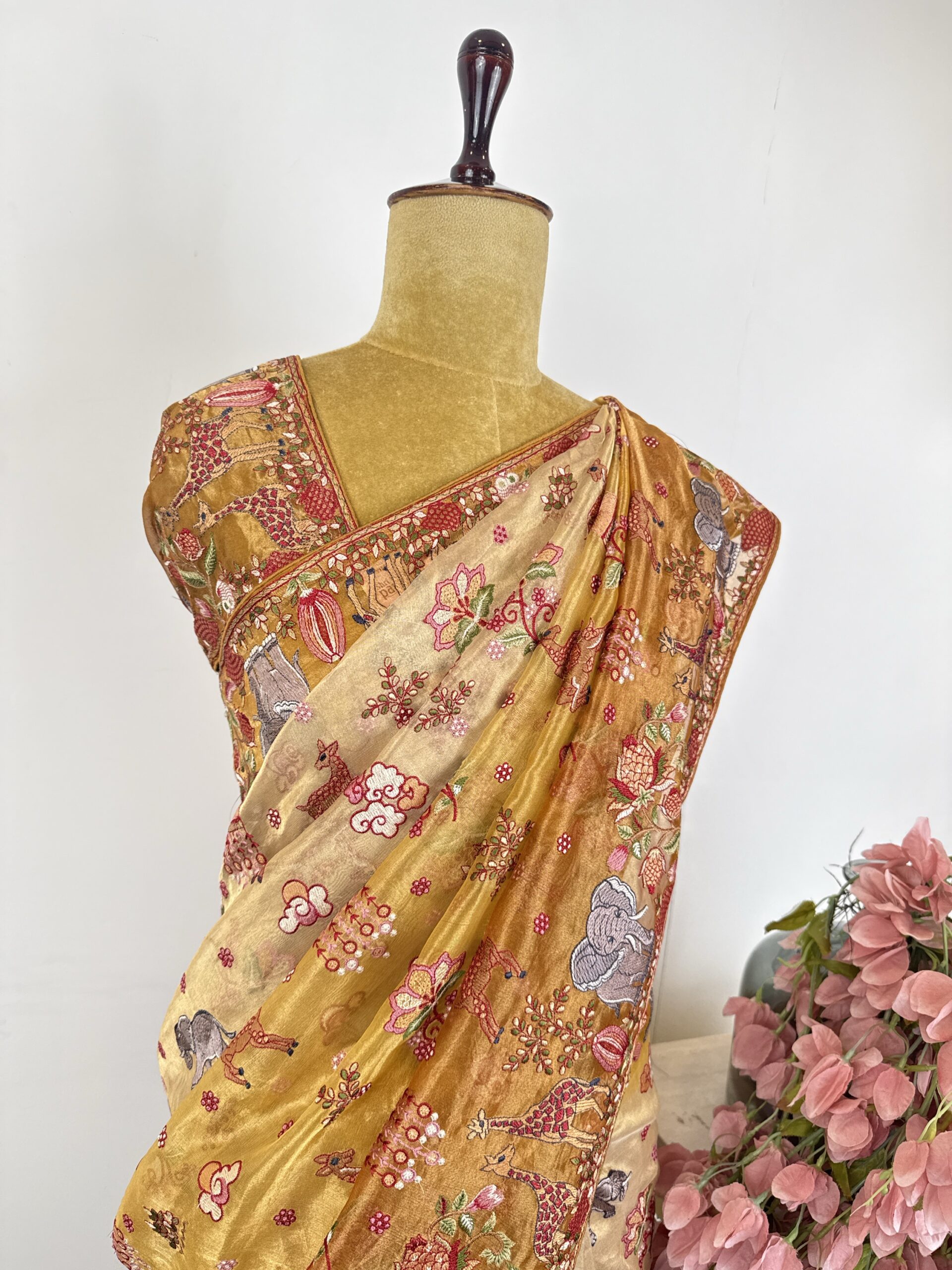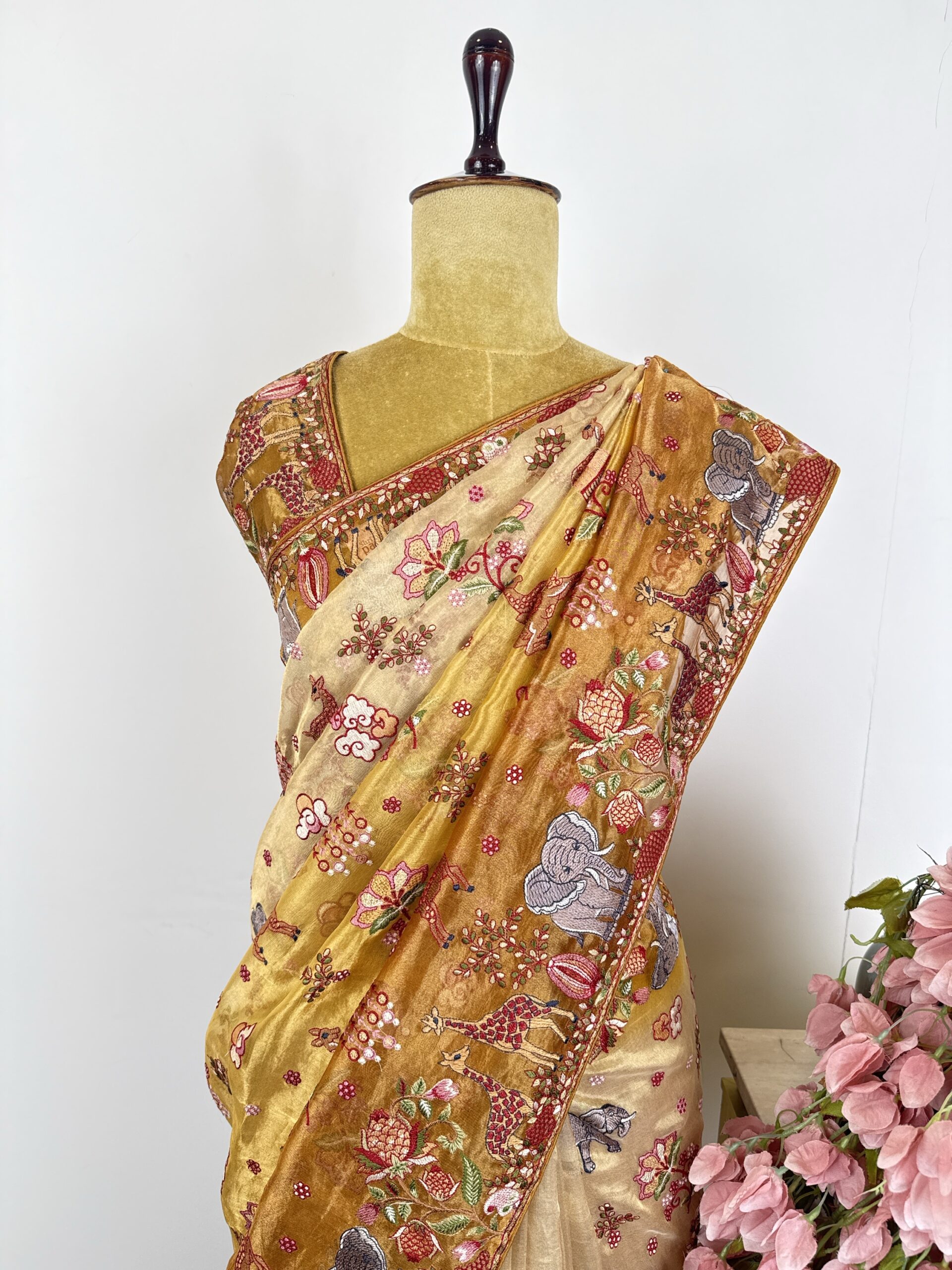 Beige to orange tissue saree with floral and animal motifs detailed with thread embroidery (machine) tissue