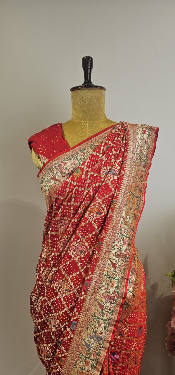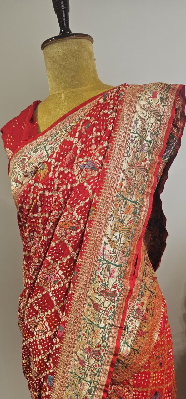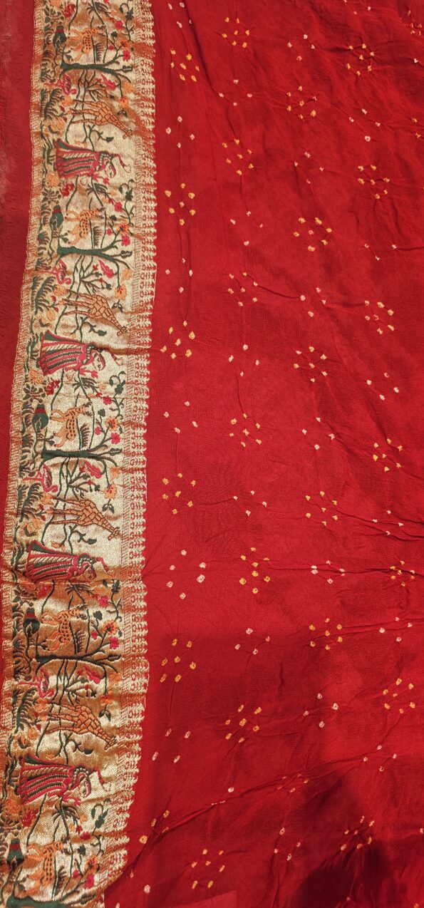 Georgette bandhani saree with all over jal weaving with meenakari and elephant motifs and a magnificent pallu and border comes with dancing dolls motifs.