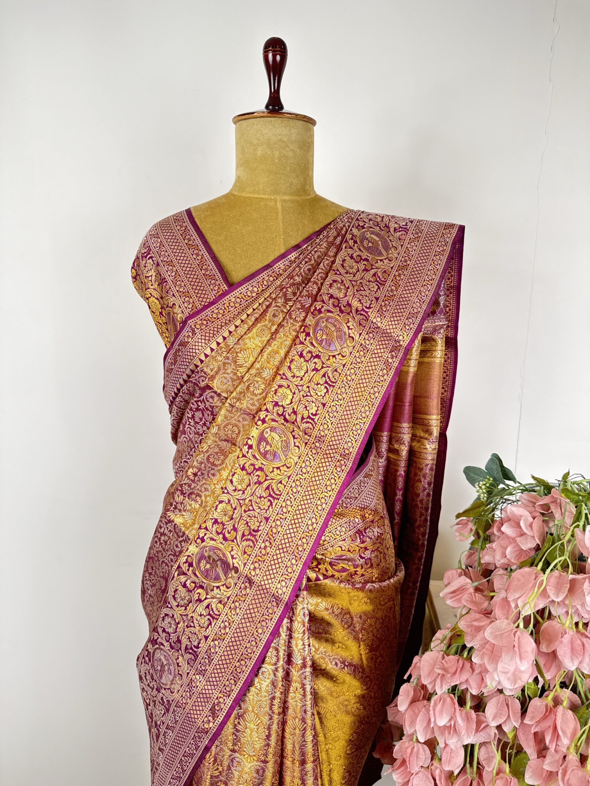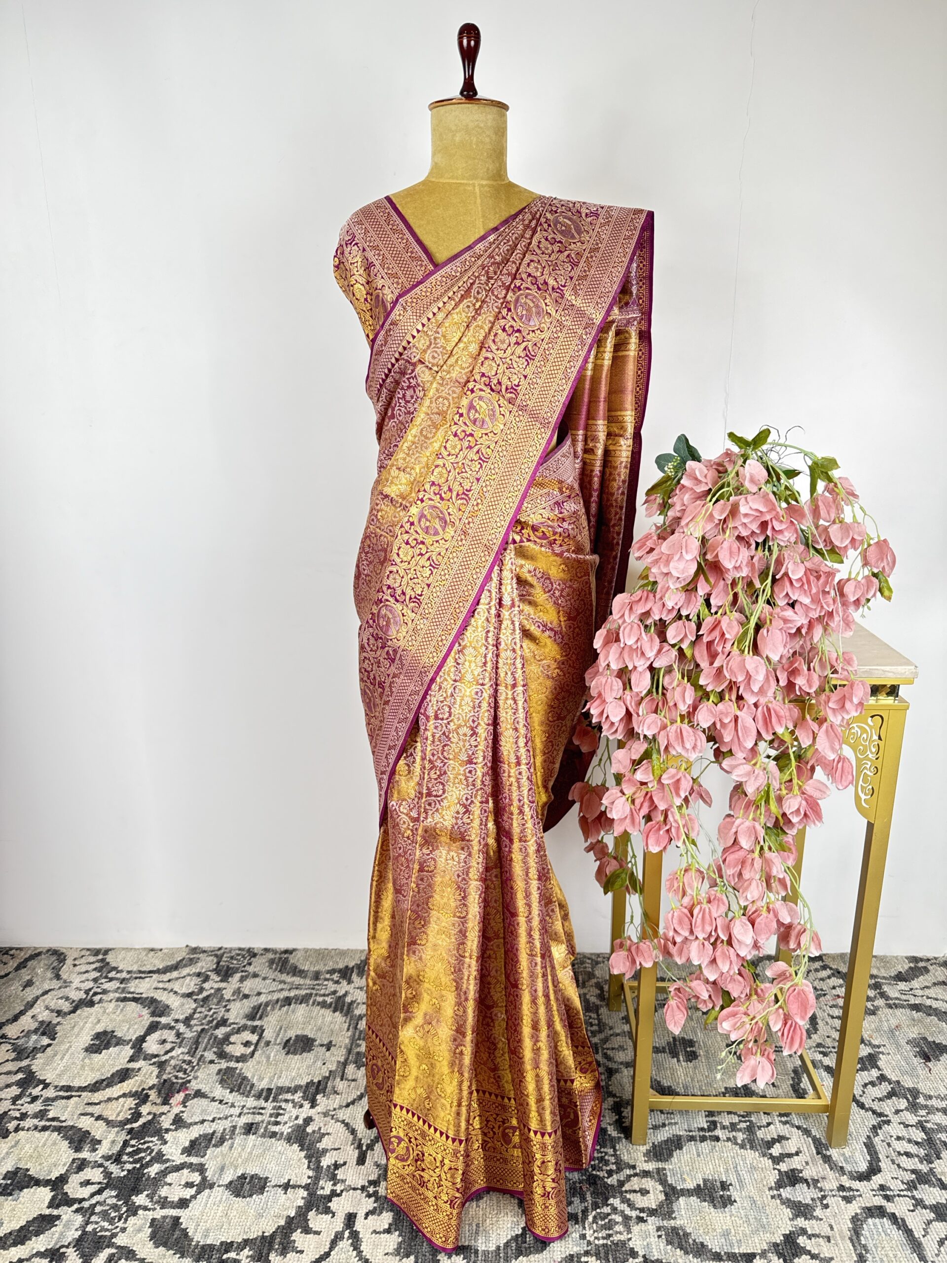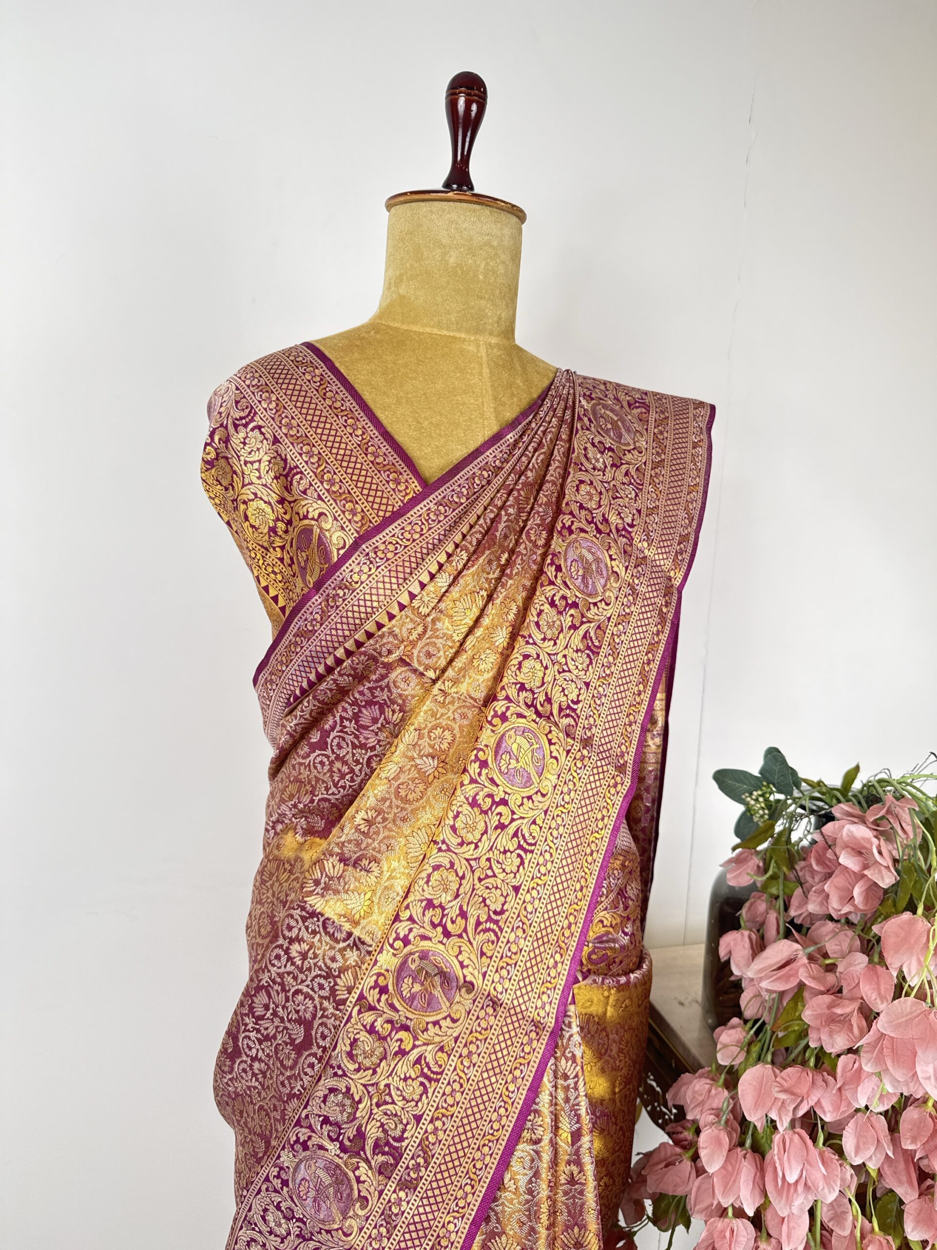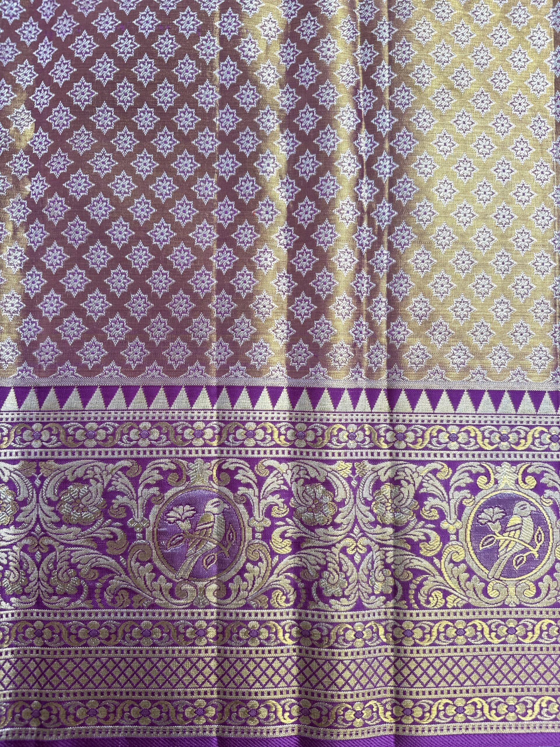 Purple and gold colour Kanchi saree with floral motifs all over the saree and birds motifs in the border