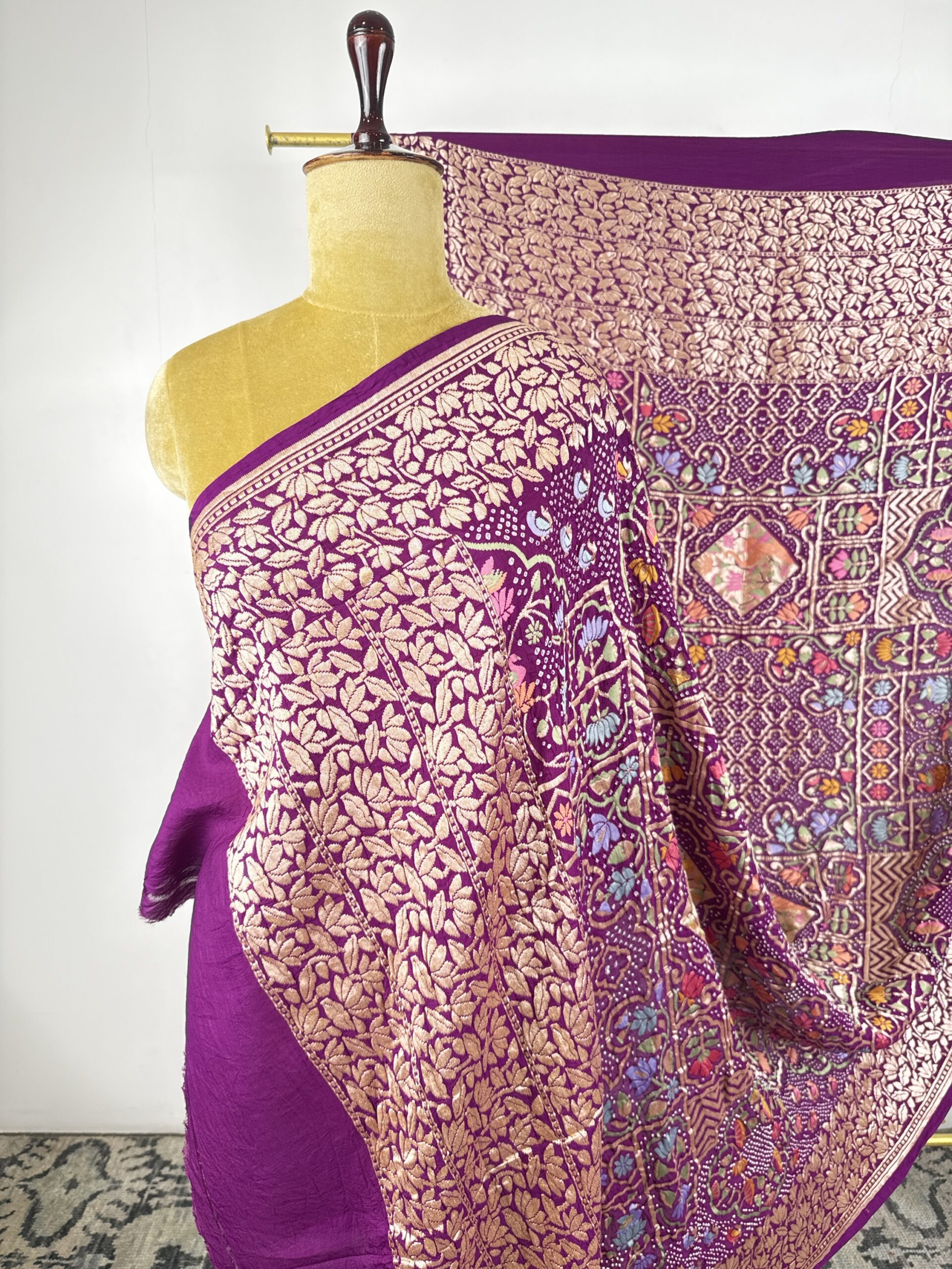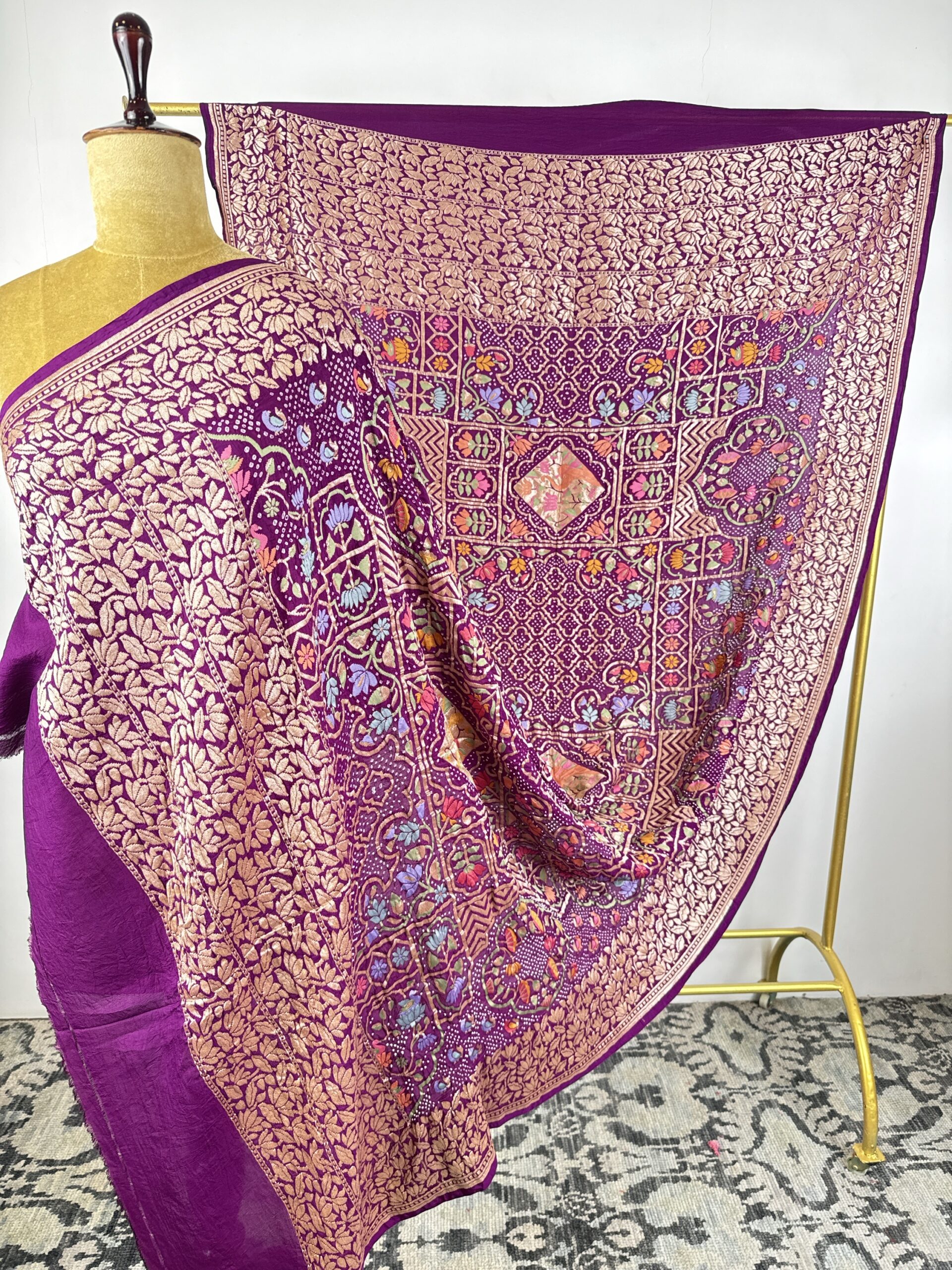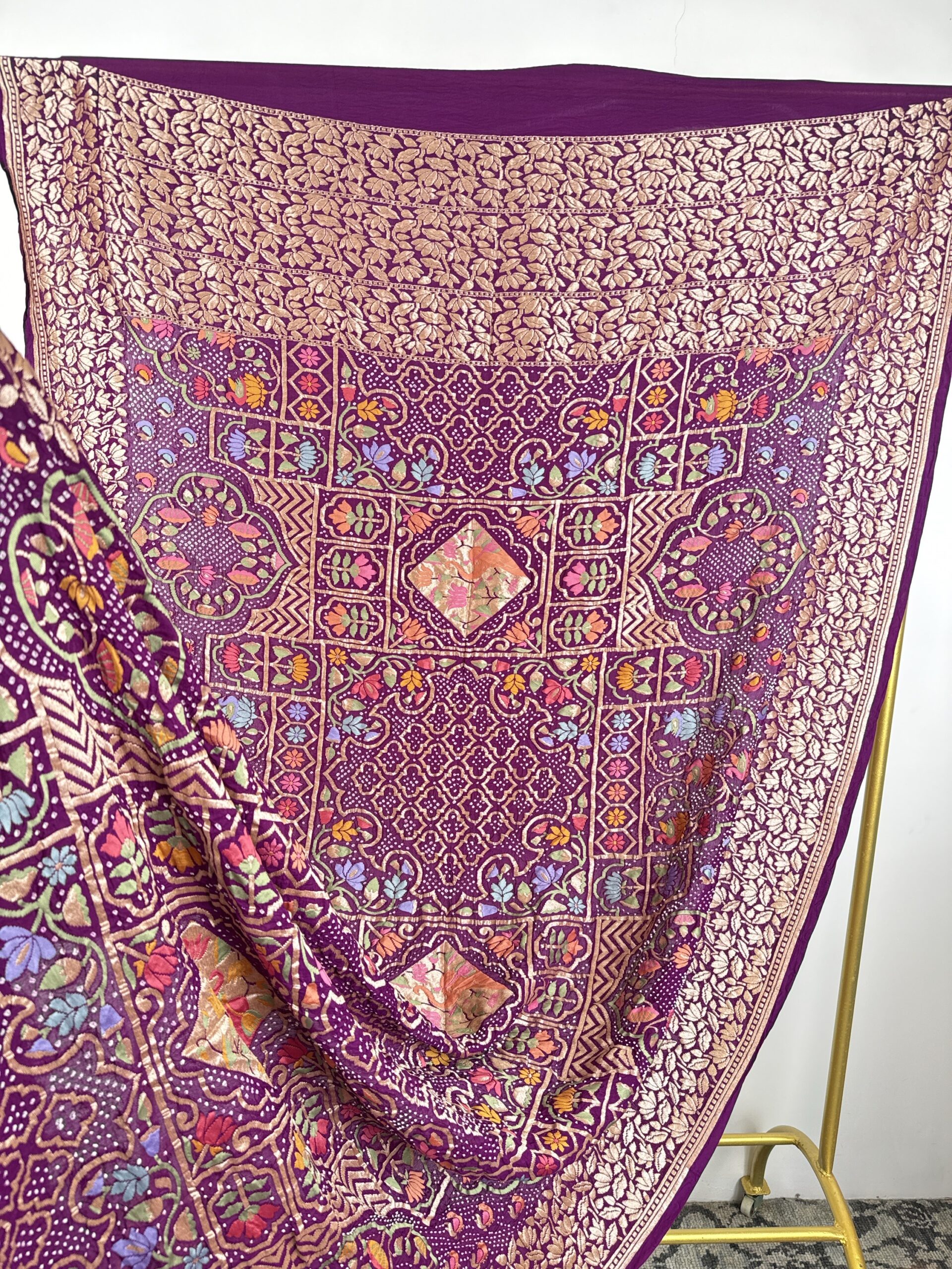 Purple colour bandhani dupatta with. Floral and elephants motifs detailed with meenakari and gold zari on silk
