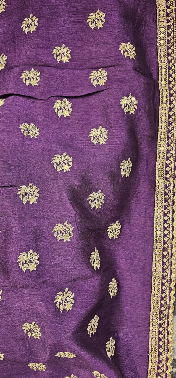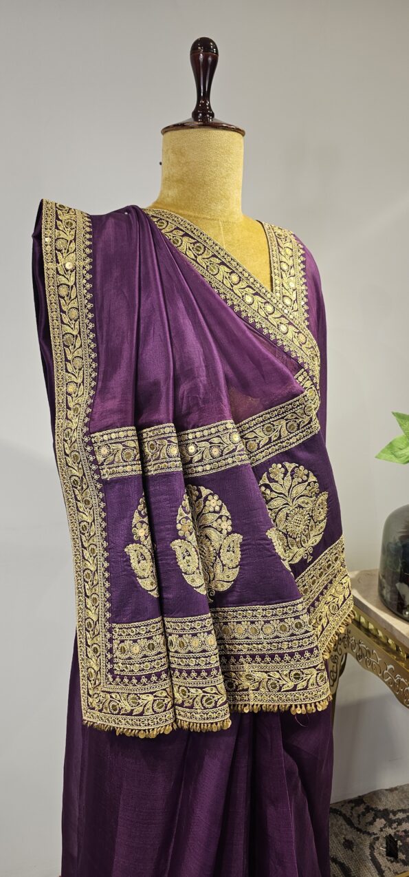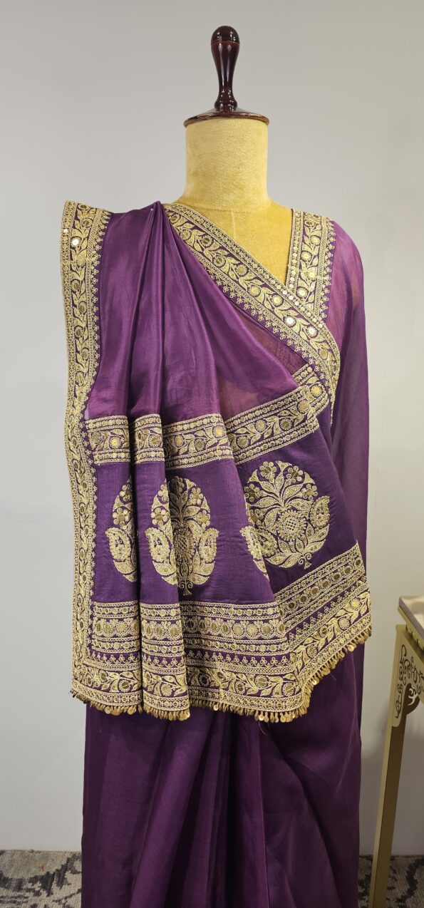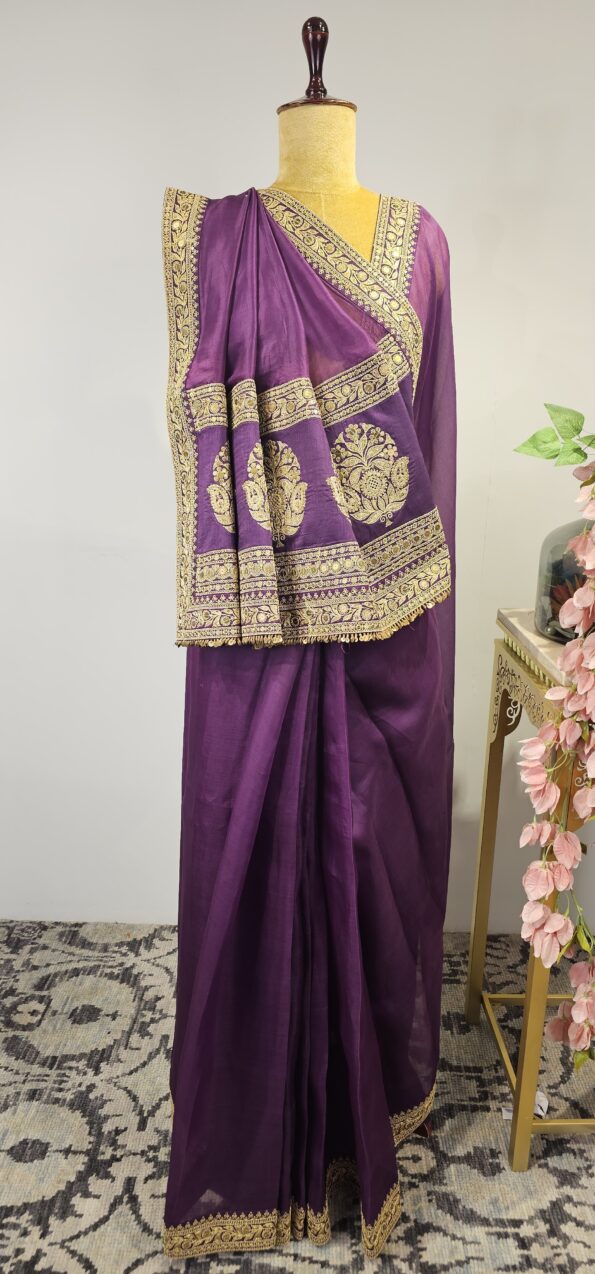 Purple colour organza saree with beautiful dori work floral embroidery on the palla and blouse and with border all over the saree