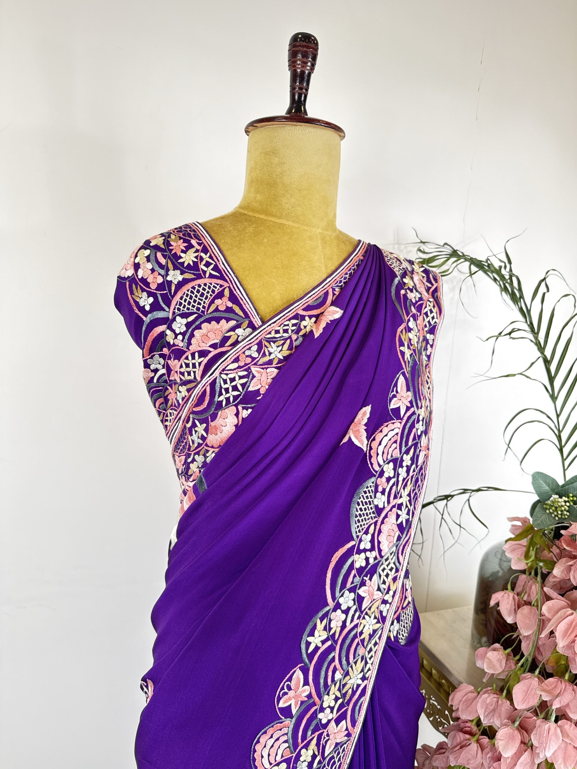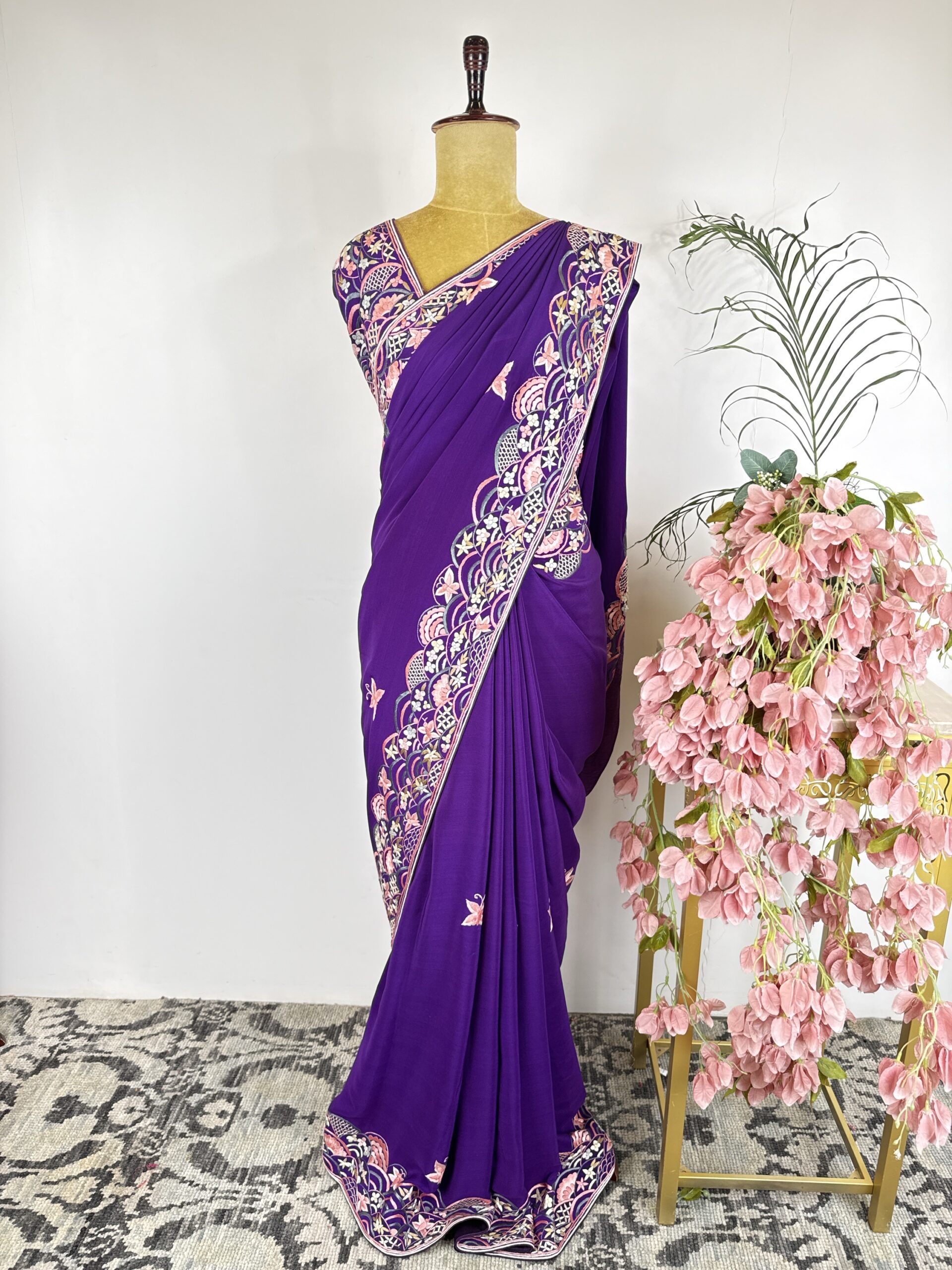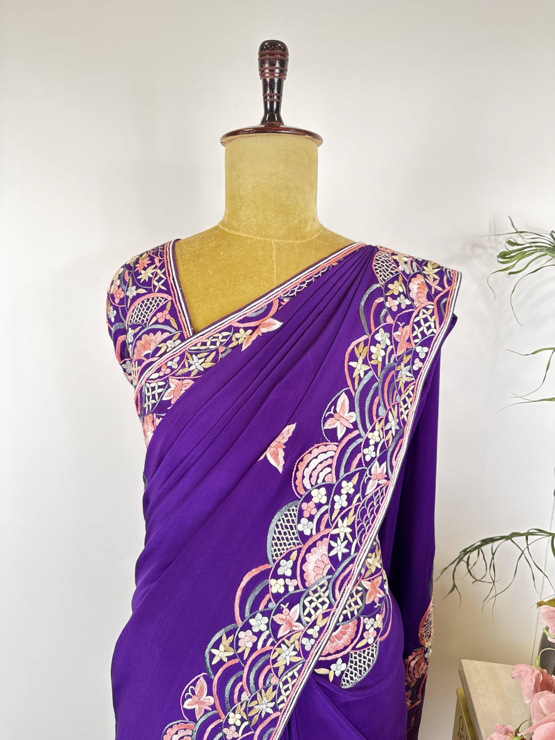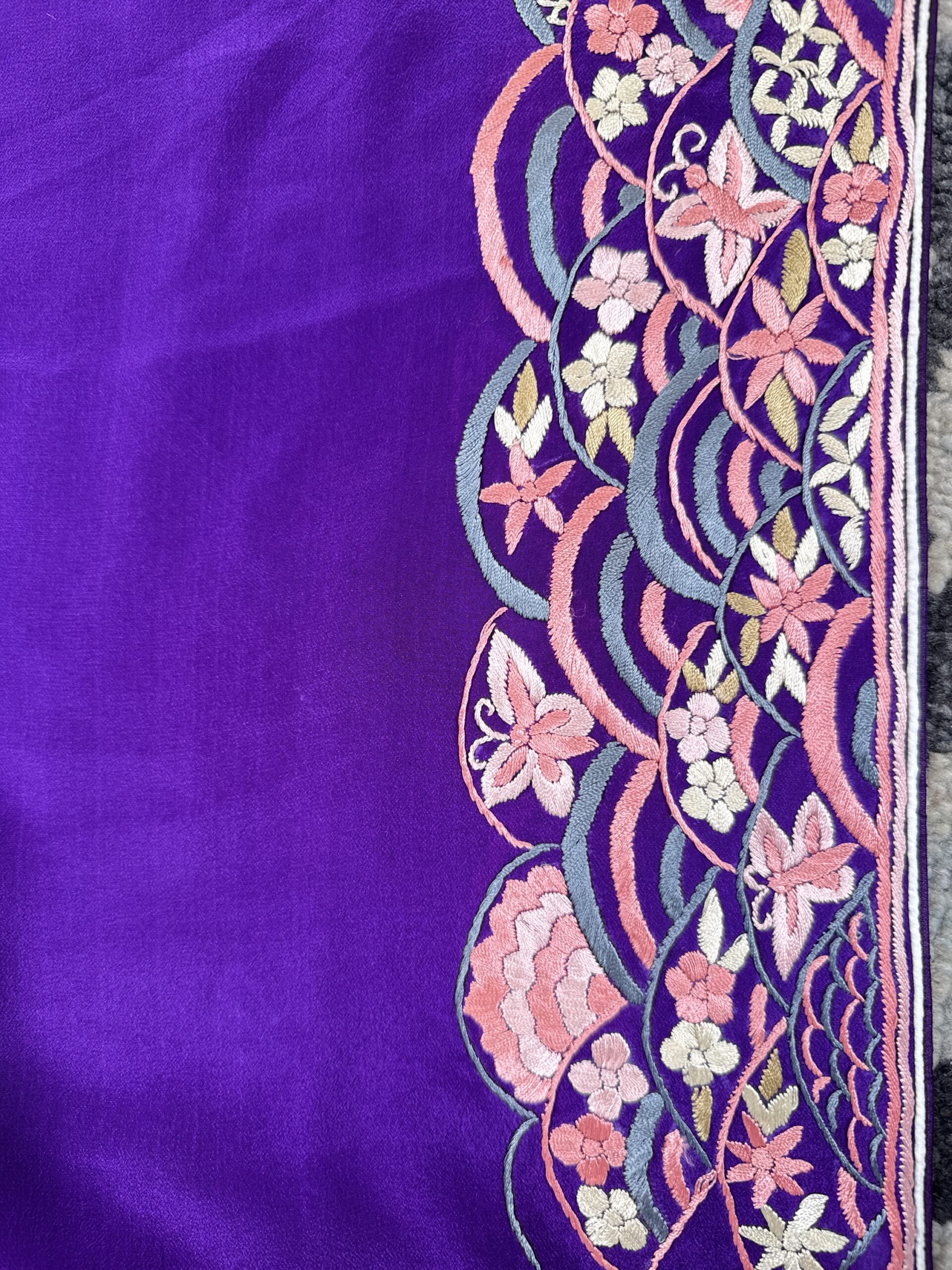 Purple colour Parsigara saree with floral and butterflies motifs detailed with multicolour threads on Georgette
