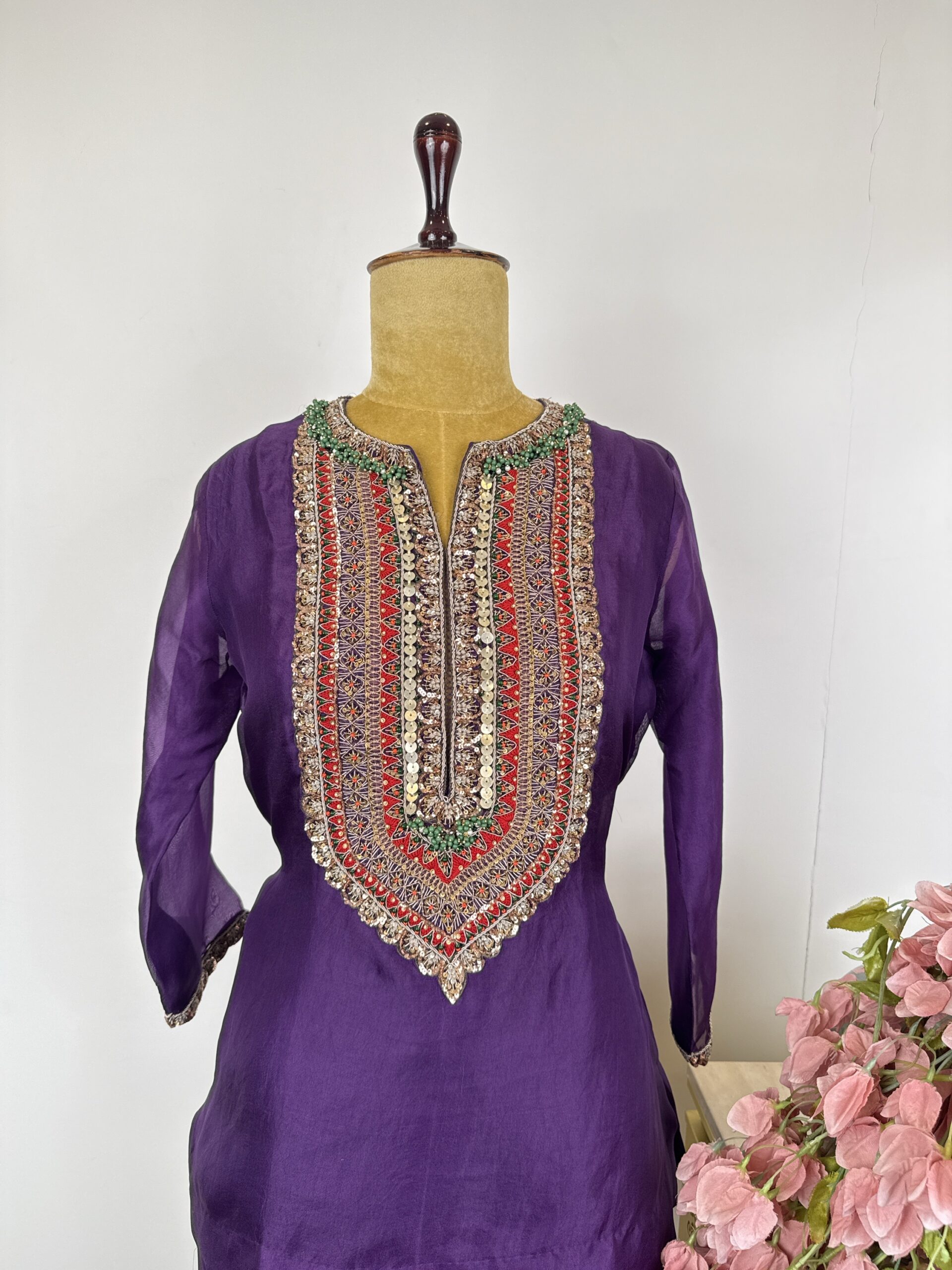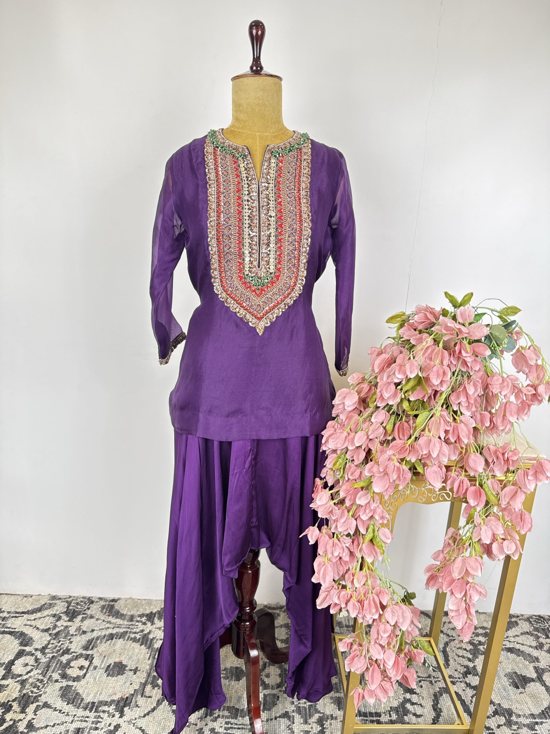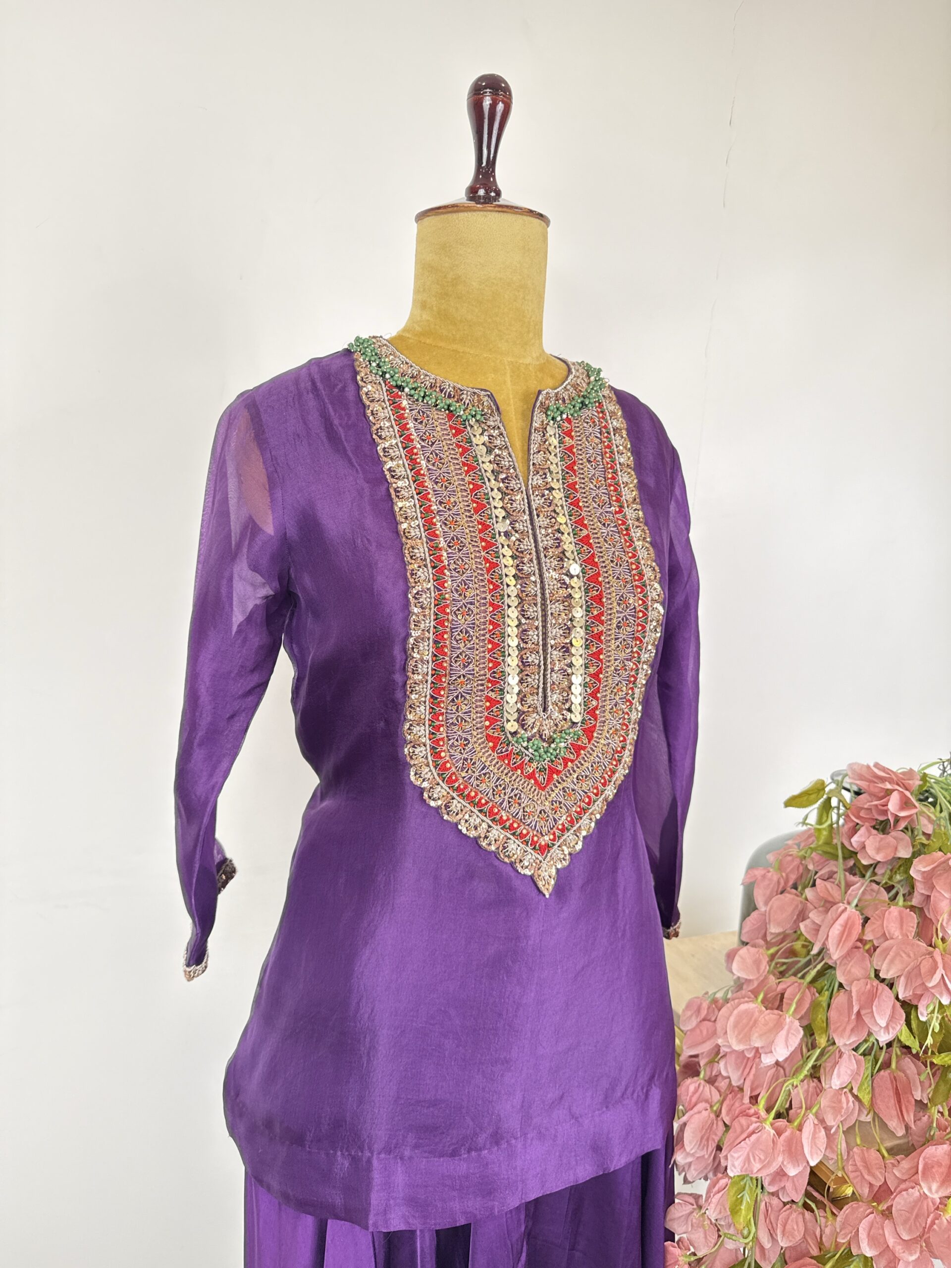 Purple colour short top with harem pants with embroidered neckline detailed with Zardosi,sequins and beads work on organza