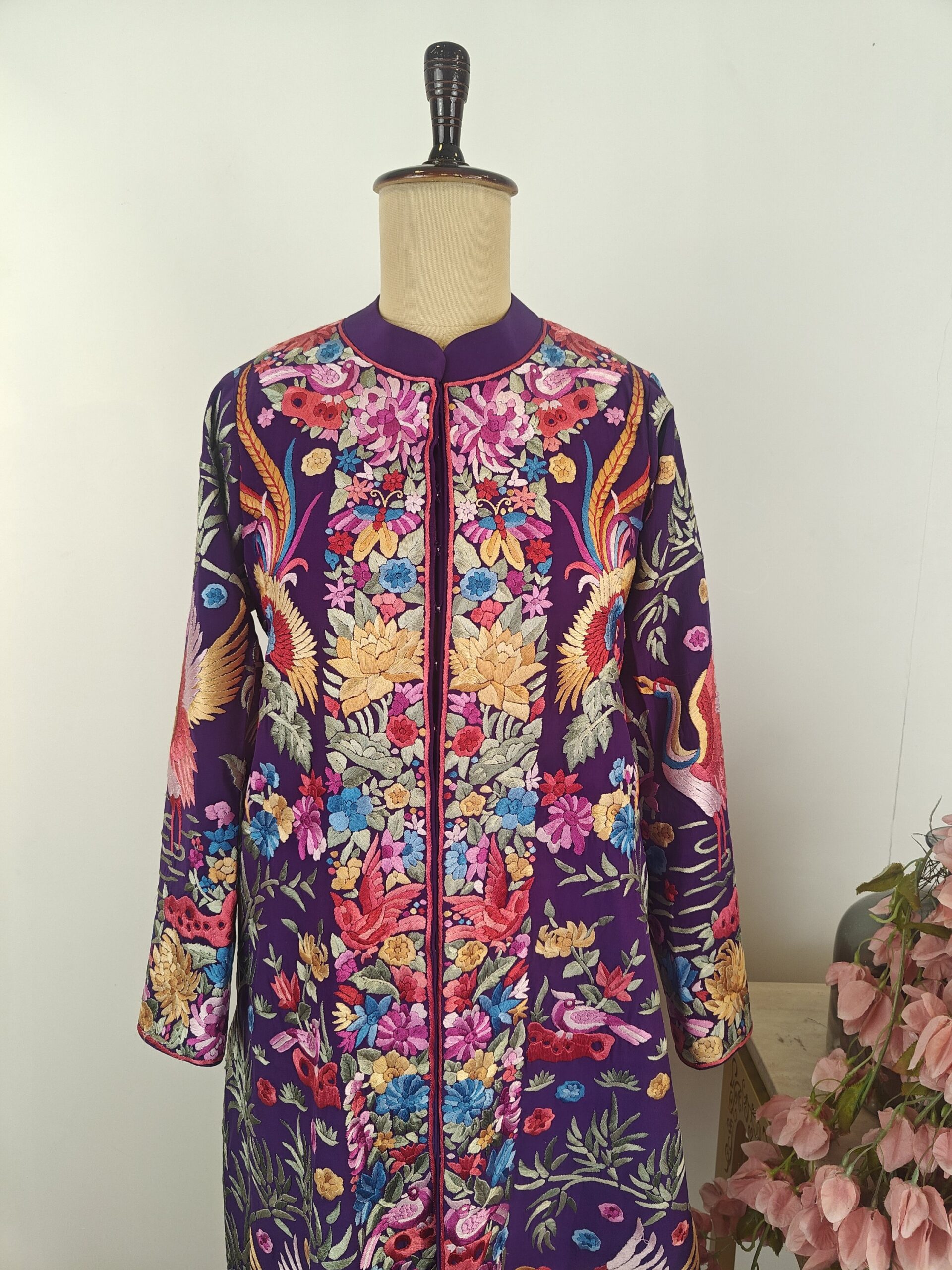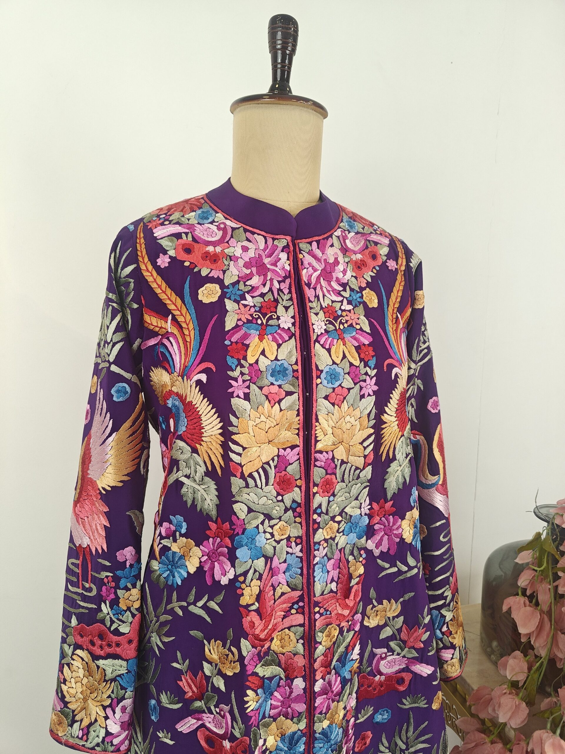 Purple georgette parsi jacket with birds and floral motifs hand embroidered with mutli color threads