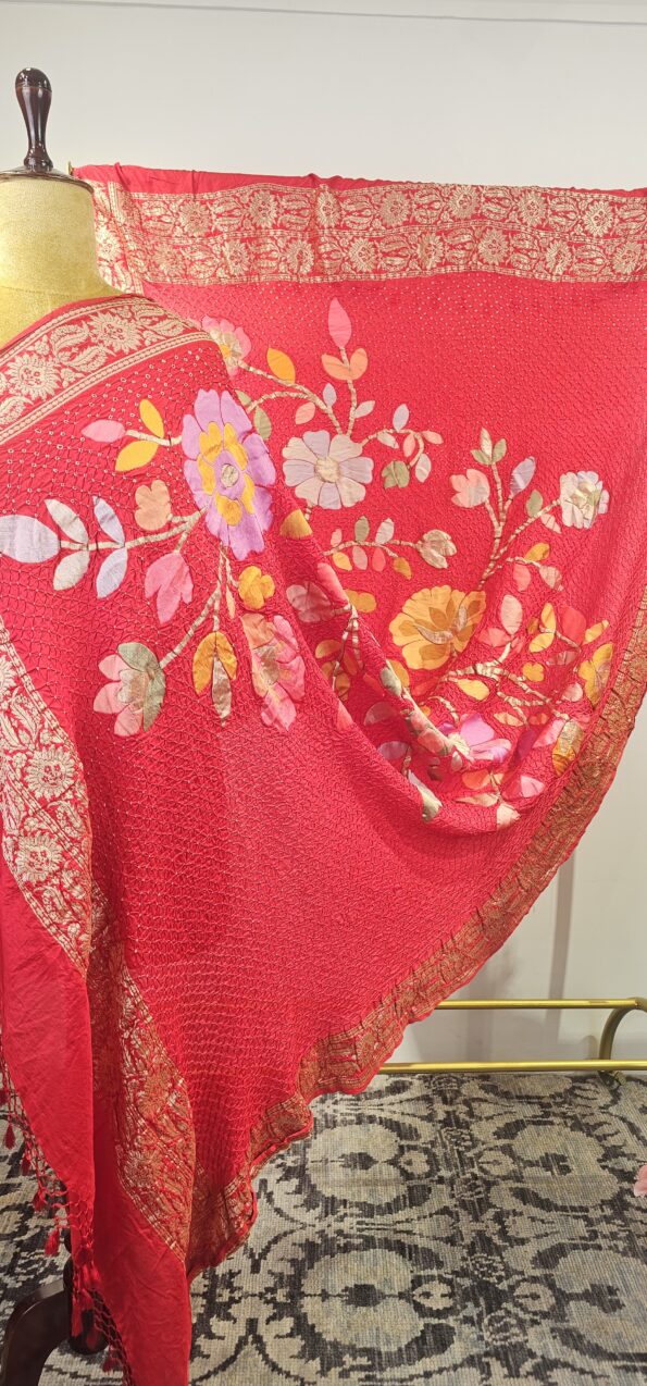 Red Bandhani silk Dupatta with zari weaving (odhana).