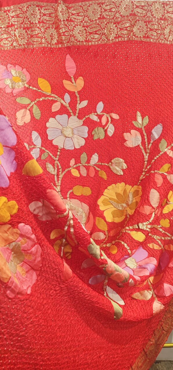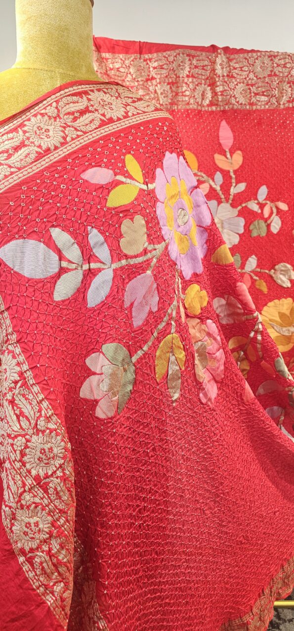 Red Bandhani floral with complete zari and meenakari weaving all over the dupatta. (Odhana)