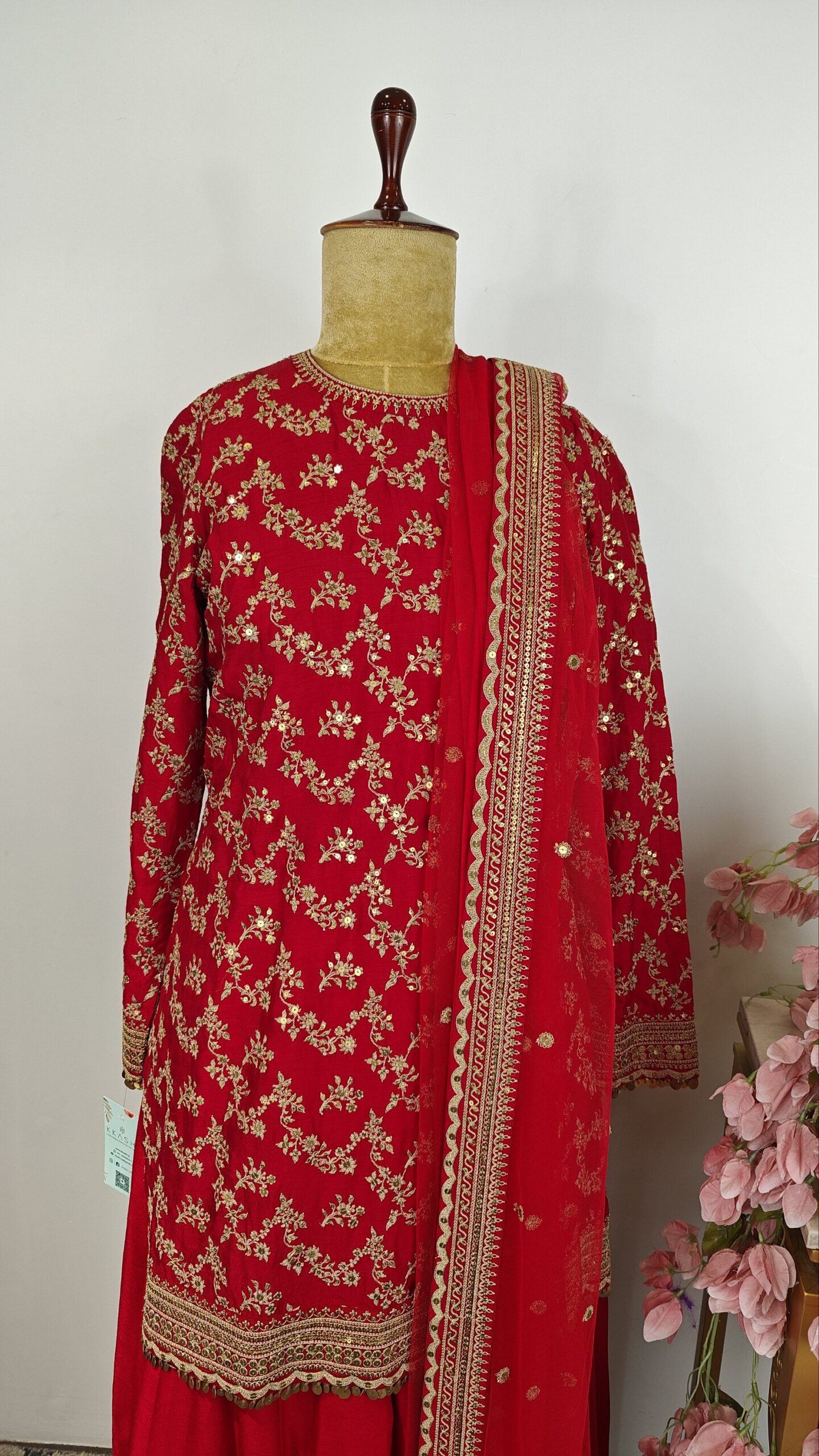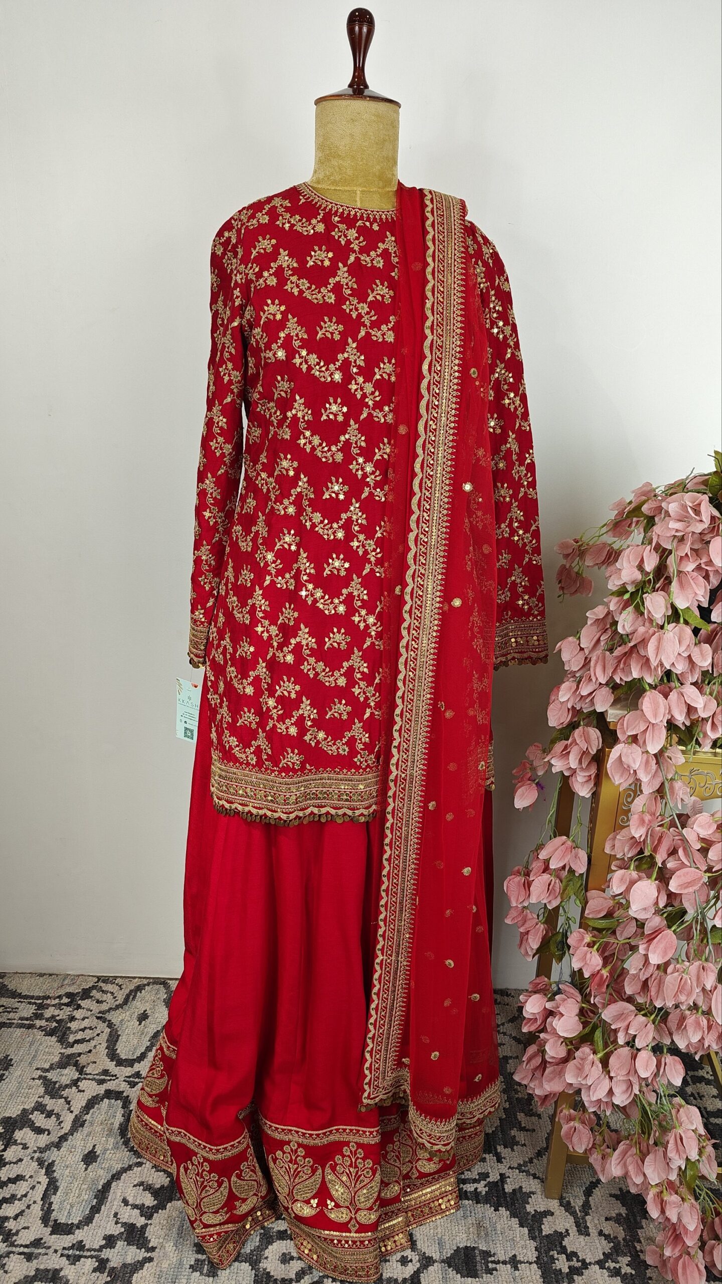 Red color sharara set comes with top, pants and net dupatta and top has beautiful hand done dori work with sequence and bottom has border and duppata has border