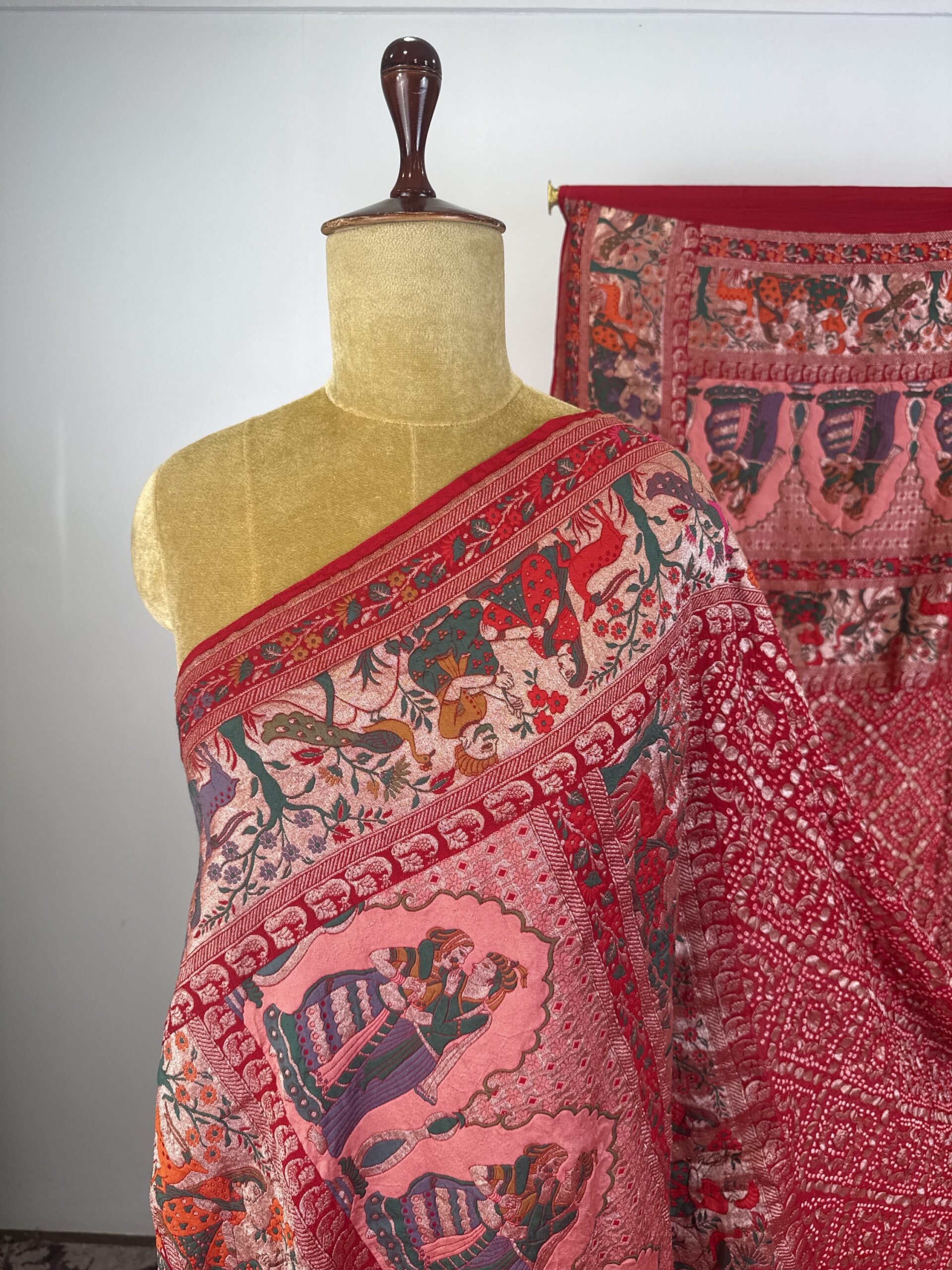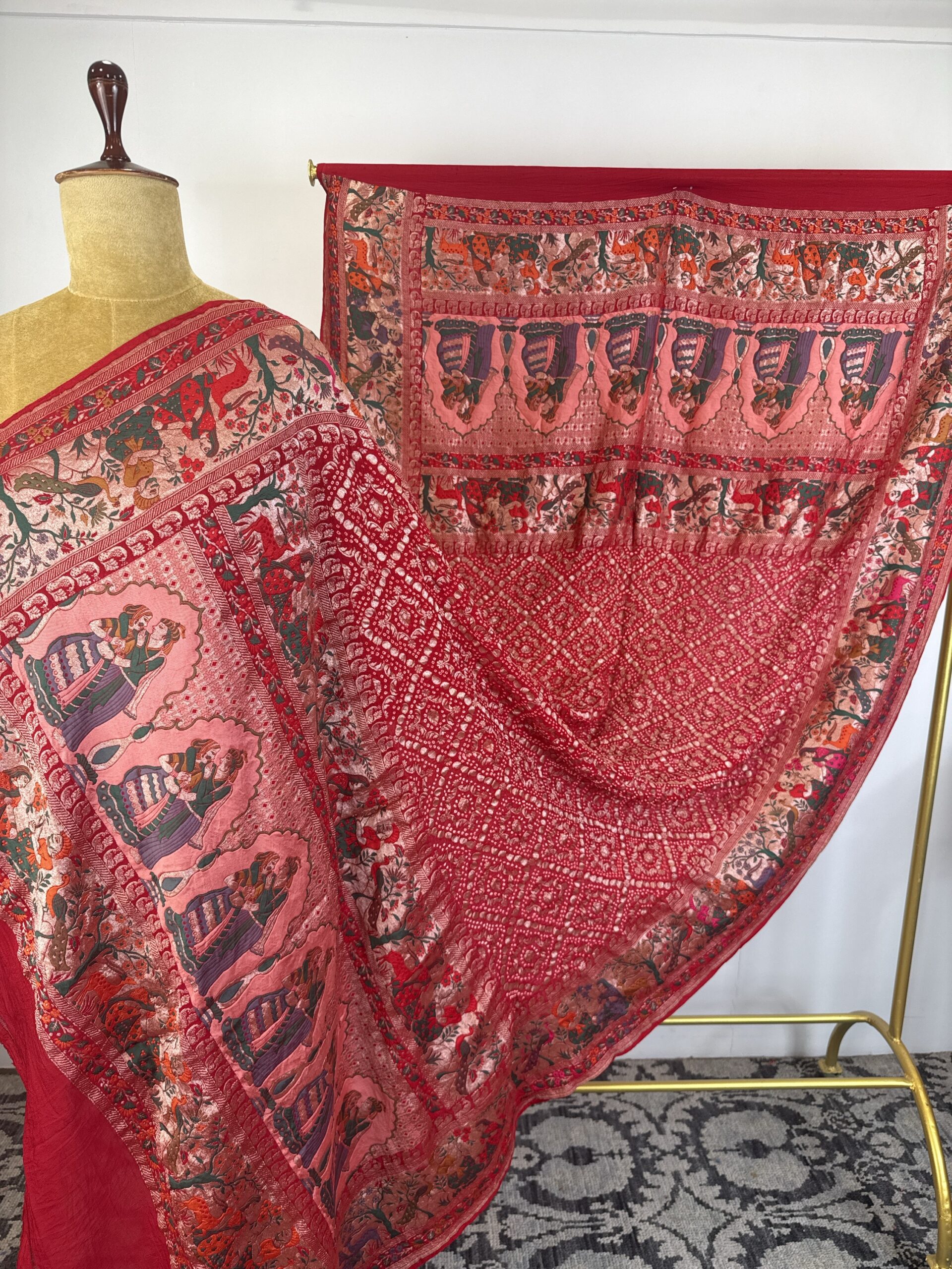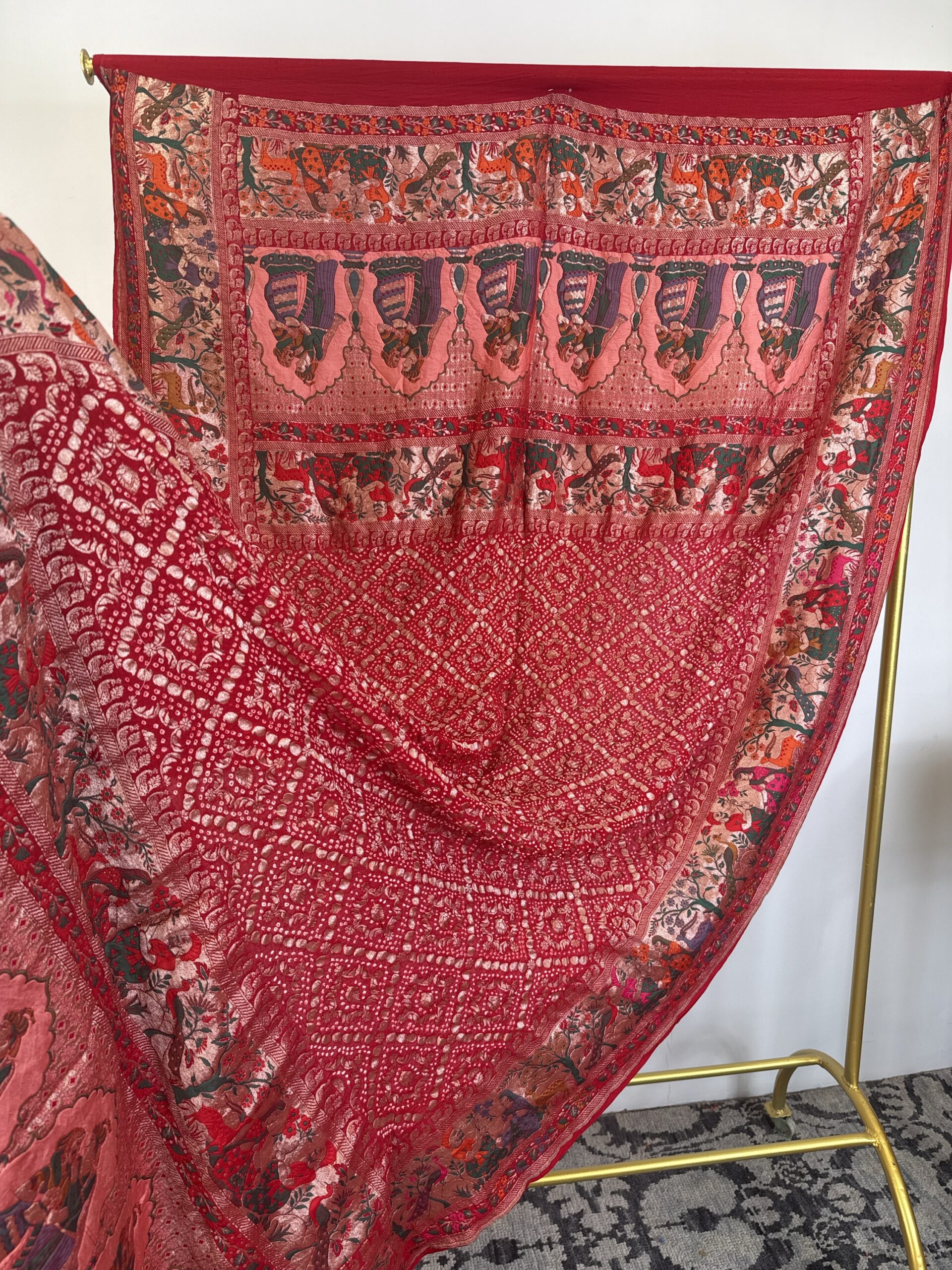Red colour bandhani dupatta with raja rani concept and detailed with meenakari and gold zari