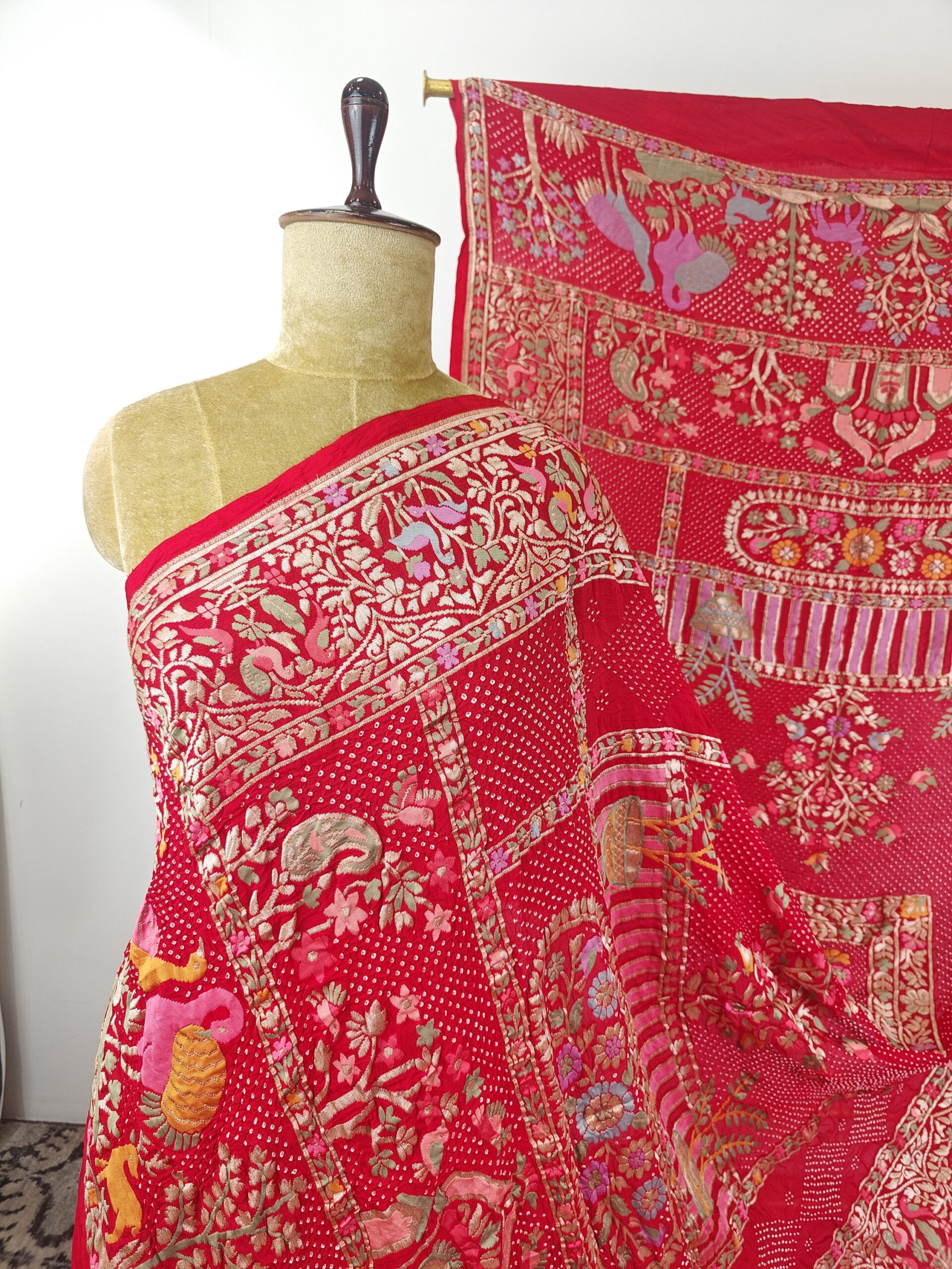 Red colour bandhani dupatta with floral motifs and birds motifs detailed with meenakari and gold zari on georgette