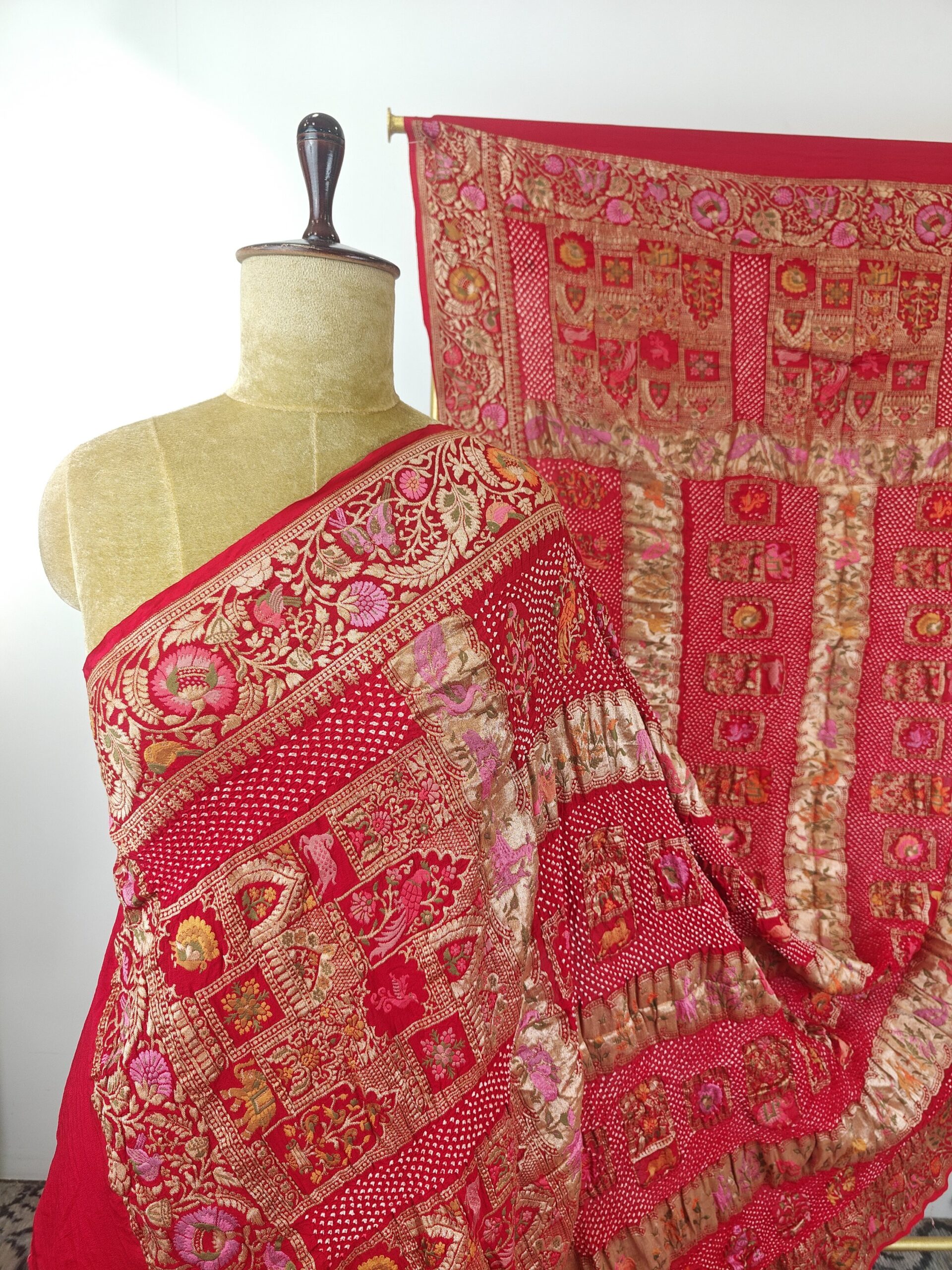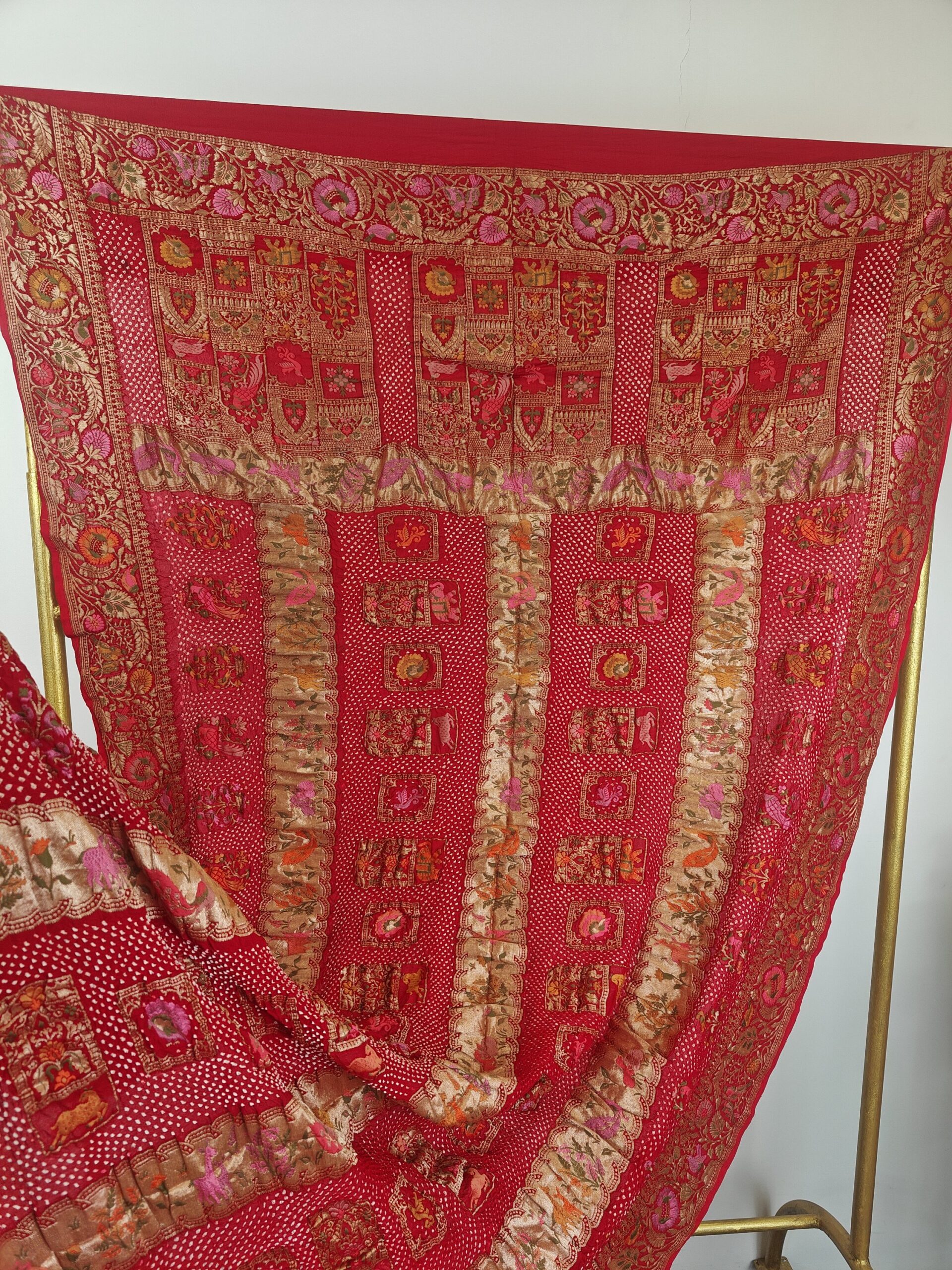 Red colour bandhani dupatta with floral and animal, birds motifs in geometric figures detailed with meenakari and gold zari on georgette