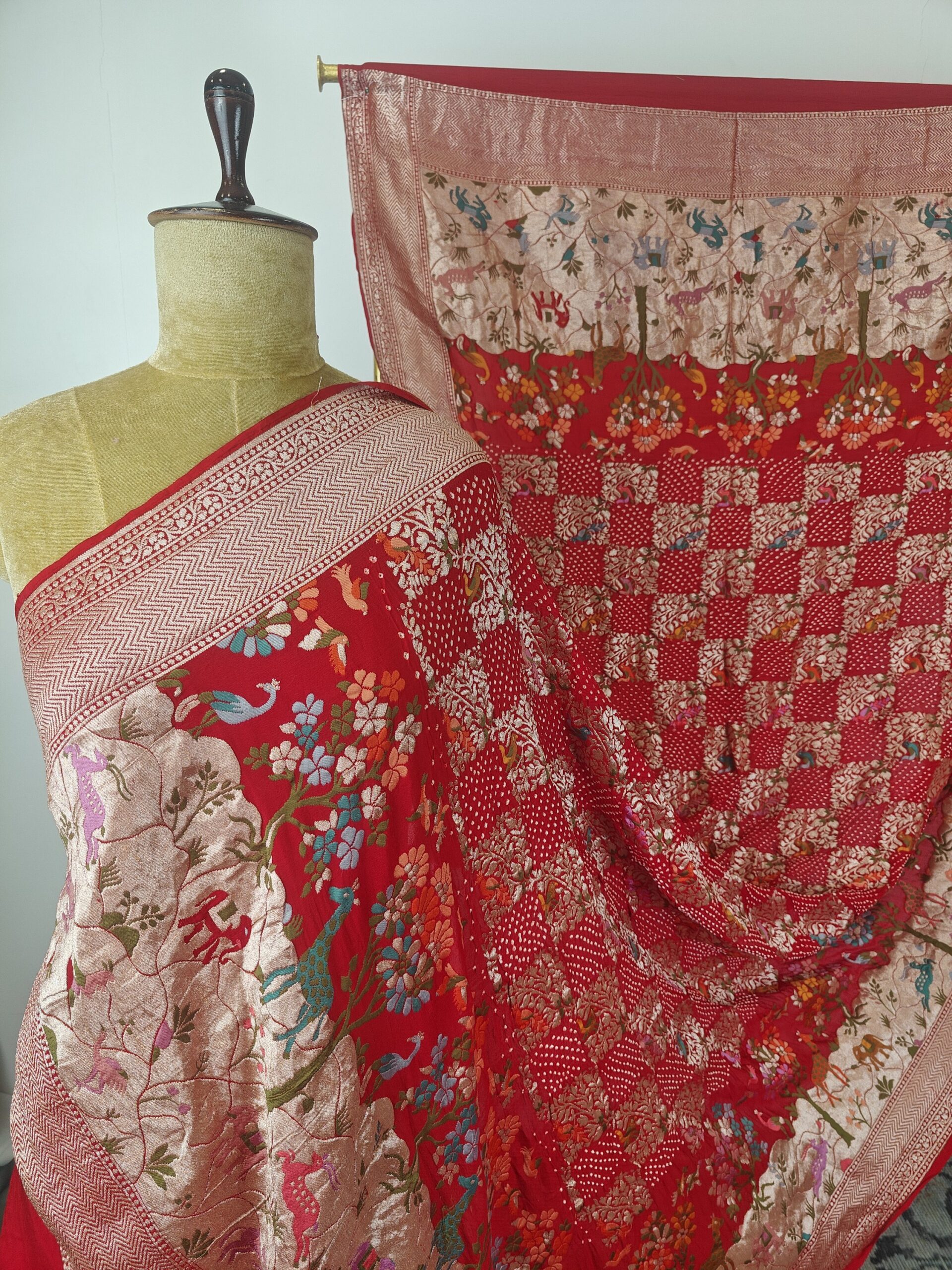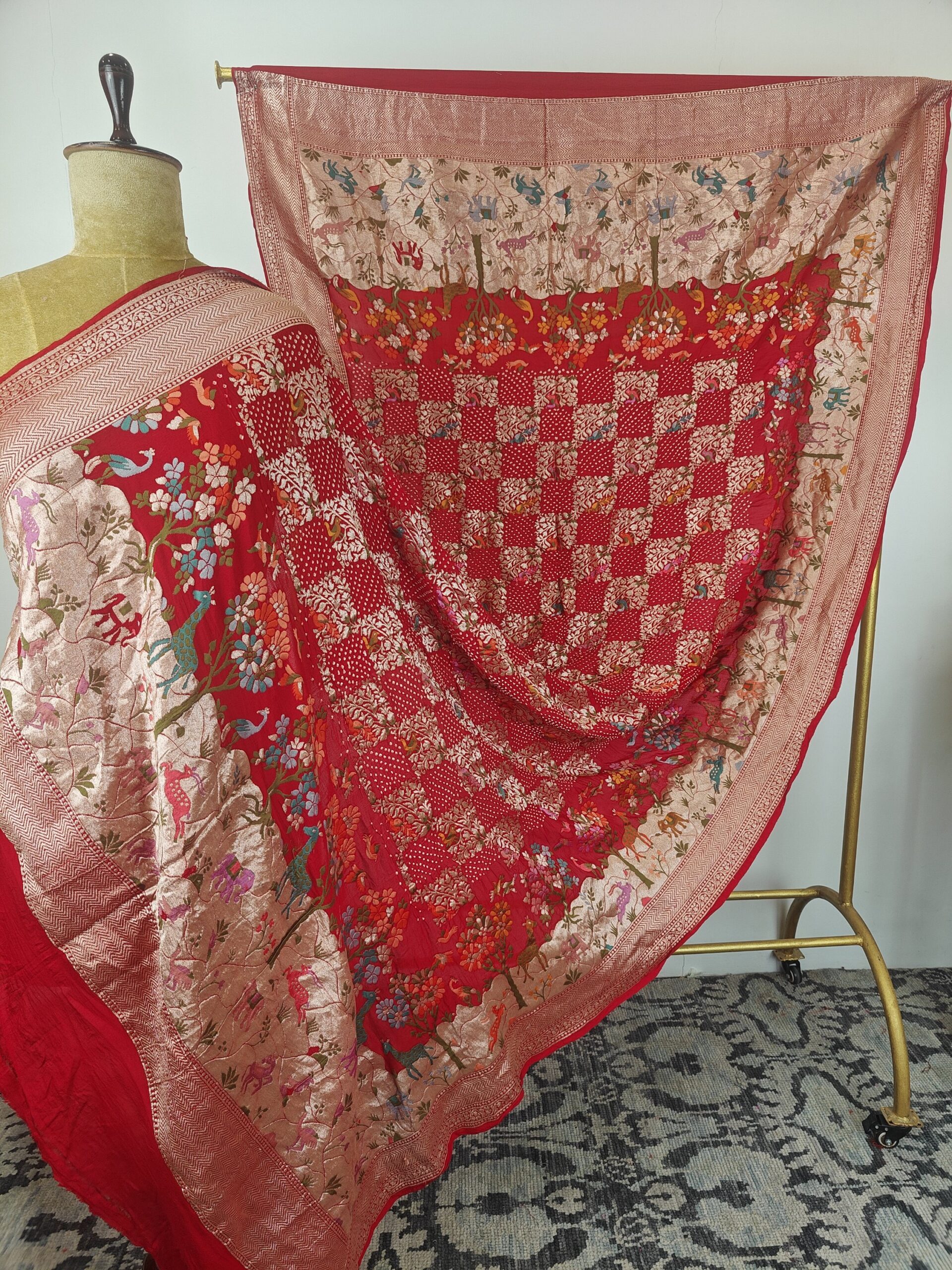 Red colour bandhani dupatta with floral and animals motifs detailed with meenakari and gold zari on georgette