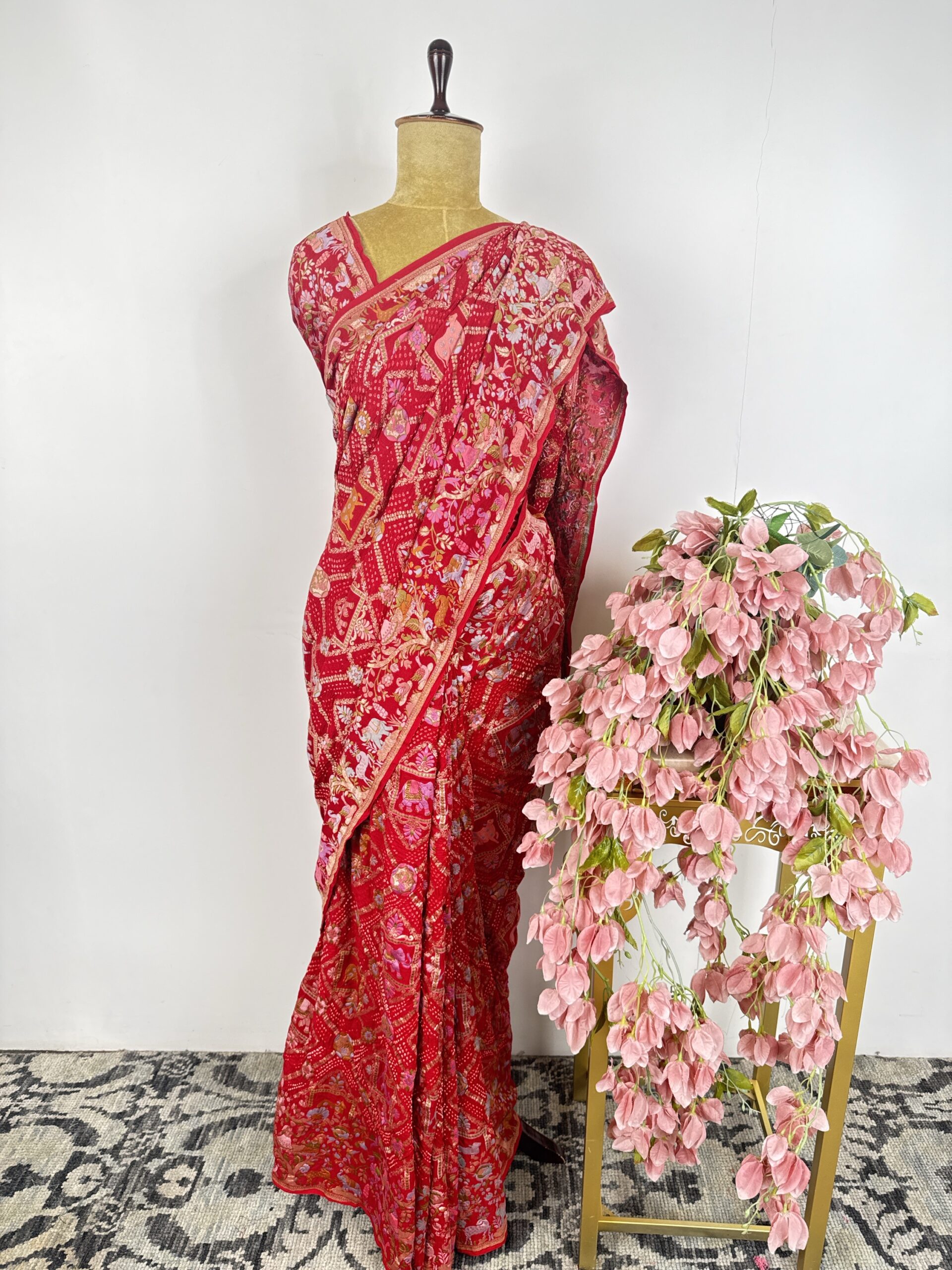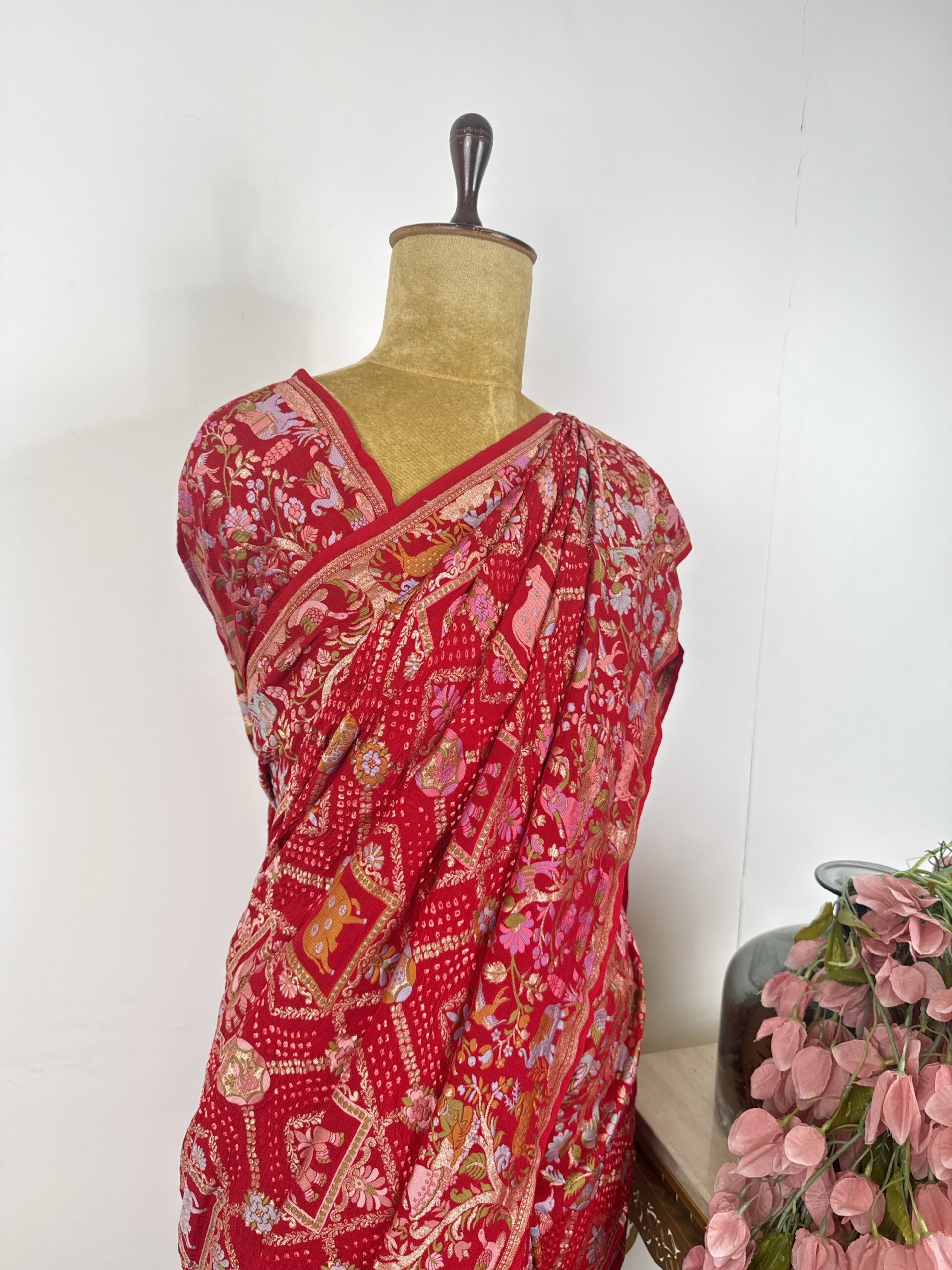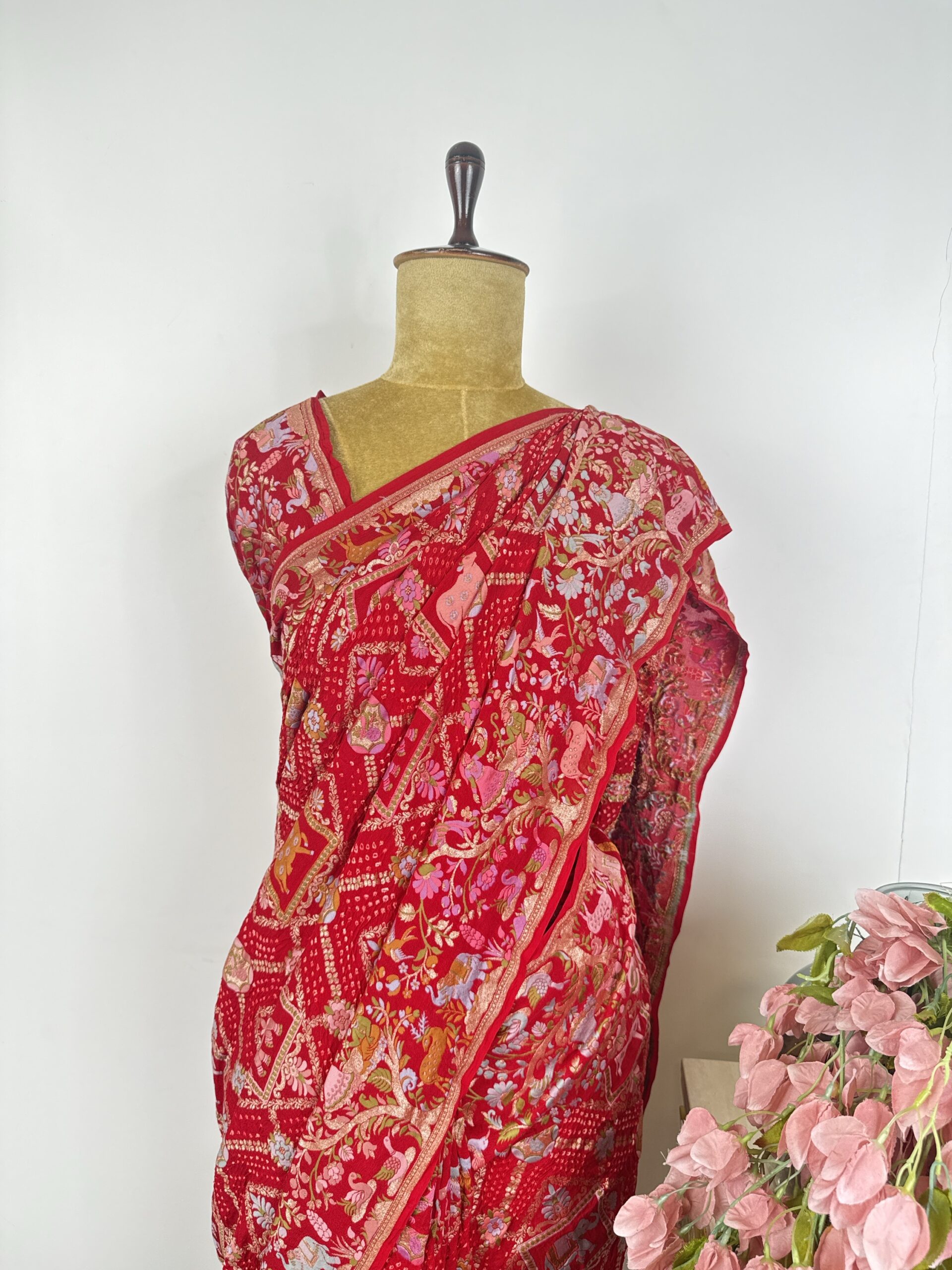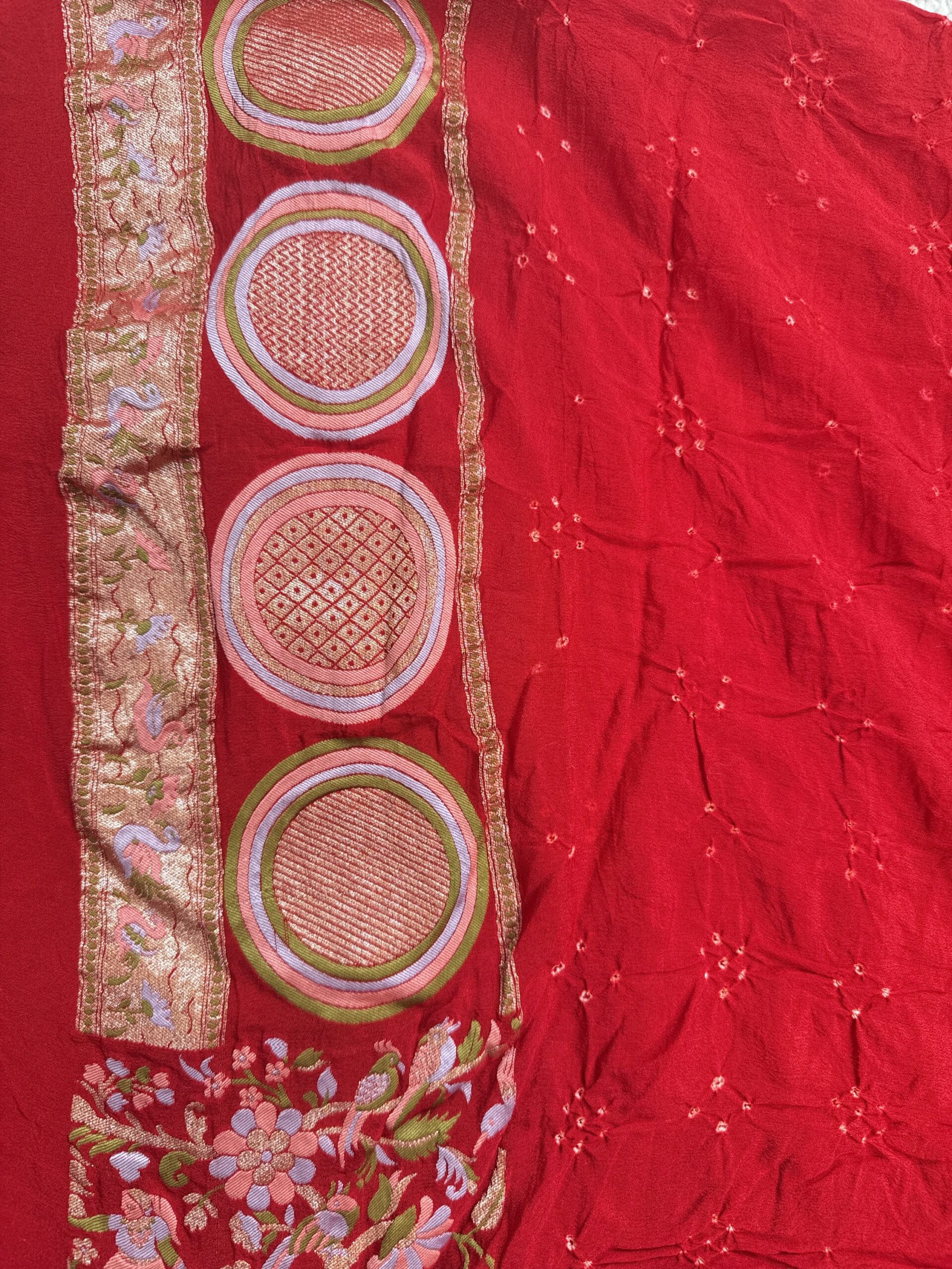 Red colour bandhani saree with jungle concept motifs detailed with meenakari and gold zari and raja rani human figures in the border on Georgette