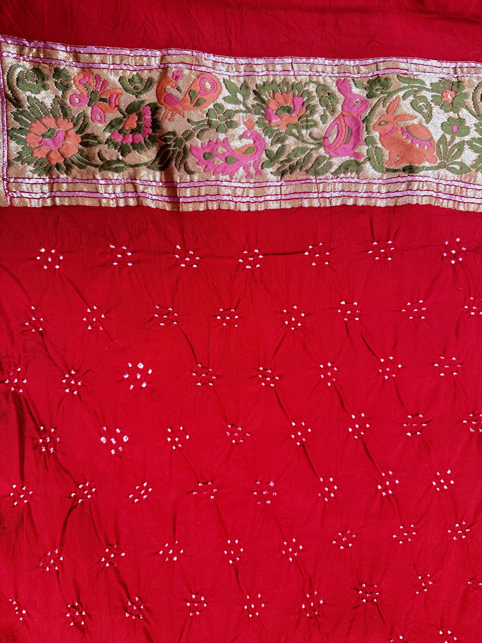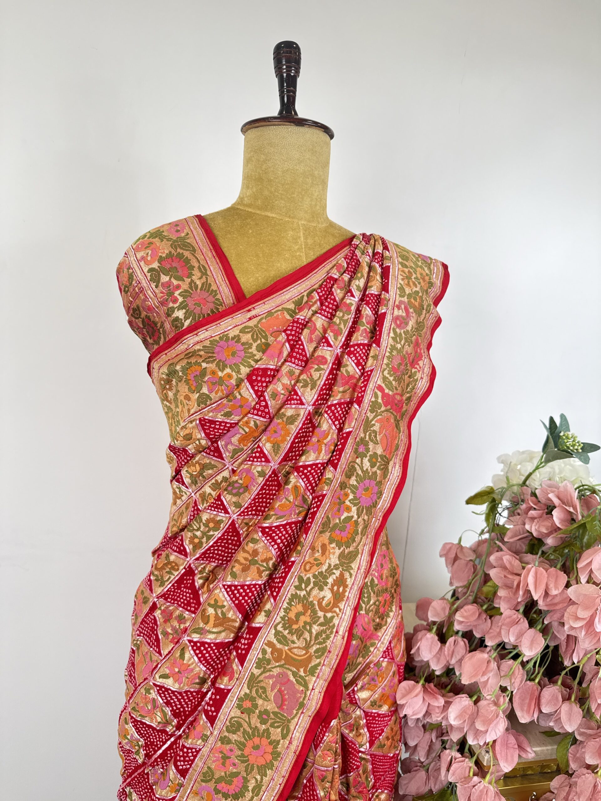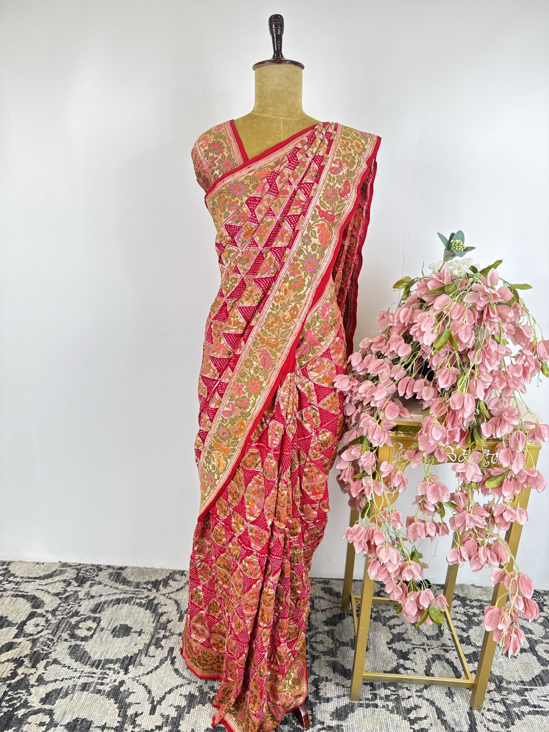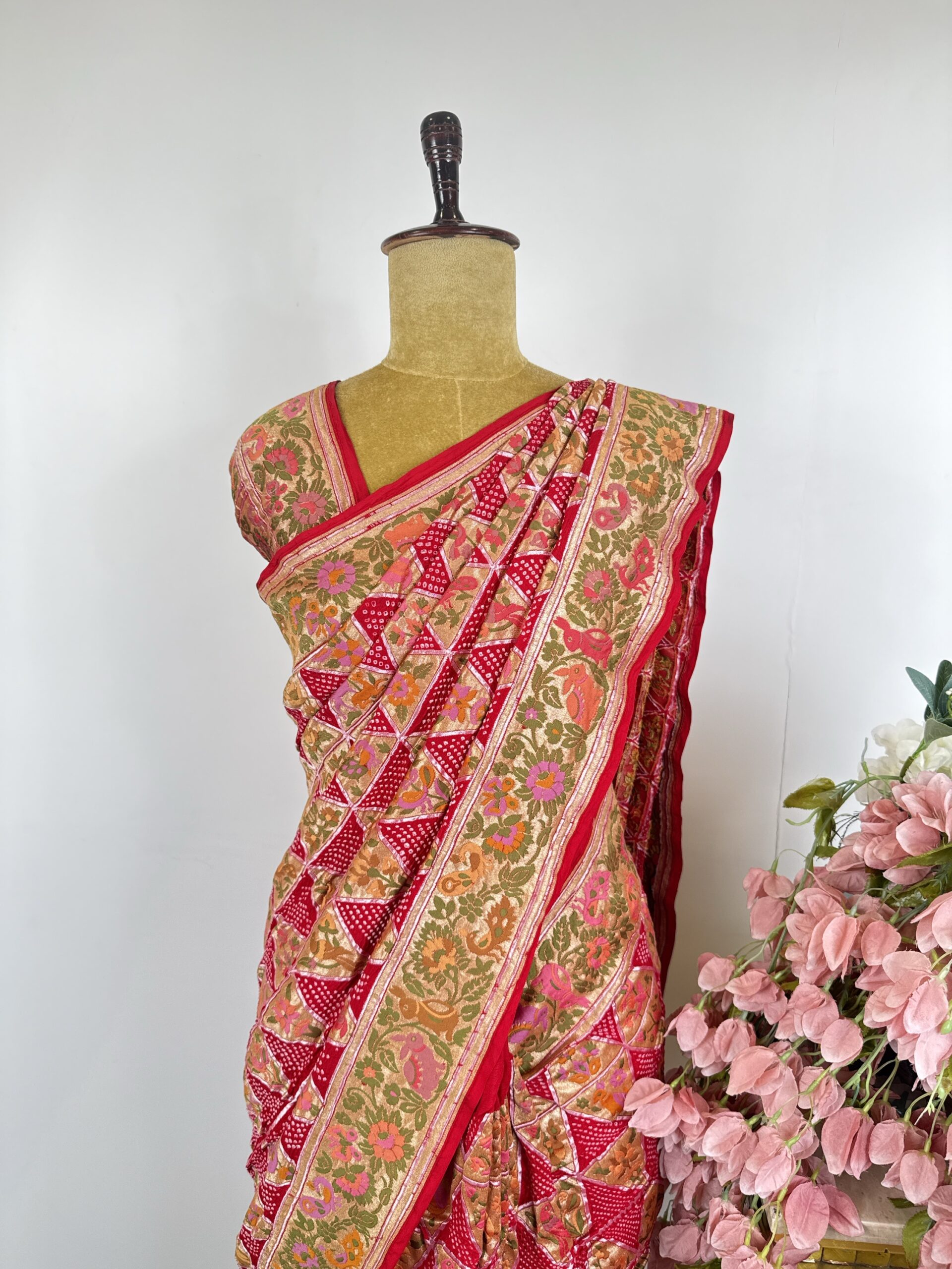 Red colour bandhani saree with floral ,birds and deers motifs detailed with meenakari and gold zari