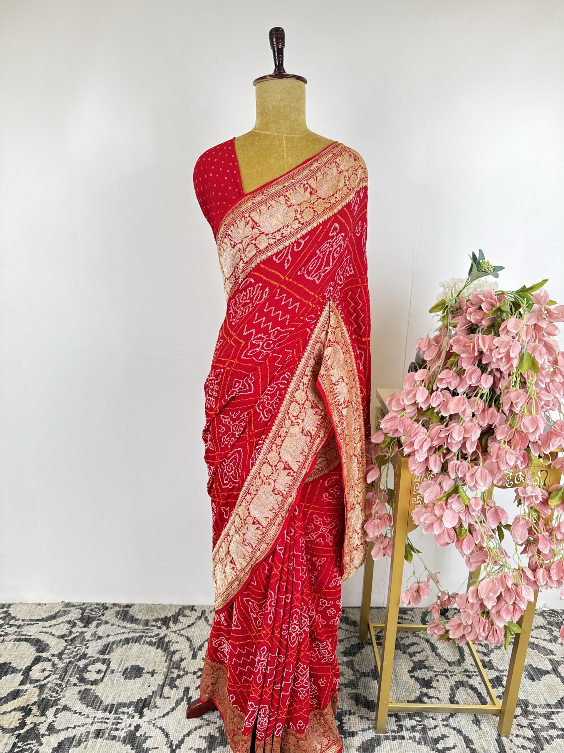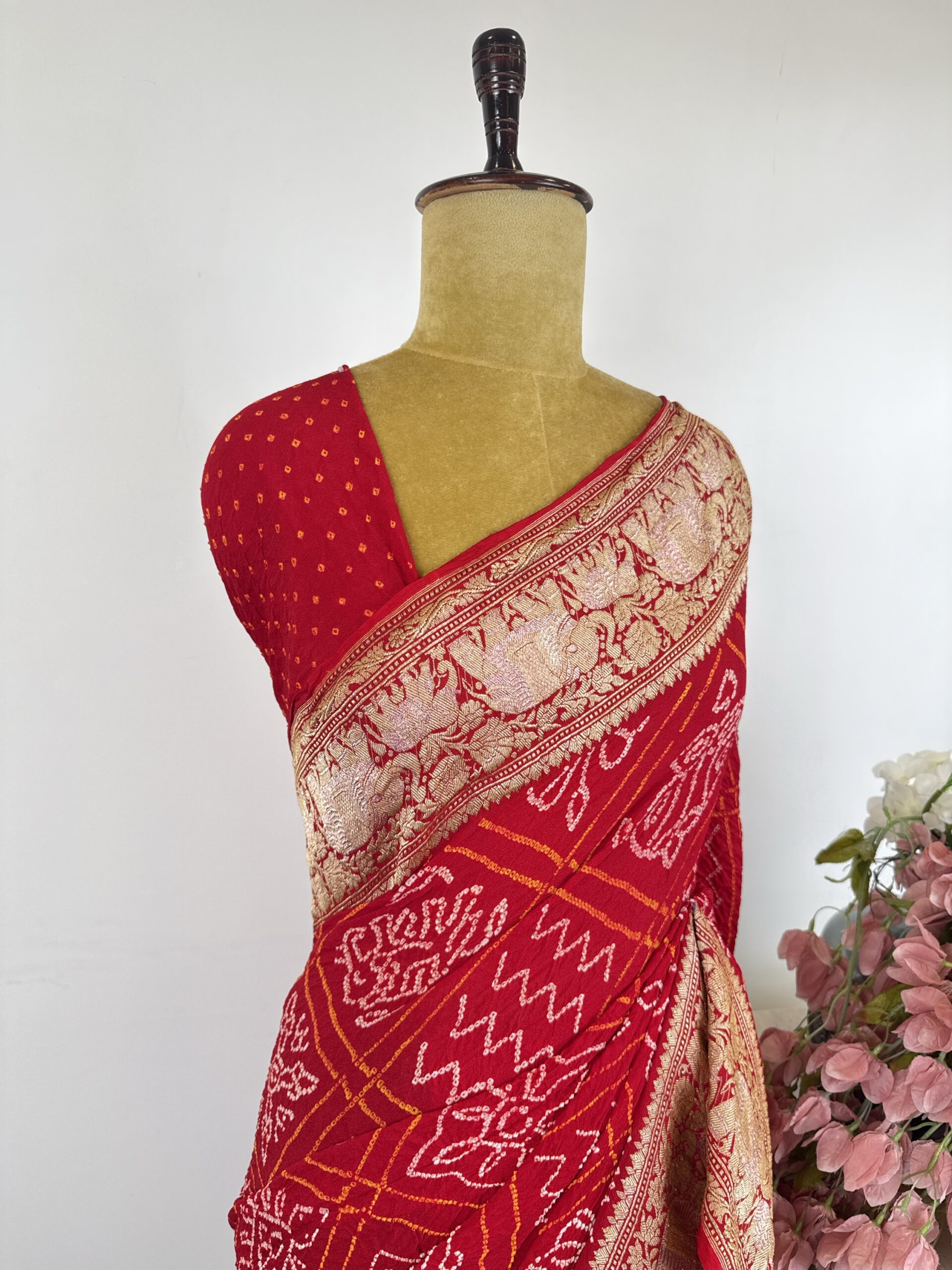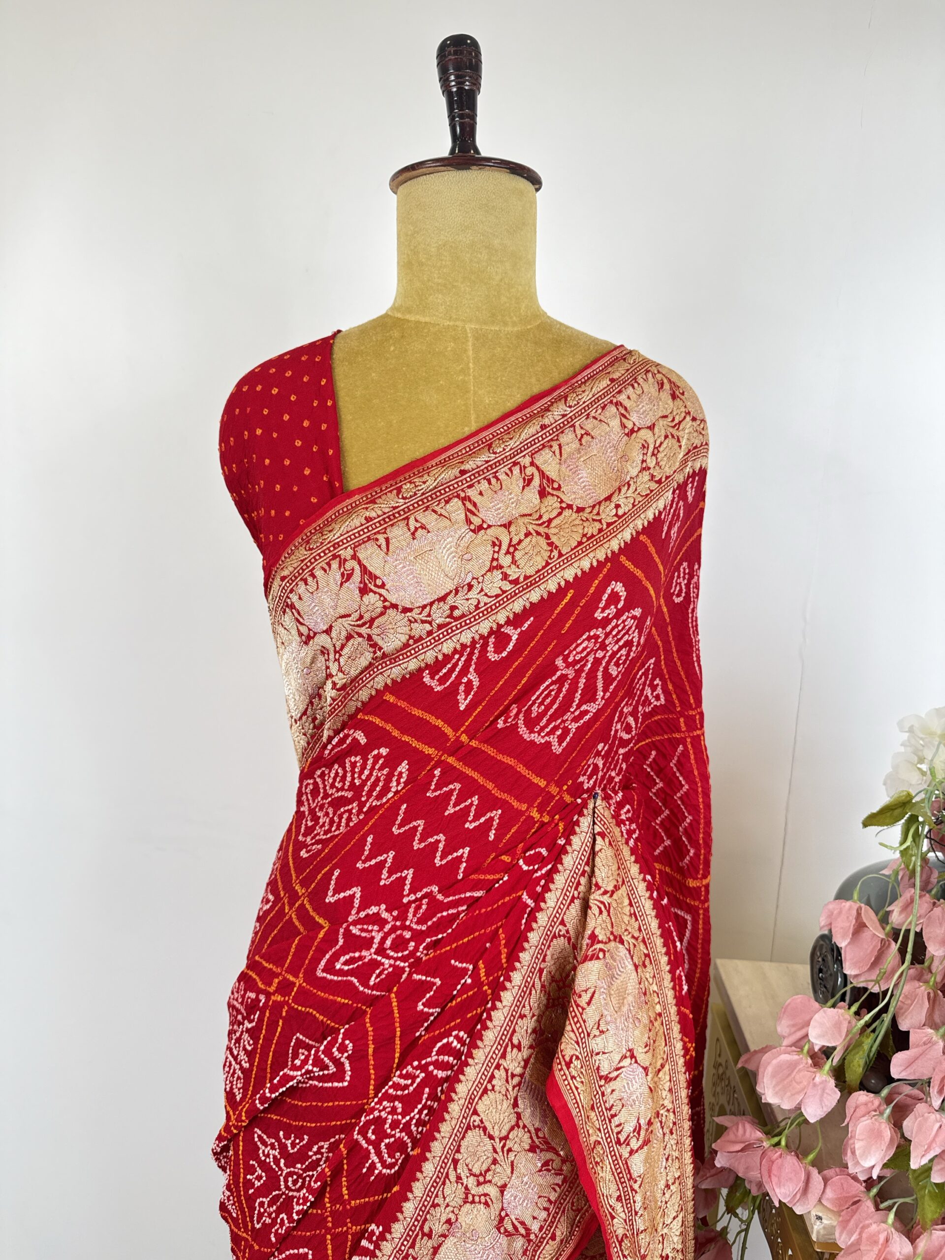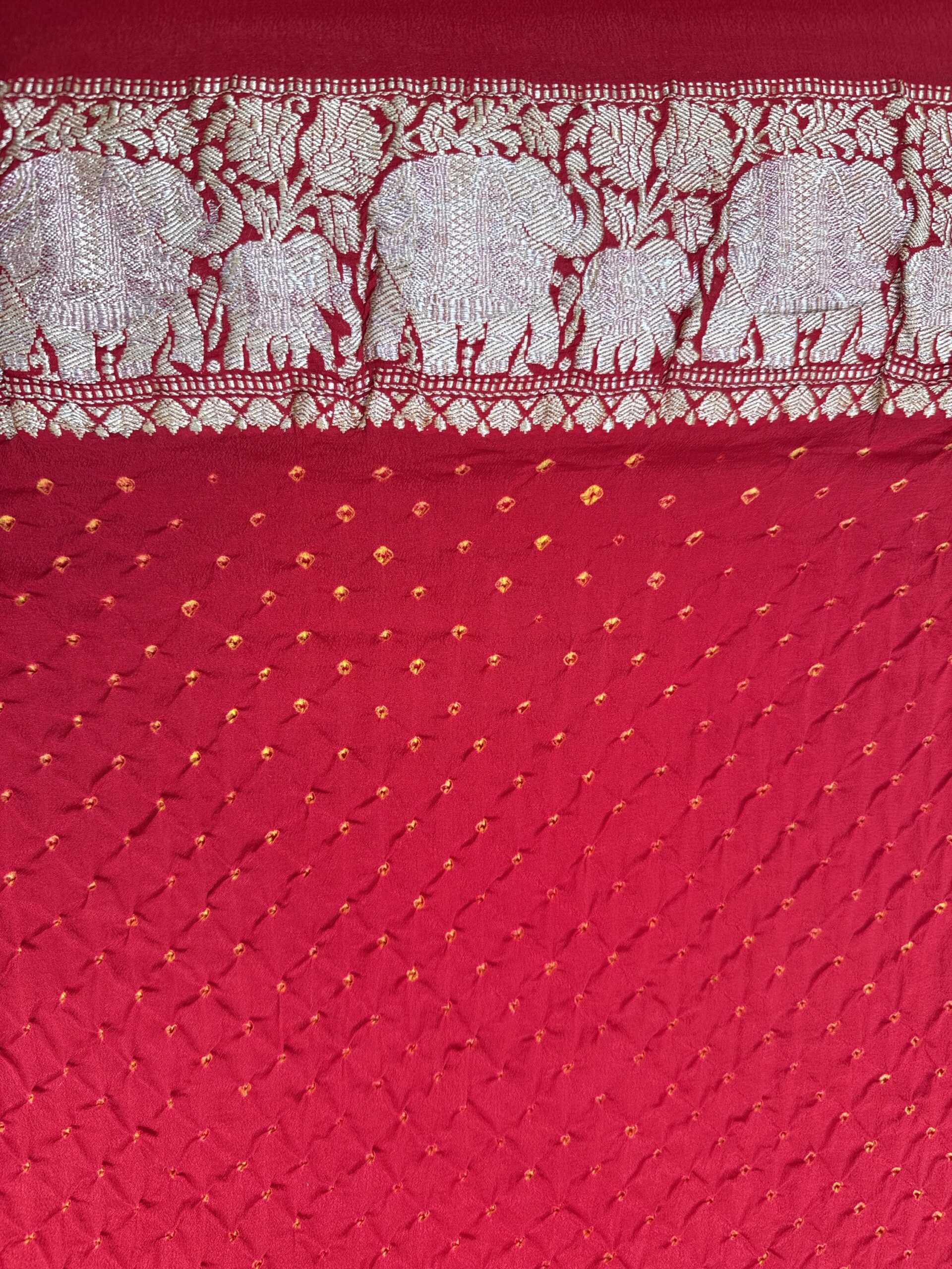 Red colour bandhani saree with elephants motifs in the border detailed with gold and silver zari on georgette
