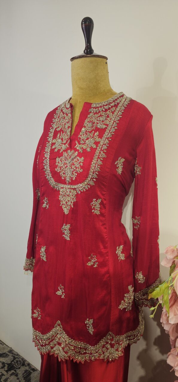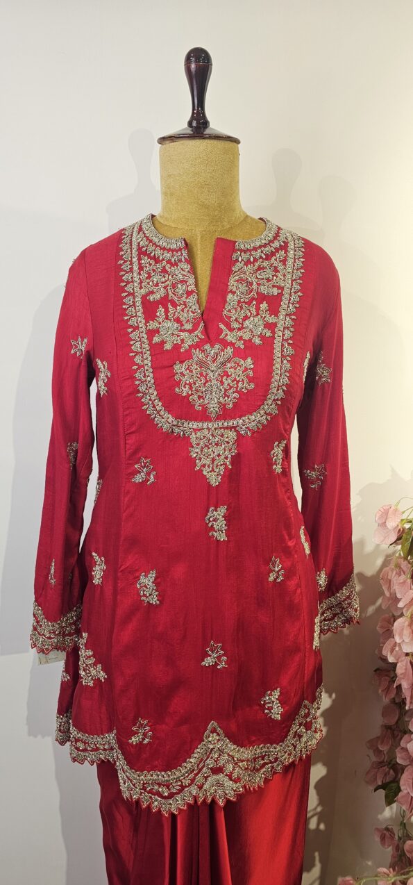 Red colour drape skirt with top with beautiful zardosi work at neck and bottom part of the top