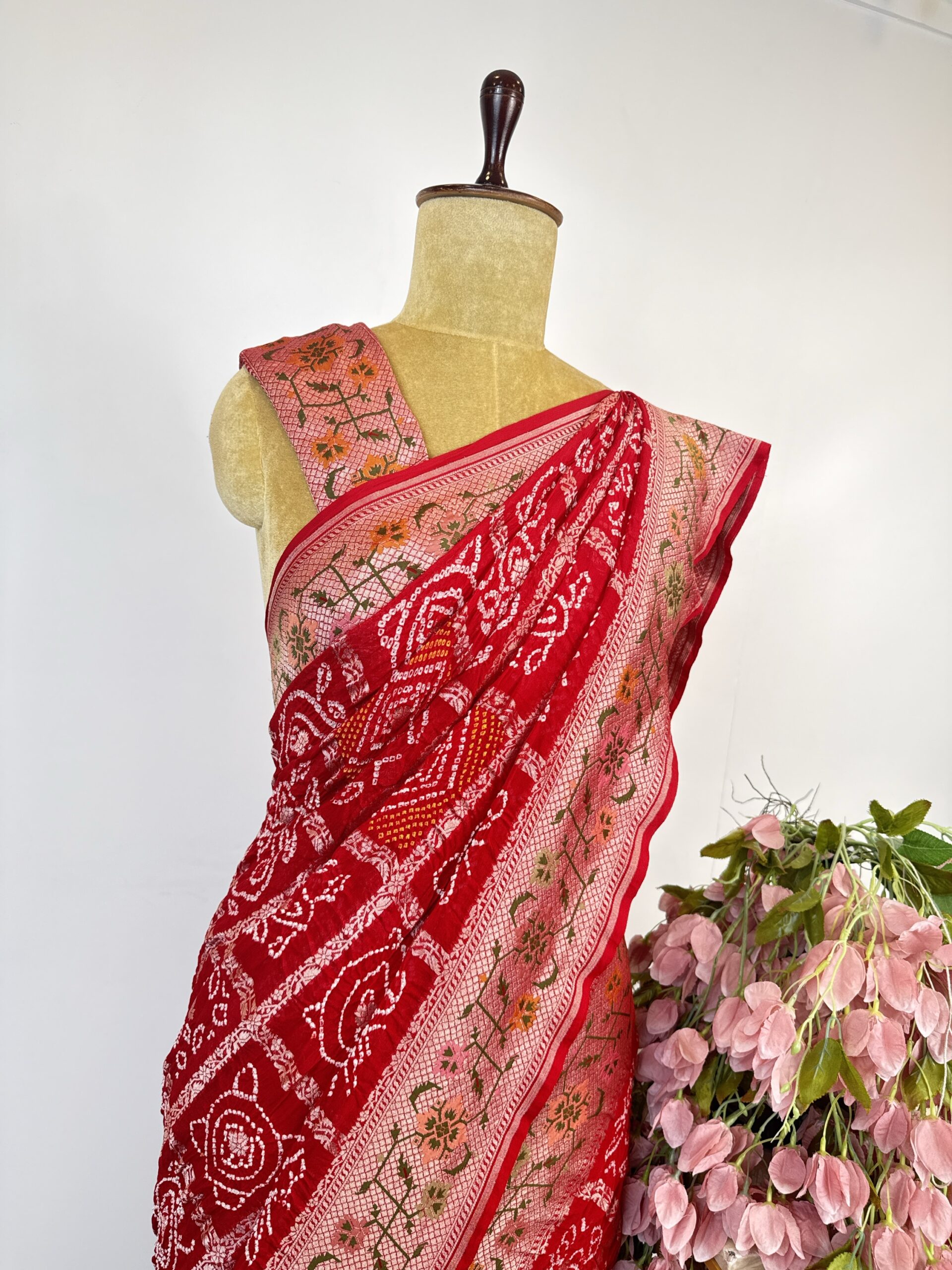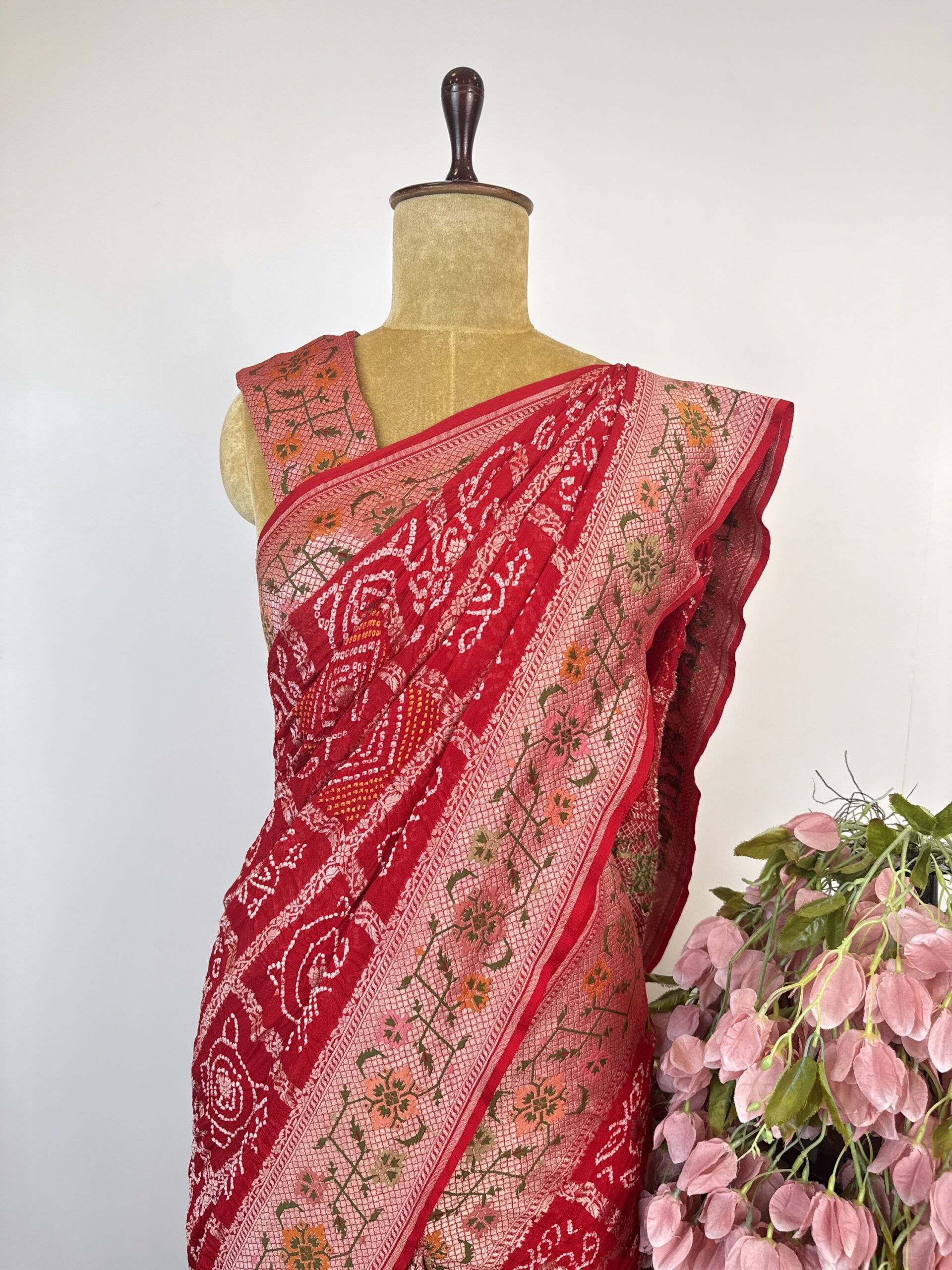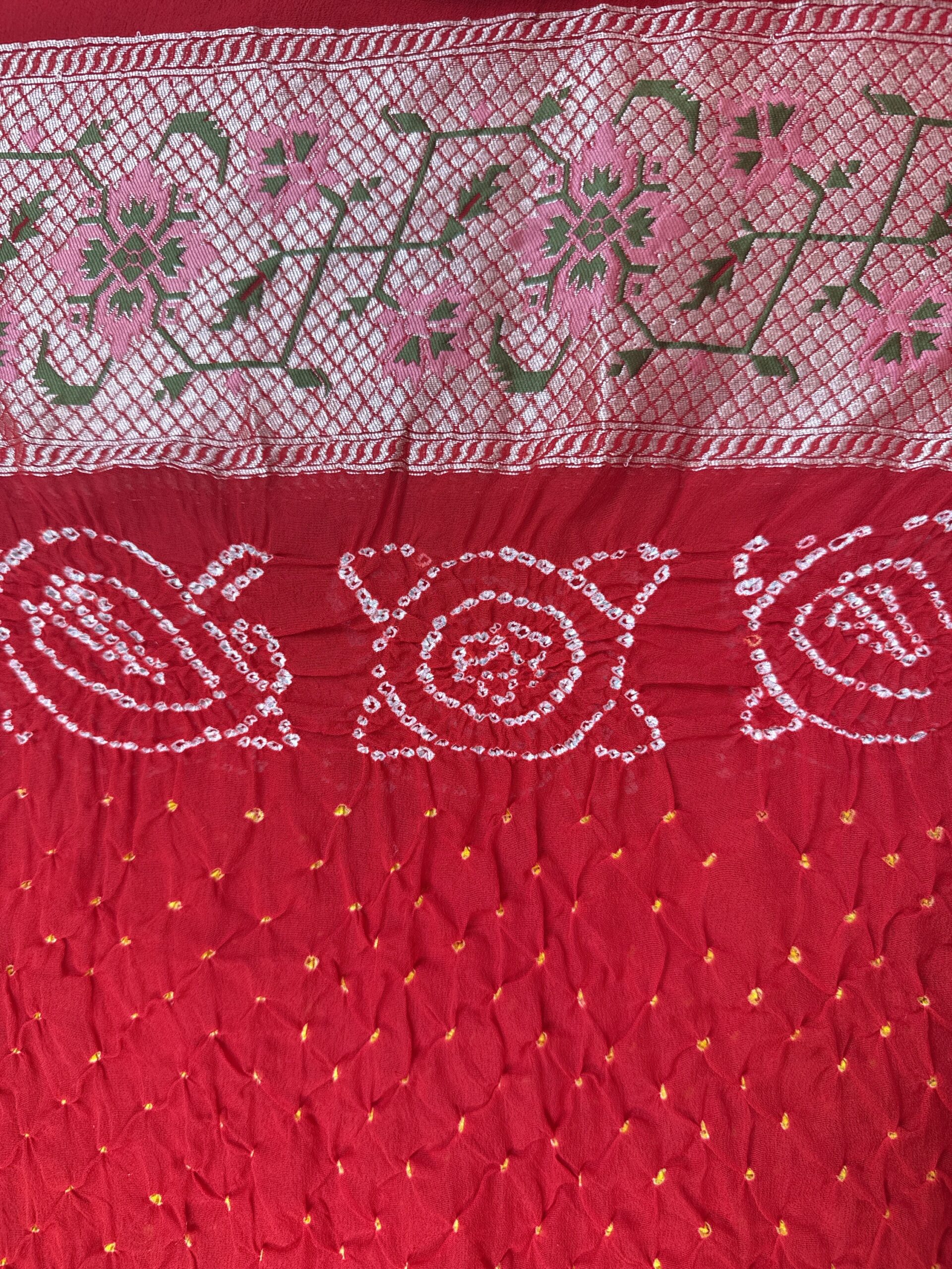 Red colour gharchola bandhani Georgette saree with Patola border concept and detailed with meenakari and gold zari