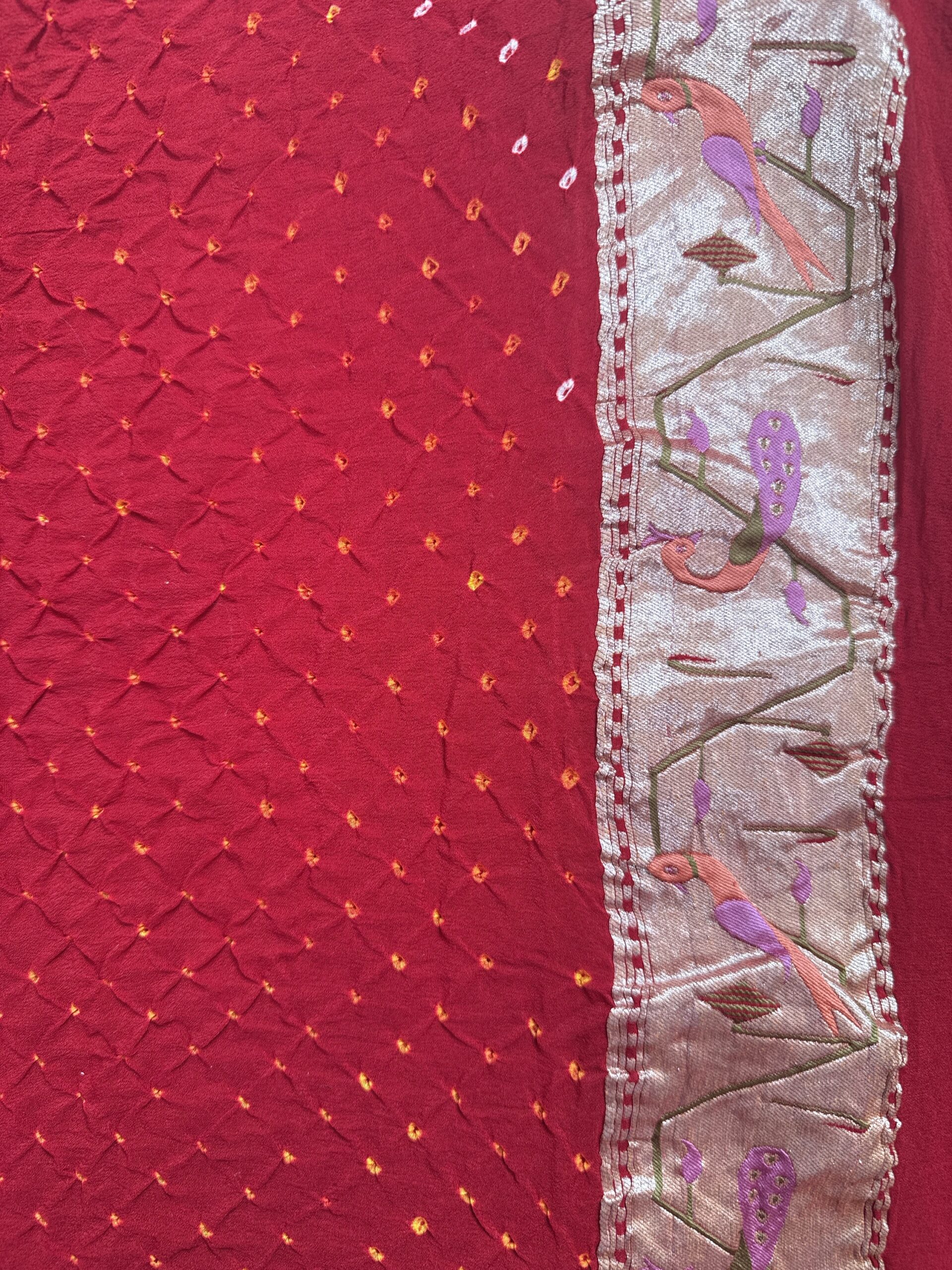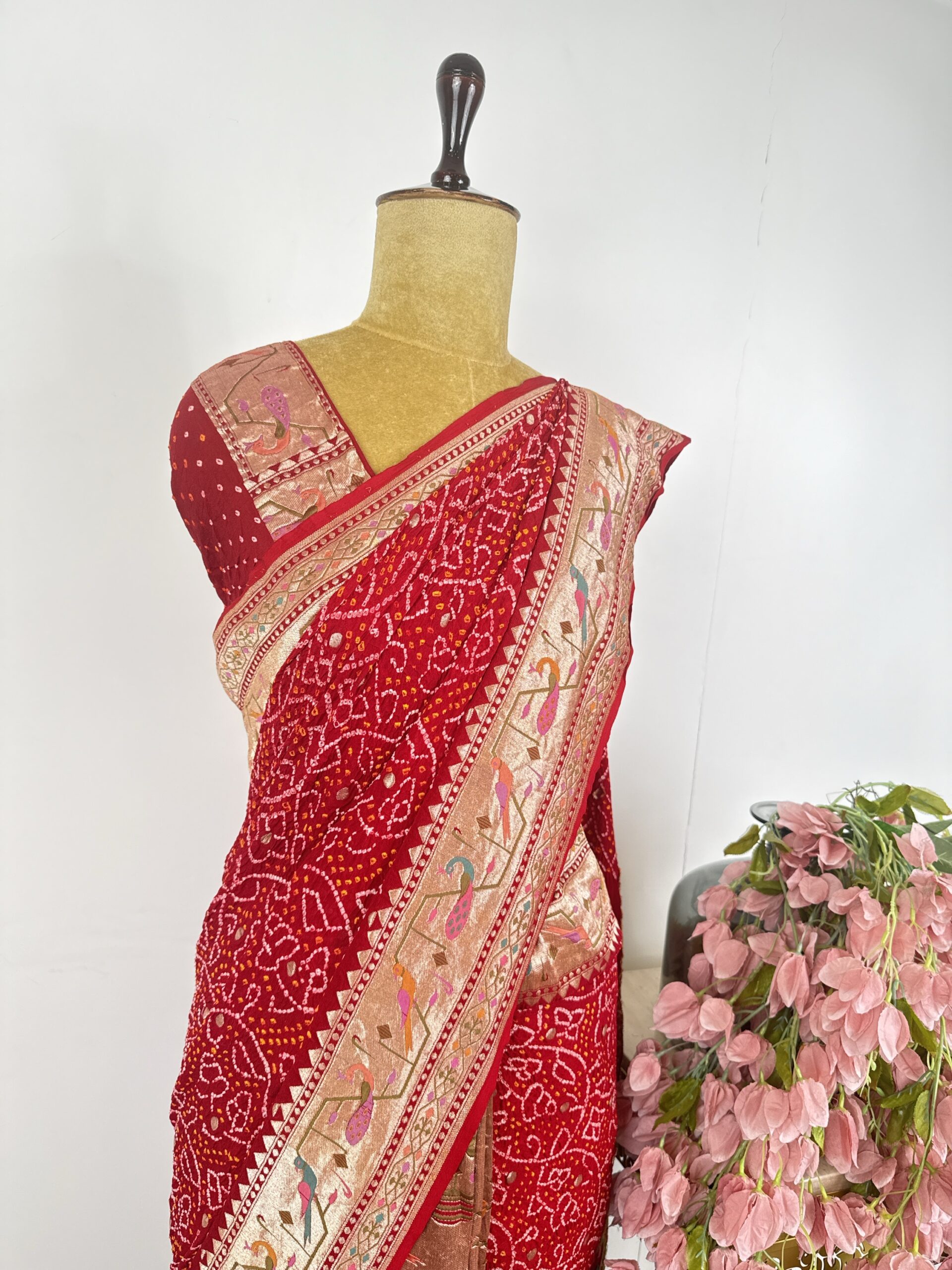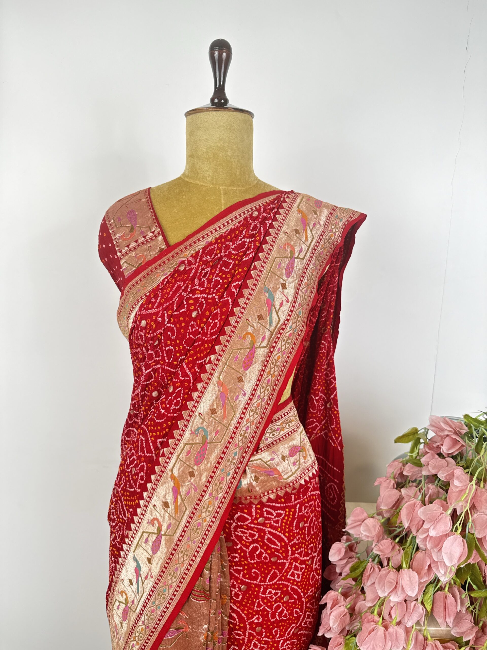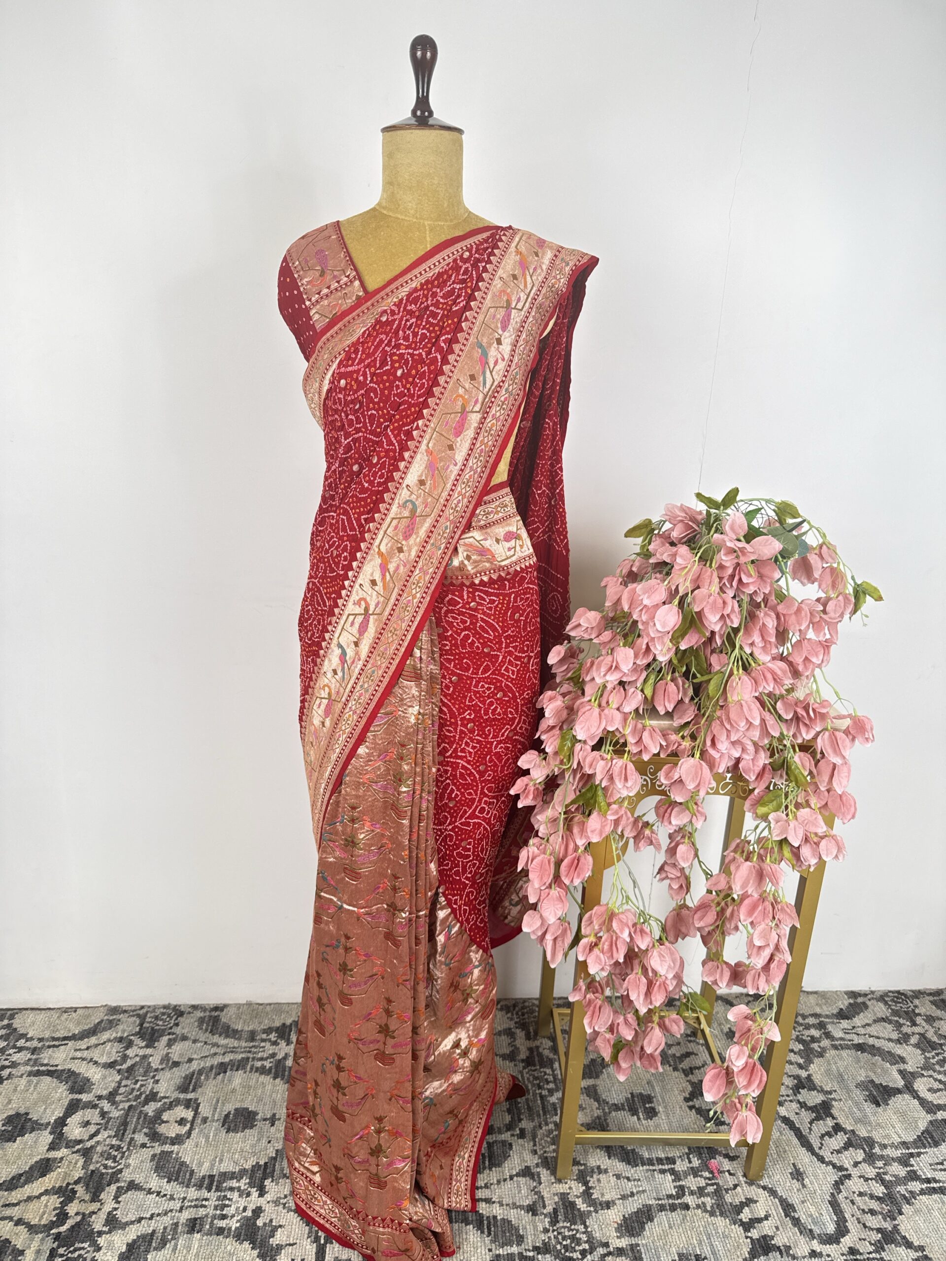 Red colour half and half bandhani saree with paithani concept and bandhani saree