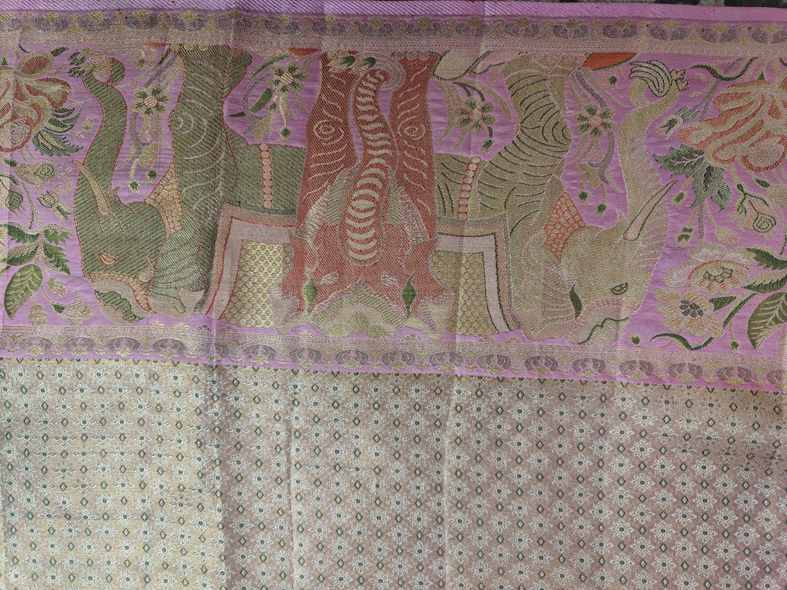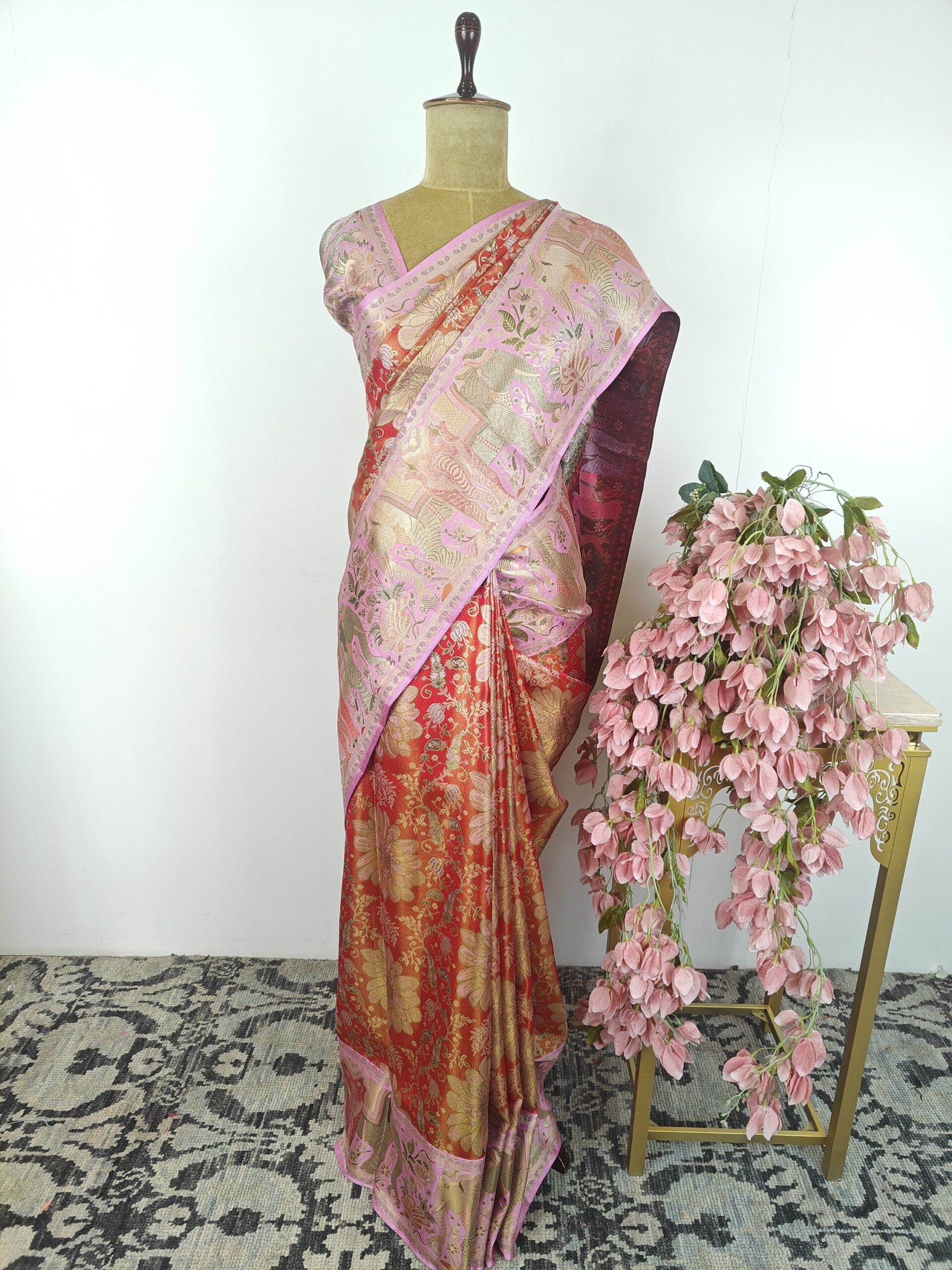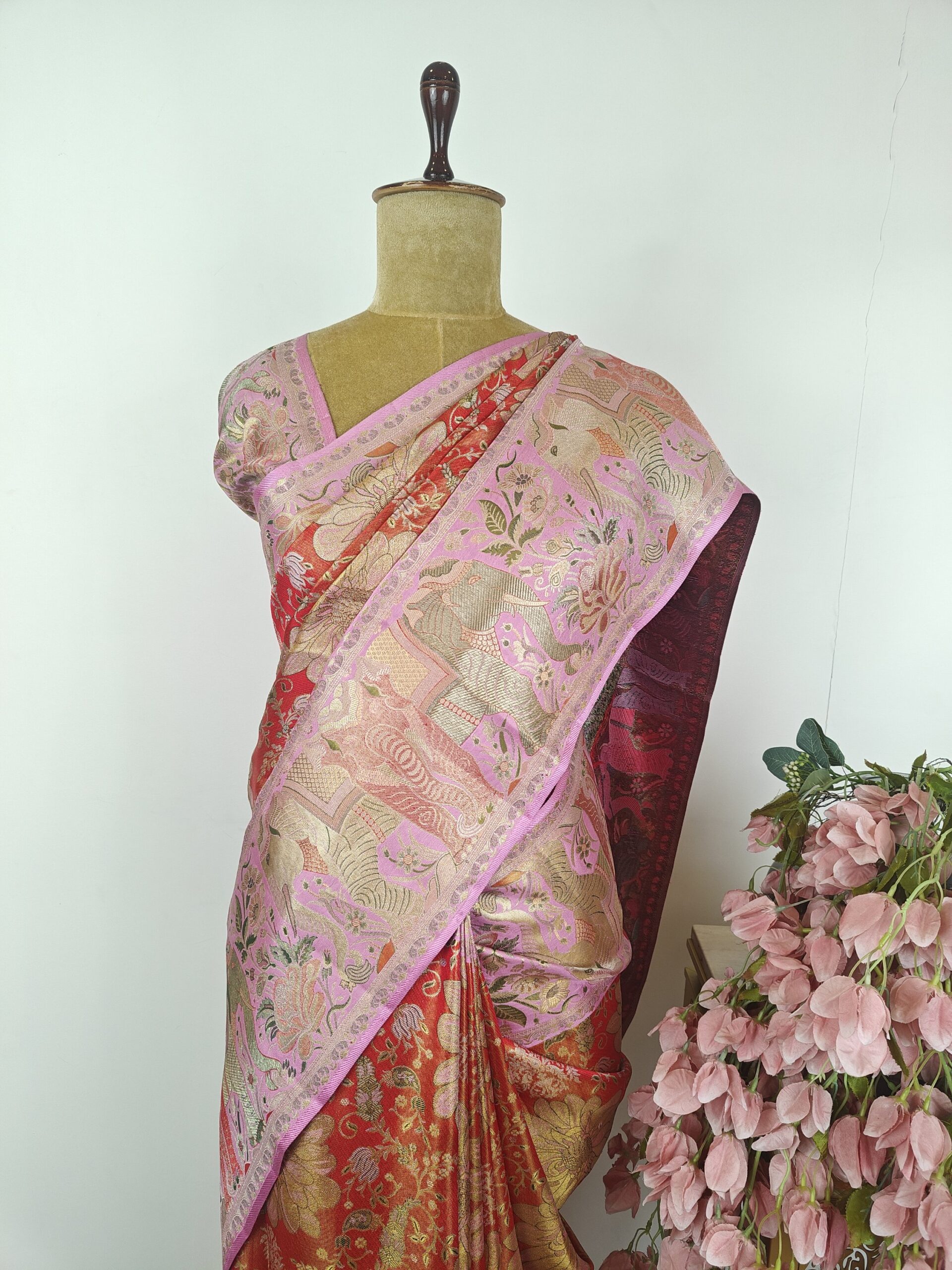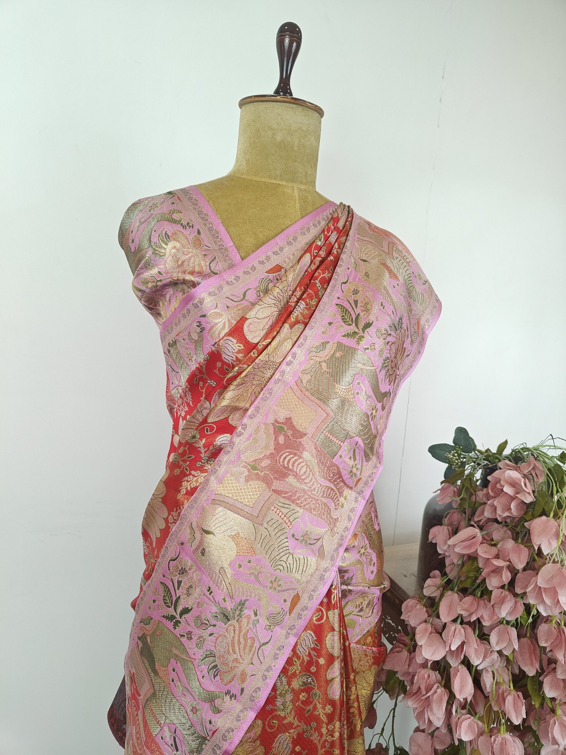 Red colour Kanchi saree with floral motifs all over saree and pink colour border with elephants motifs detailed with meenakari