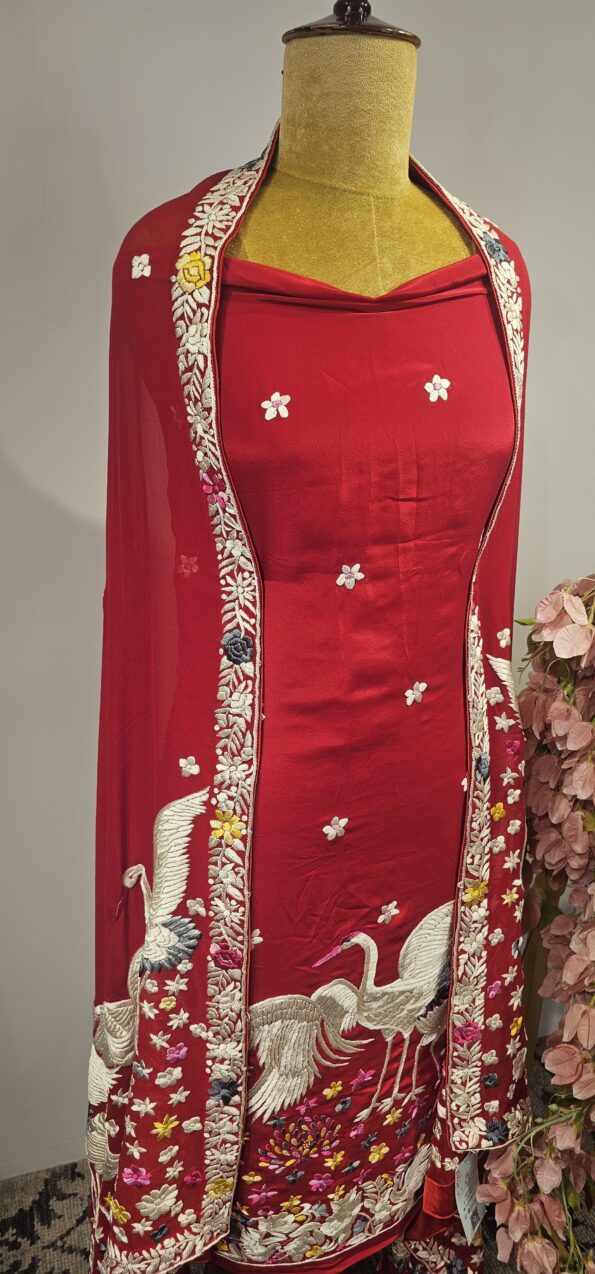 Red colour parsi gara crepe unstitched suit material with beautiful crane motif at bottom of the kurthi and with beautiful thread embroidery duppatta