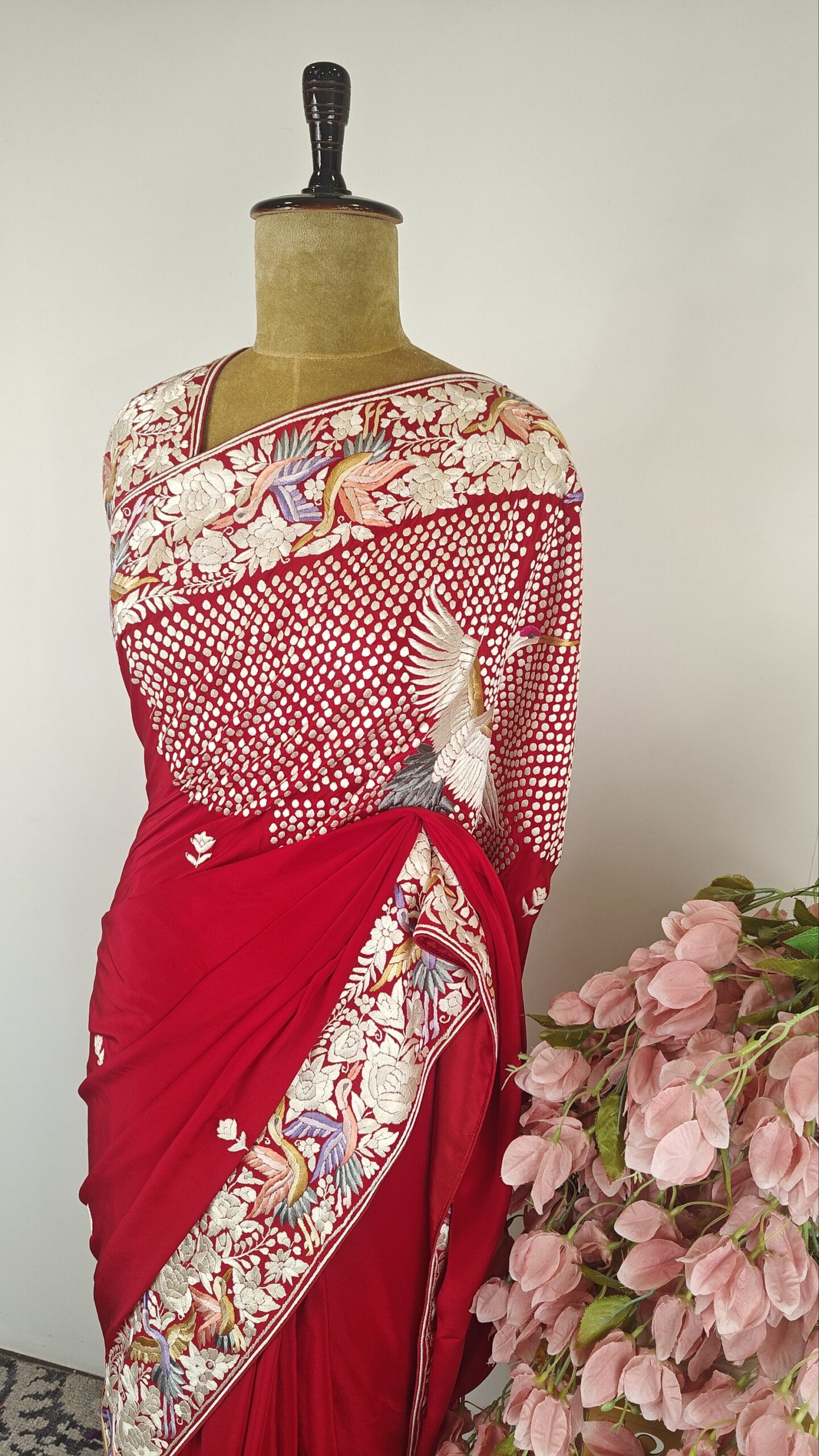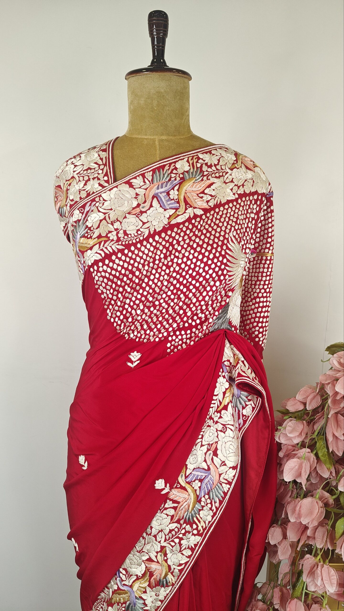 Red colour parsi saree with folka dots embroidery with multi colour thread in palla and shoulder part and comes with all over border concept and the fabric is crape