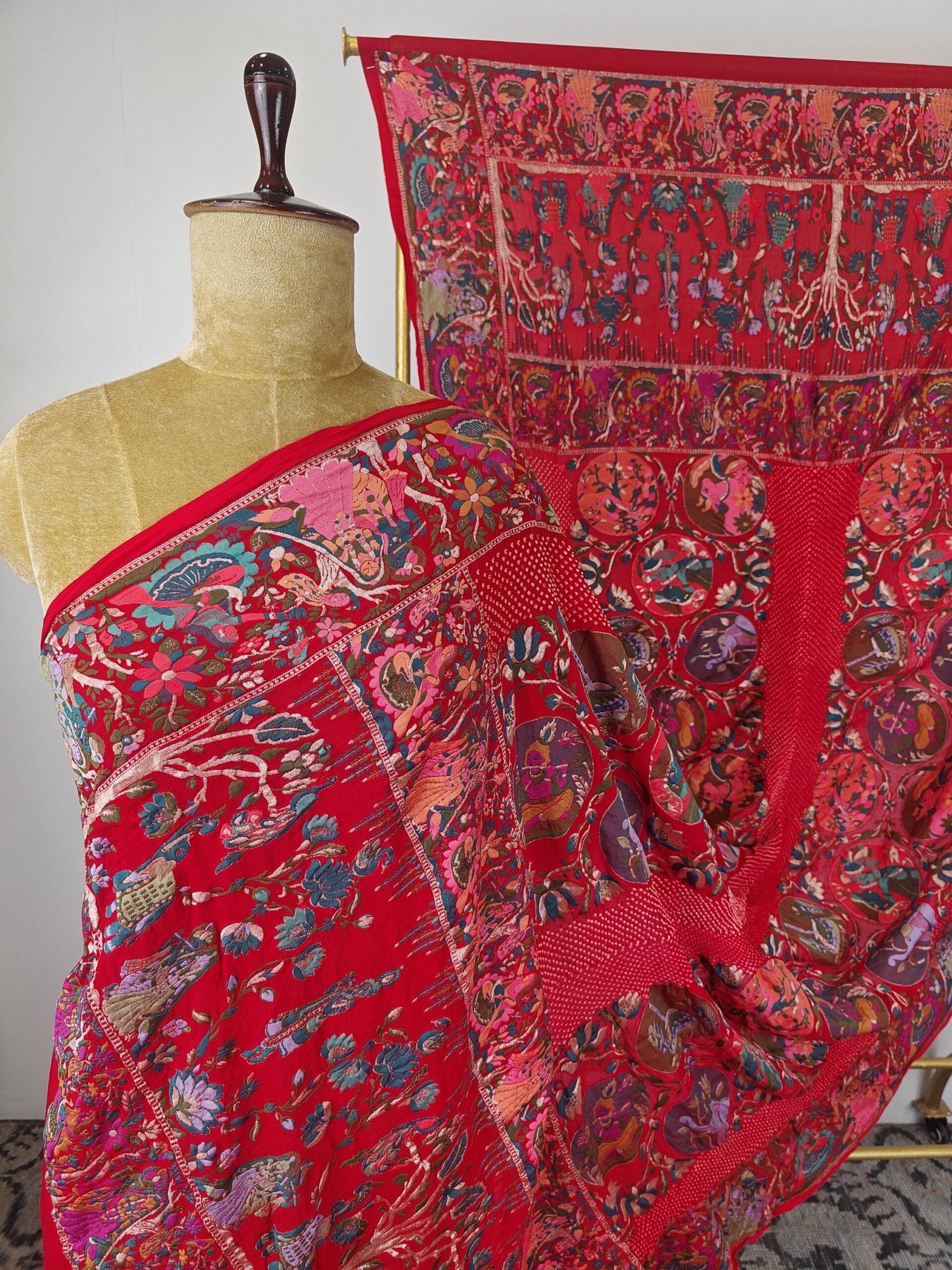 Red colour Radha krishna bandhani dupatta with floral, peacocks, birds and elephants motifs detailed with meenakari and gold zari on georgette