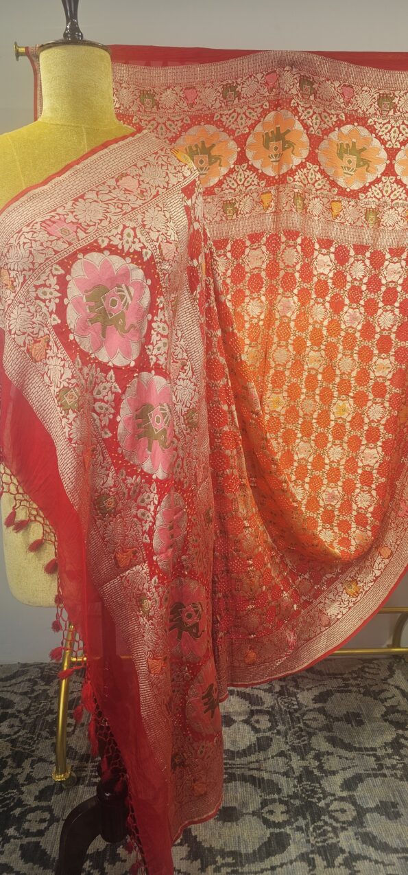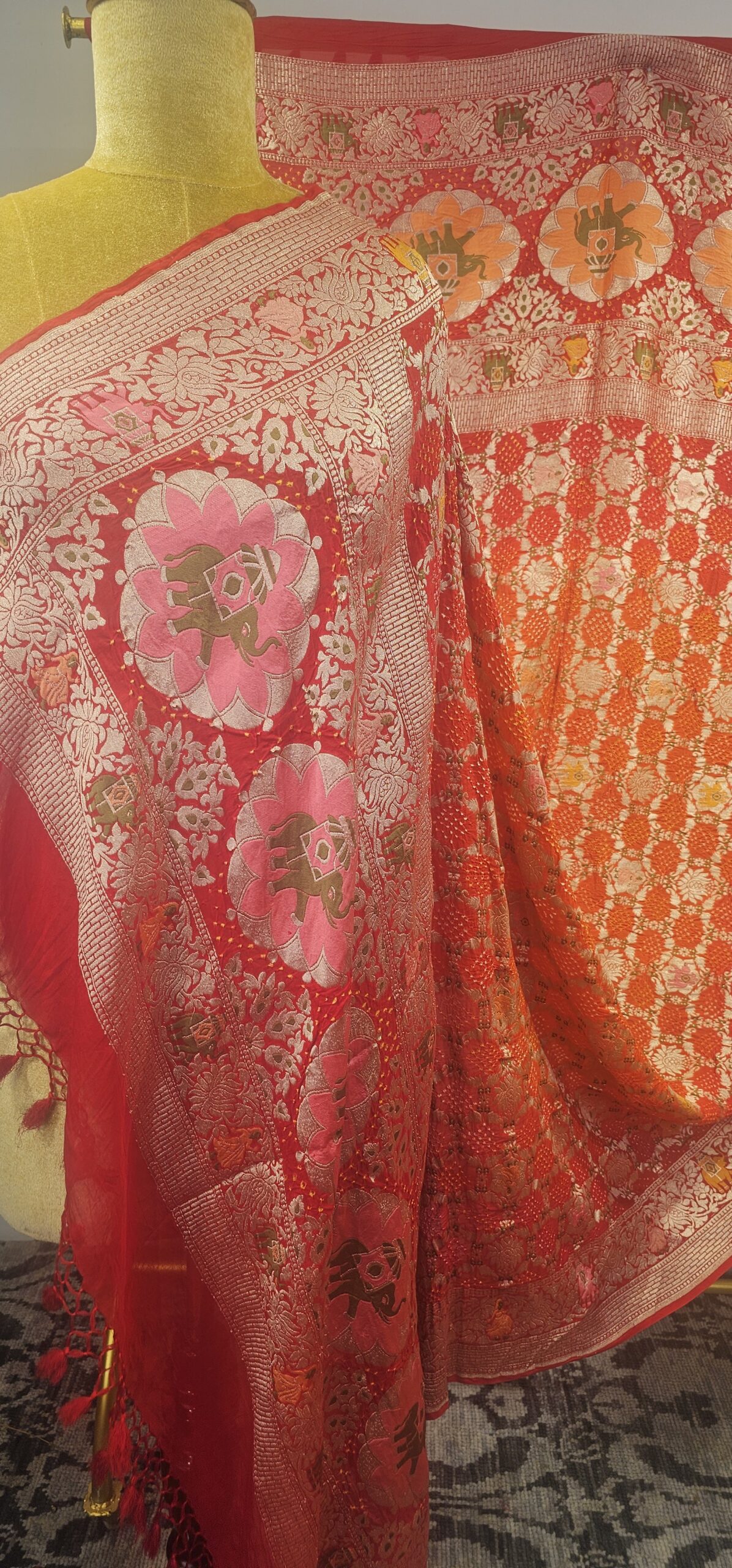 Red-orange georgette Bandhani Dupatta with Floral zari and meenakari weaving and elephant motifs in pallu and border.