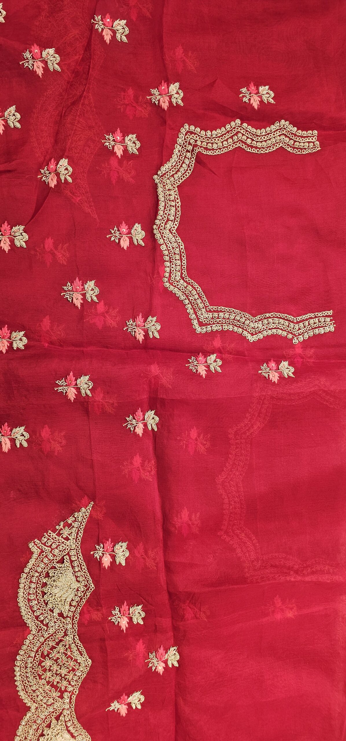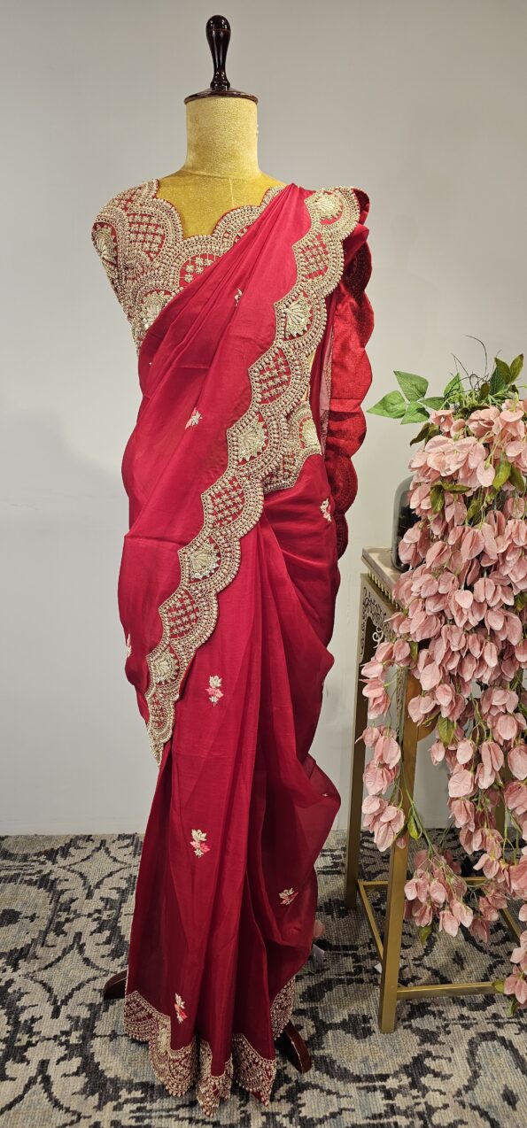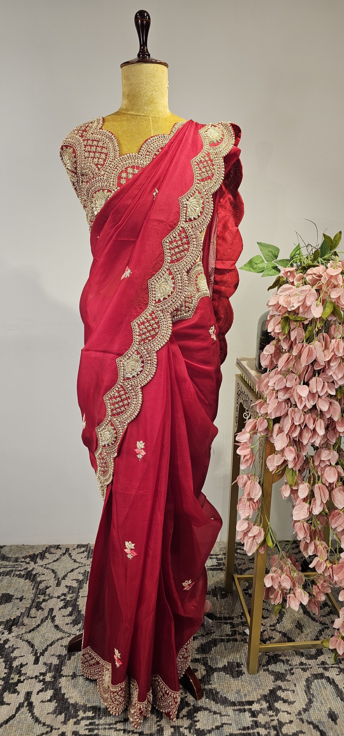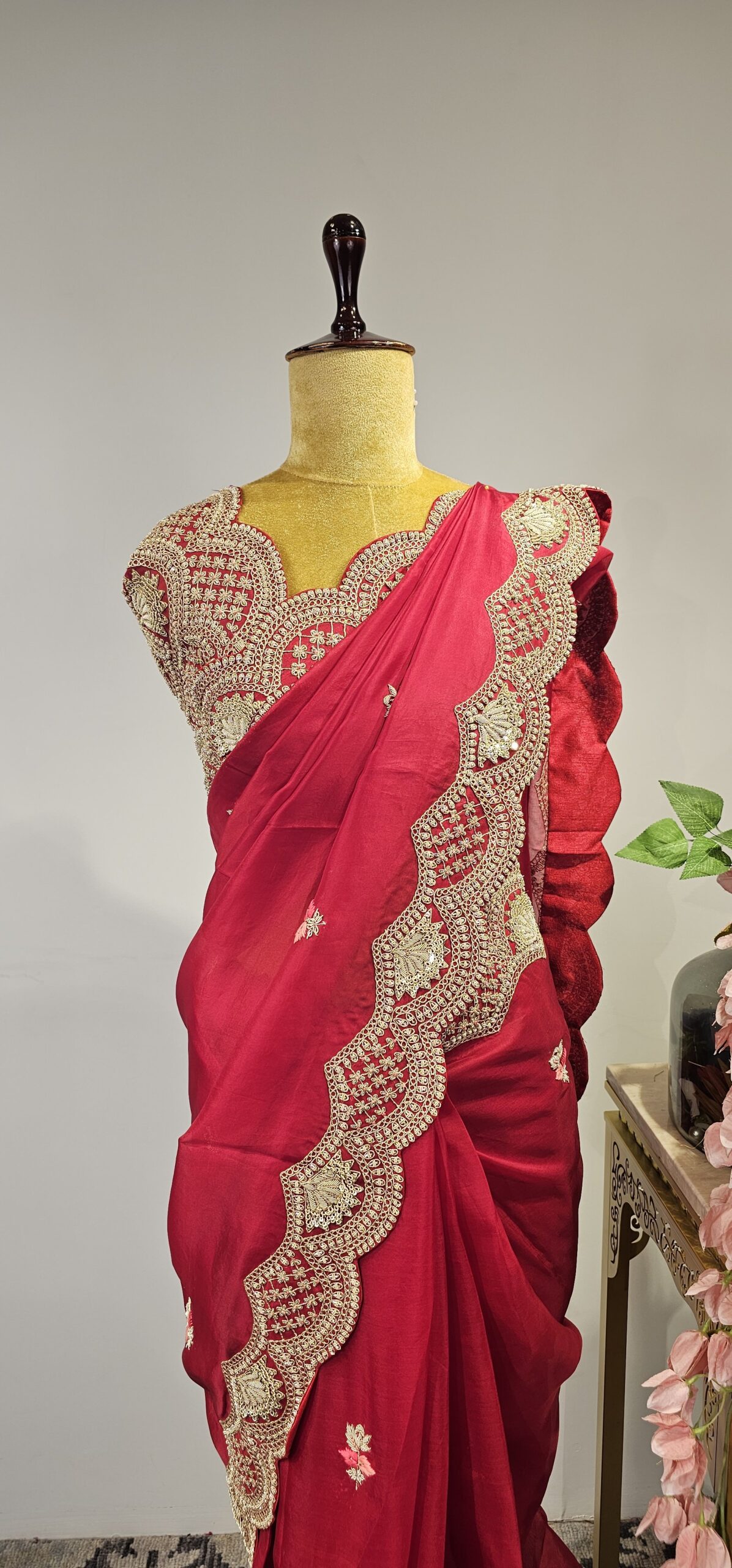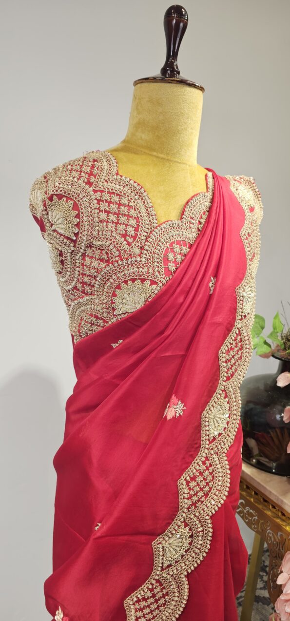 Red orange saree with zardosi and Dori work and a stunning blouse.