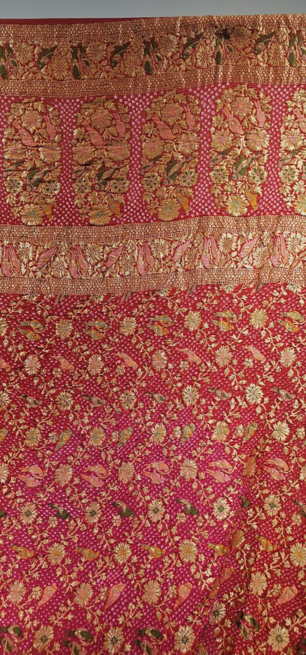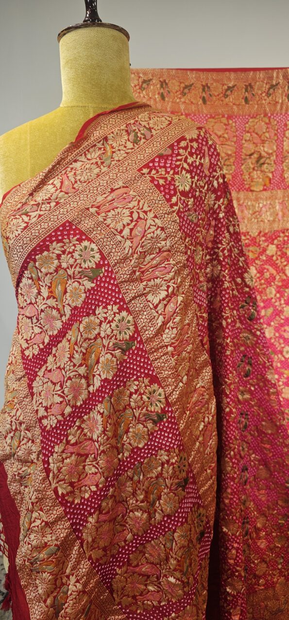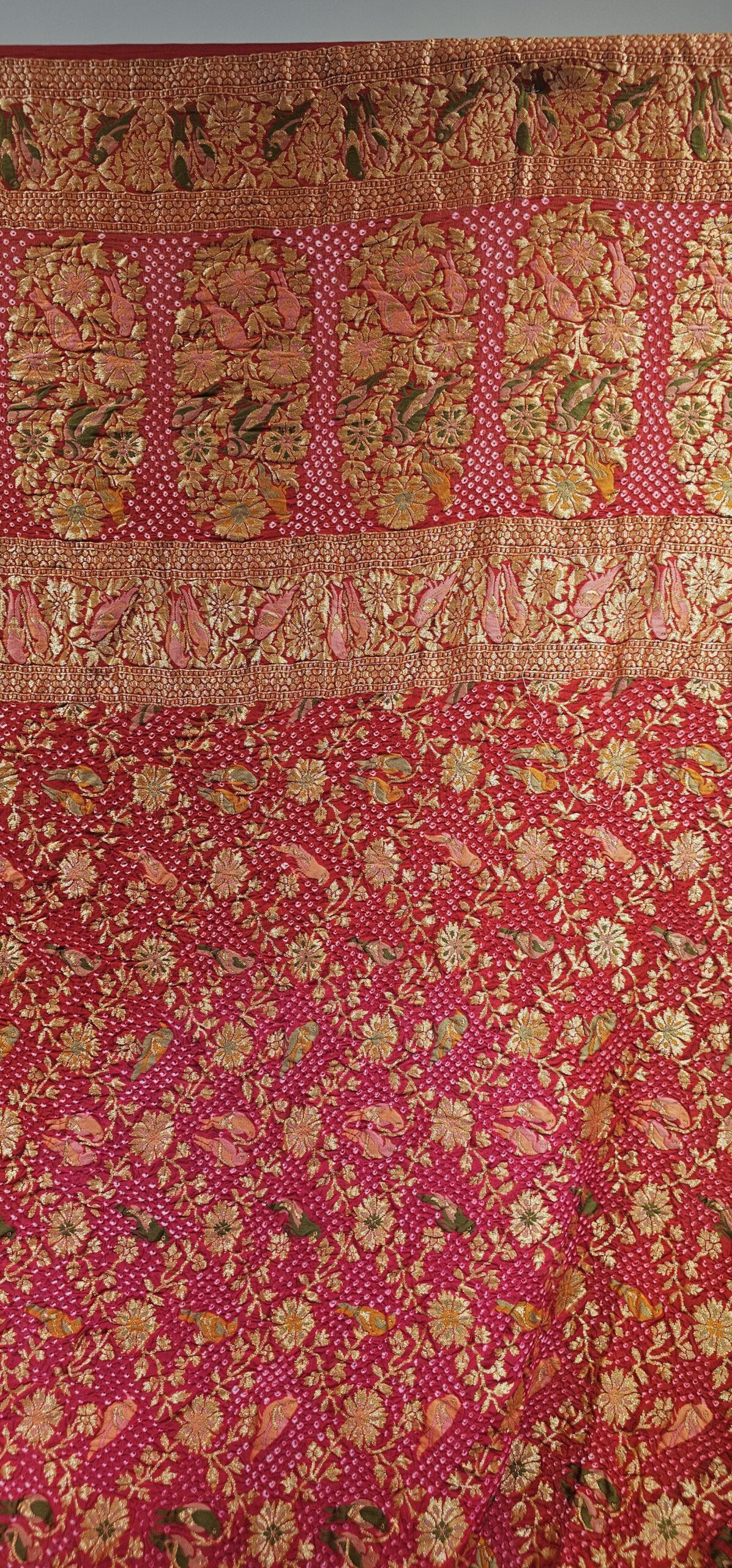 Red-Pink georgette bandhani dupatta with all over zari and meenakari weaving with birds motifs and beautiful pallu and border.