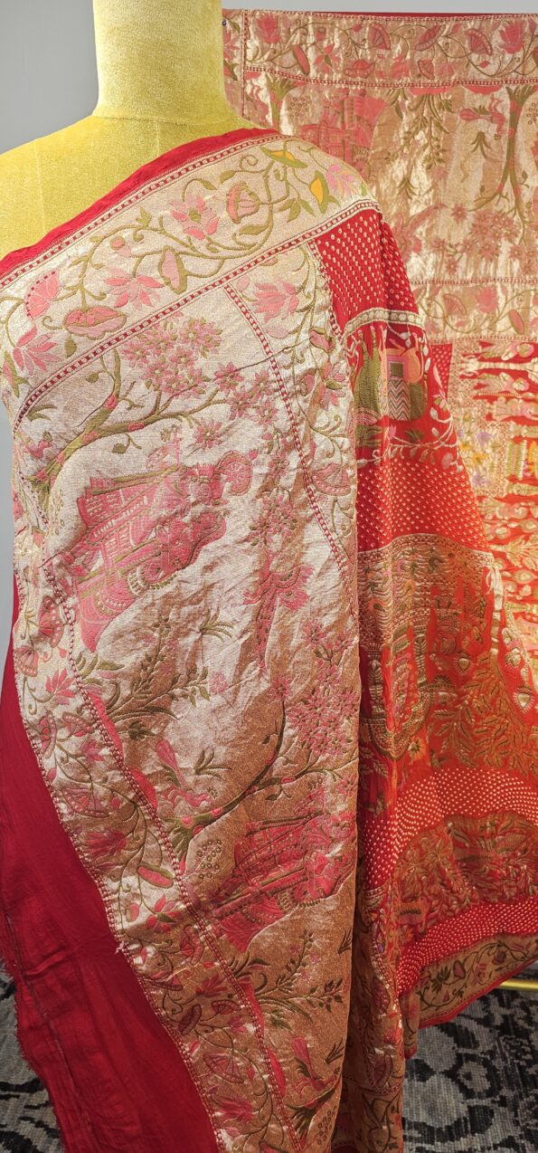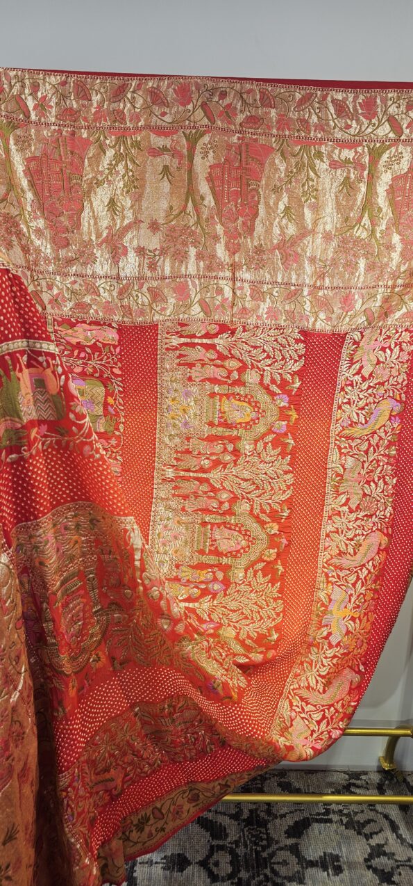 Red to orange (peeliya) duppatta with radha krishna figures on the pallu and with rasleela concept and raidana Bandej on the middle of the duppatta