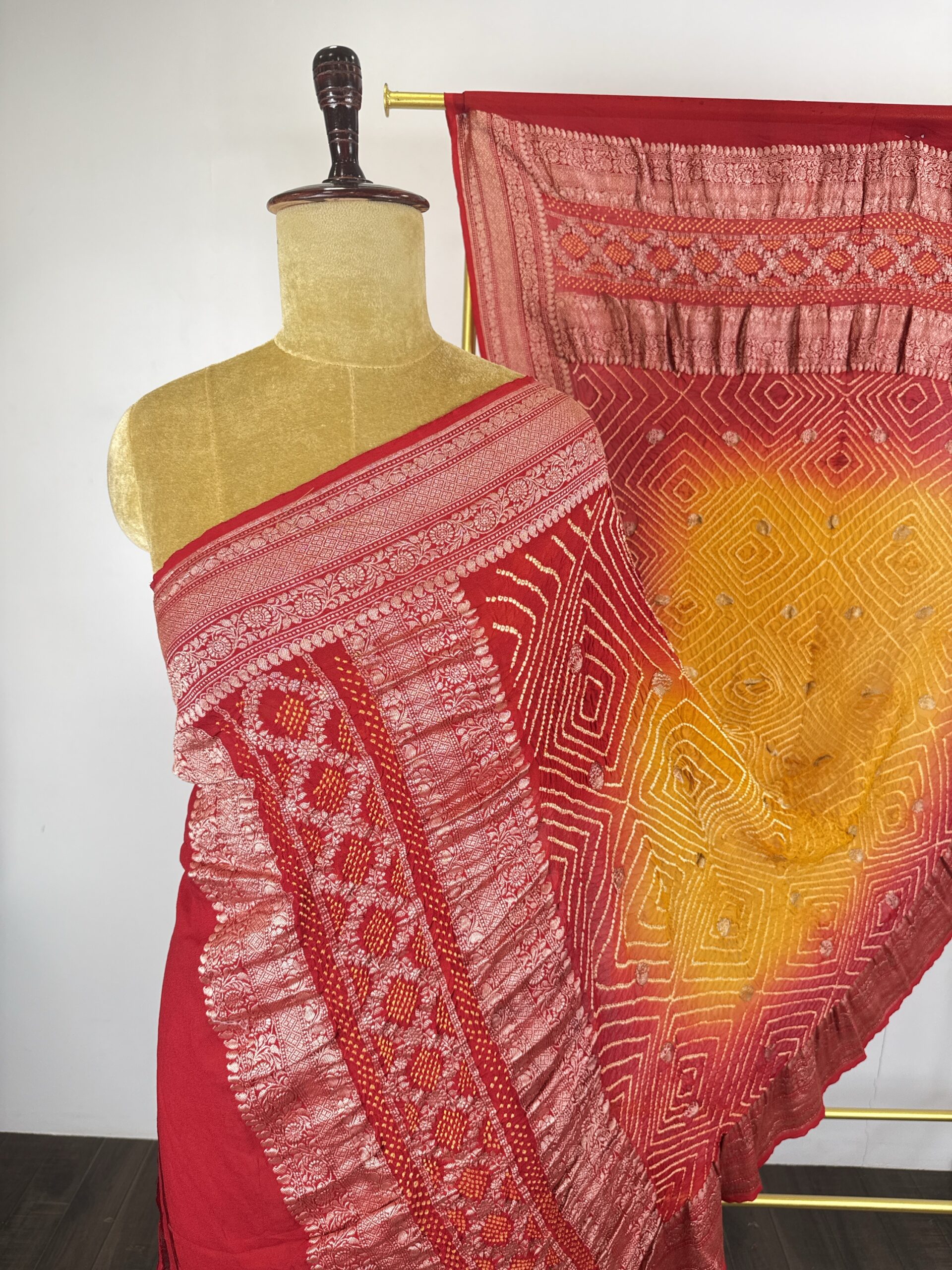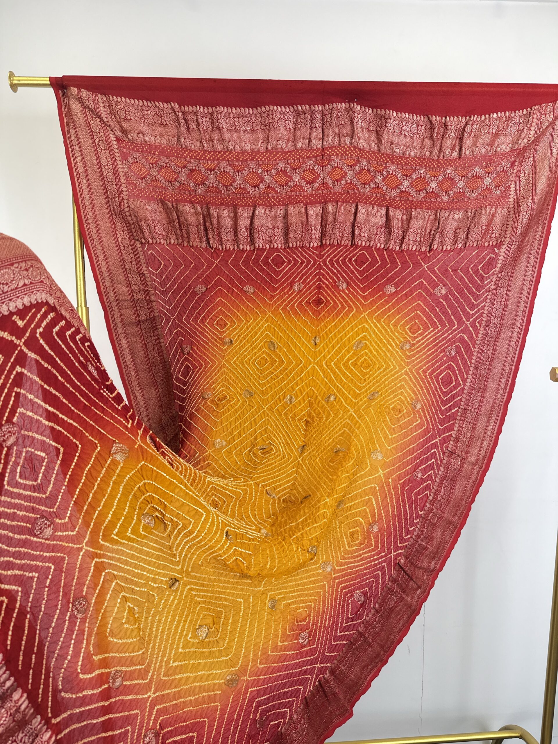 Red to orange (pilia) bandhani dupatta with floral motifs detailed with Gold zari on Georgette