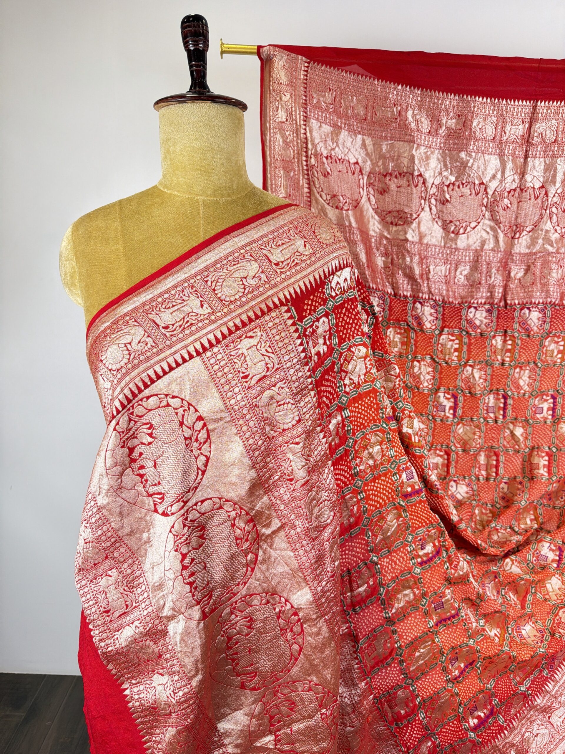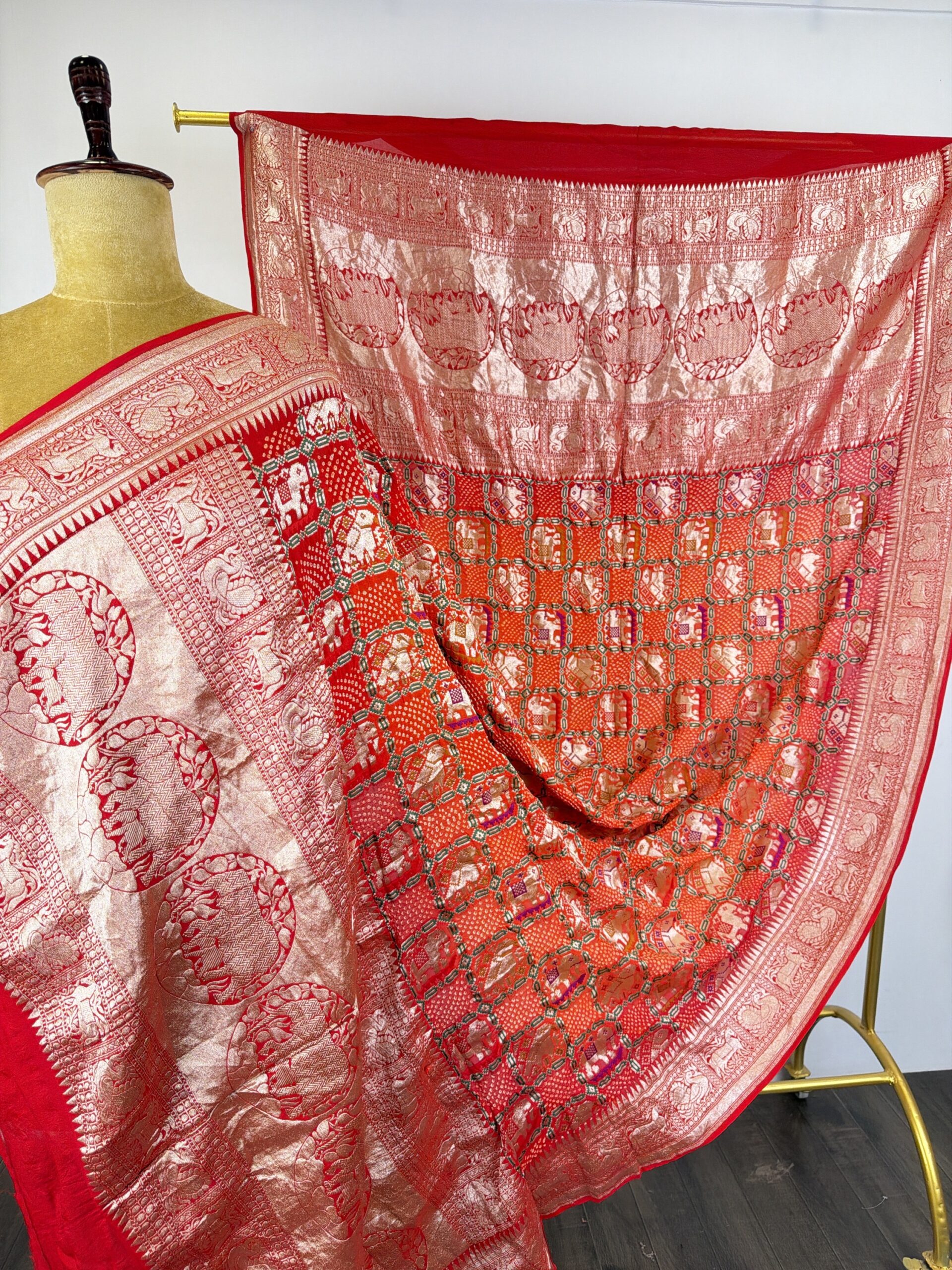 Red to orange (pilia) Gajraj bandhani dupatta with Gajraj concept detailed with gold zari on georgette