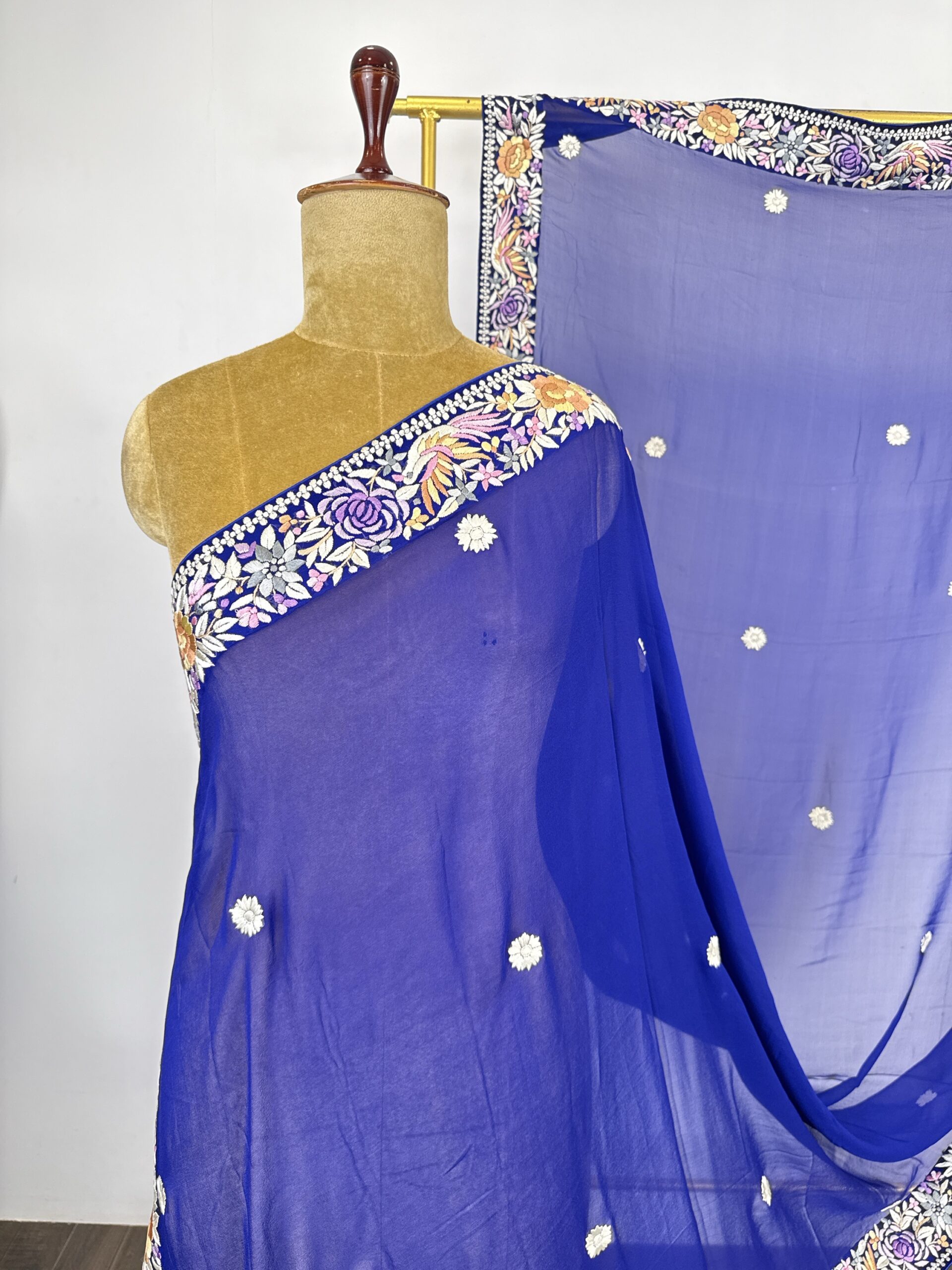 Royal blue colour Parsi gara dupatta with floral motifs with hand done embroidery