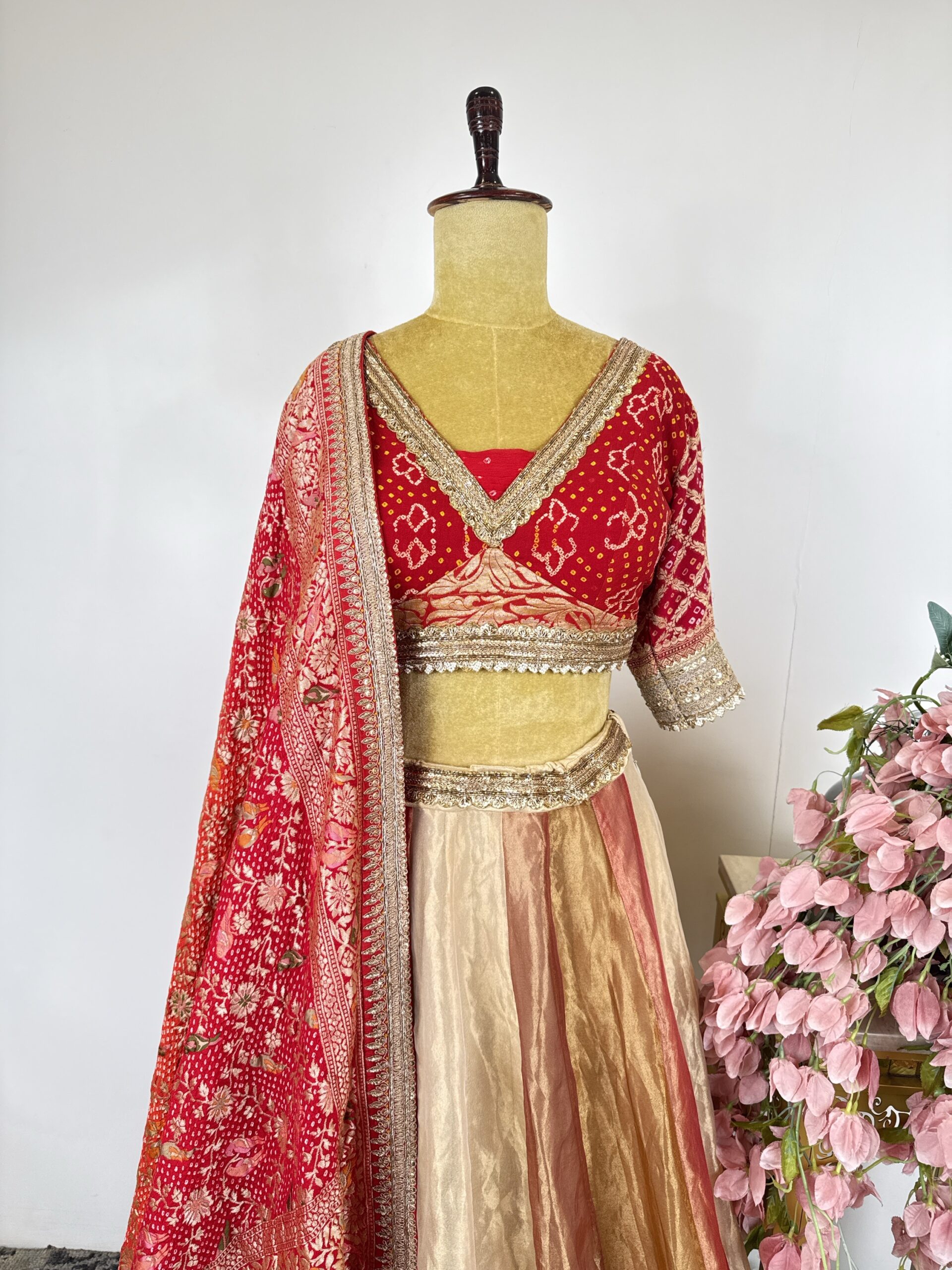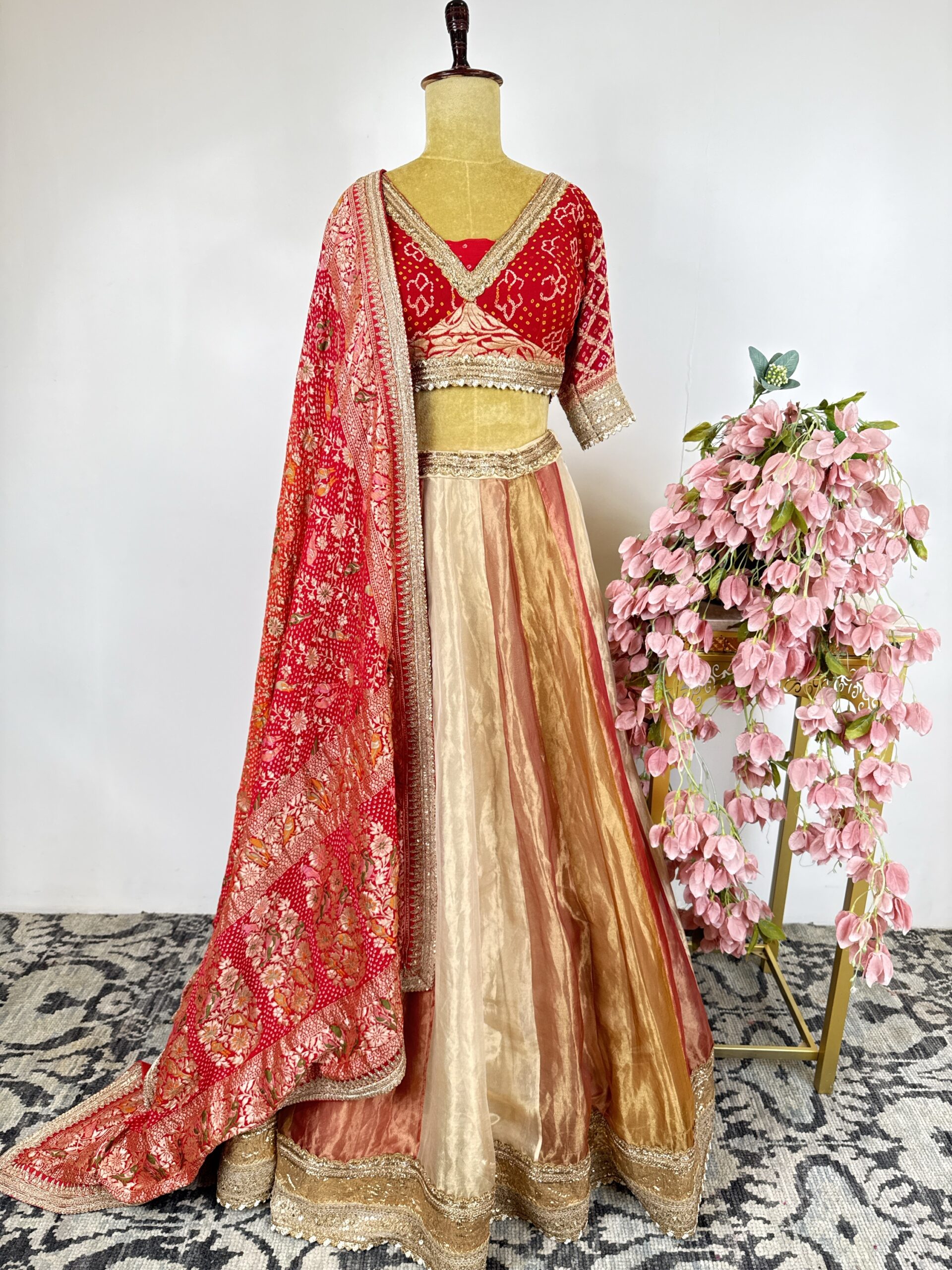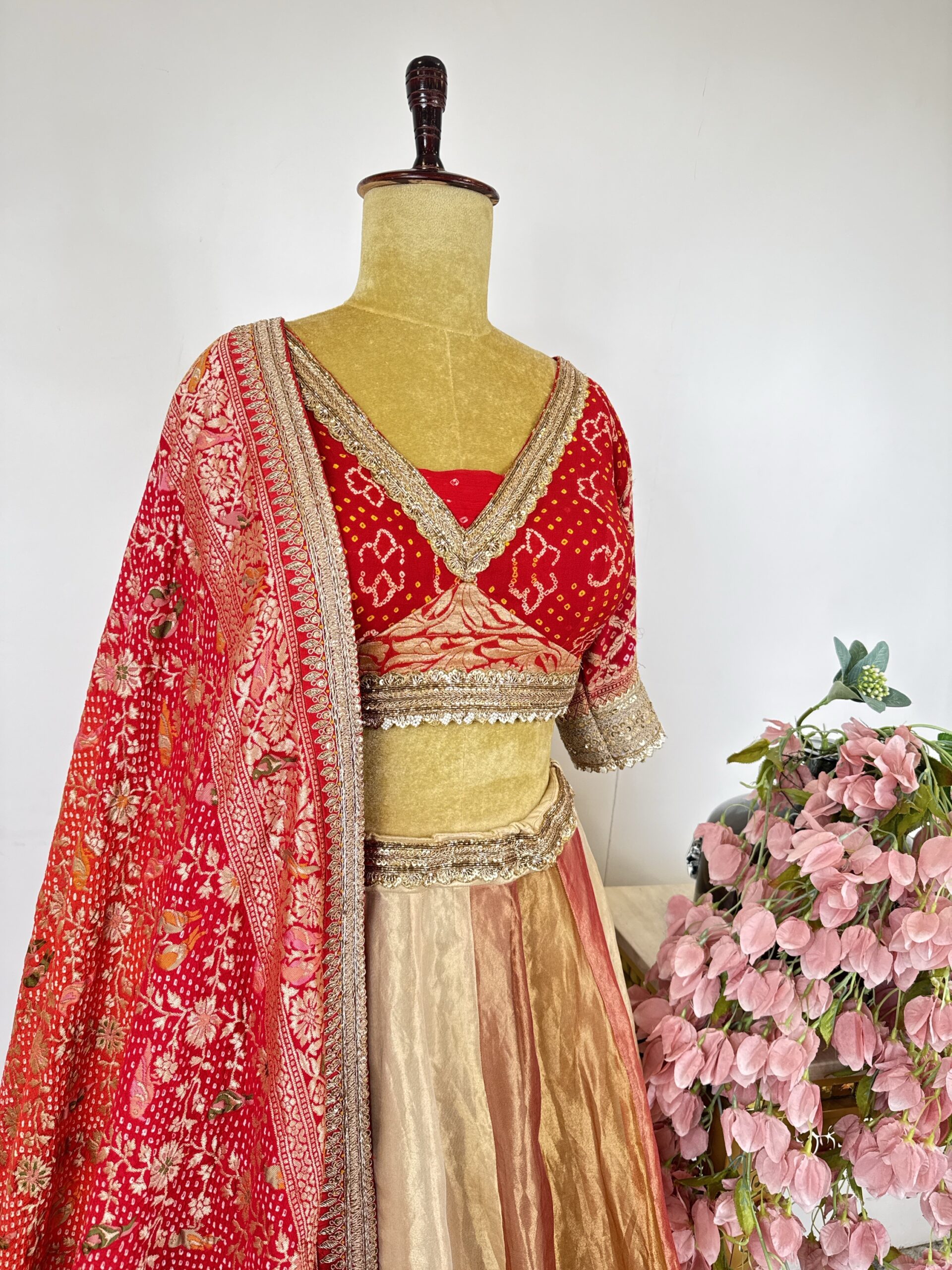Rust orange tissue lehenga with Bandhani pilia dupatta with floral motifs detailed with meenakari and gold zari and paired with red colour bandhani blouse