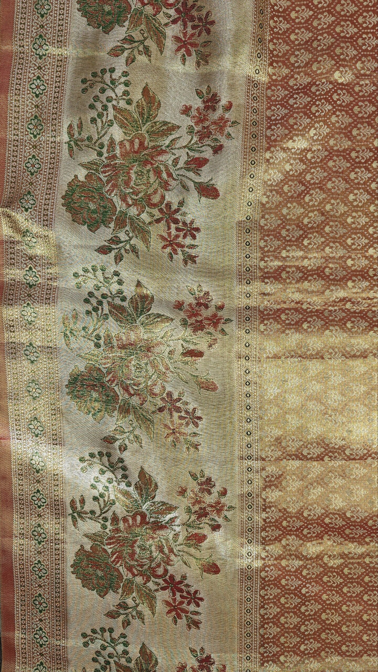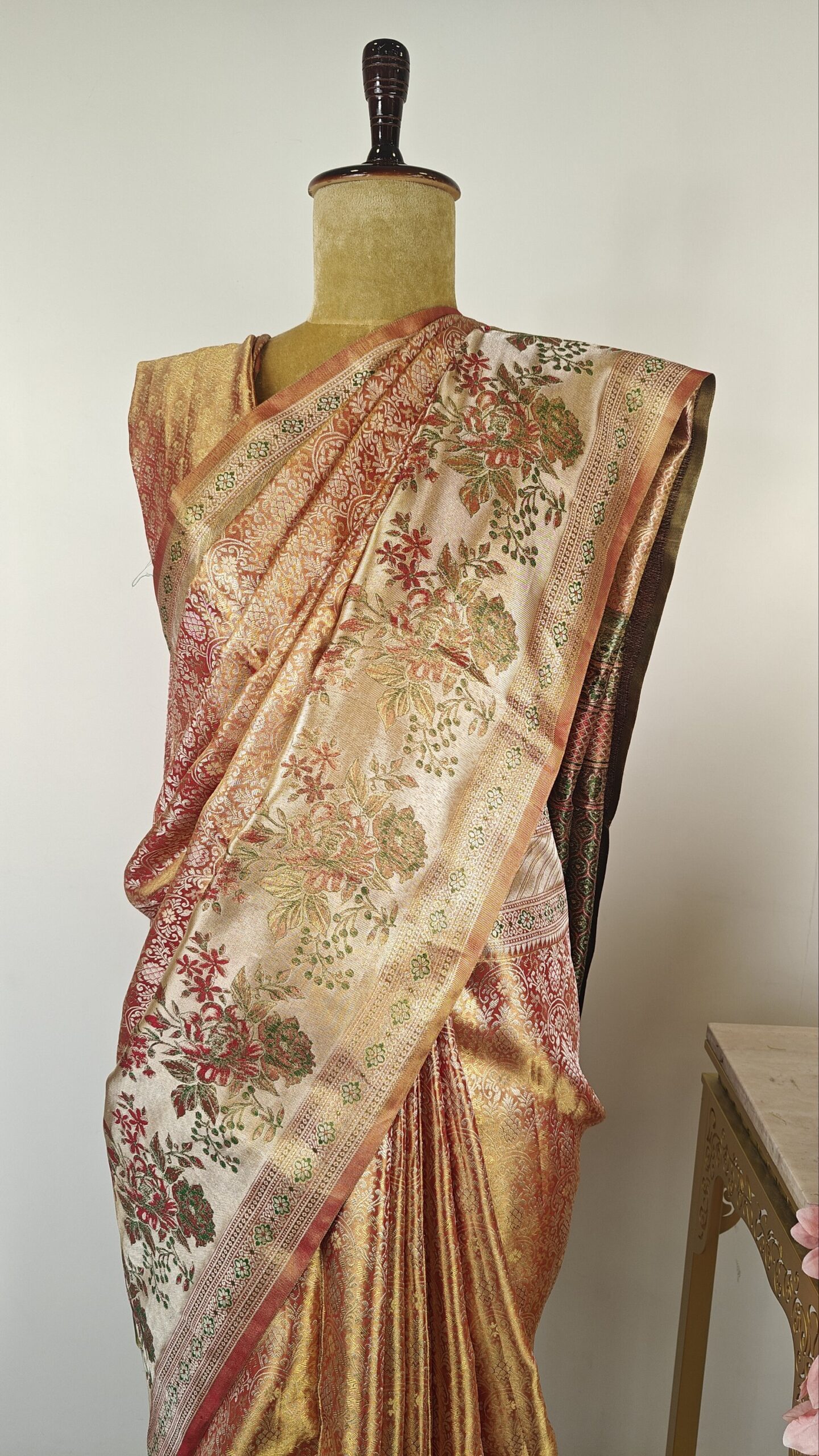 Saffron colour Kanchi saree with contrast green border with all over pine apple motifs on the saree with floral motifs