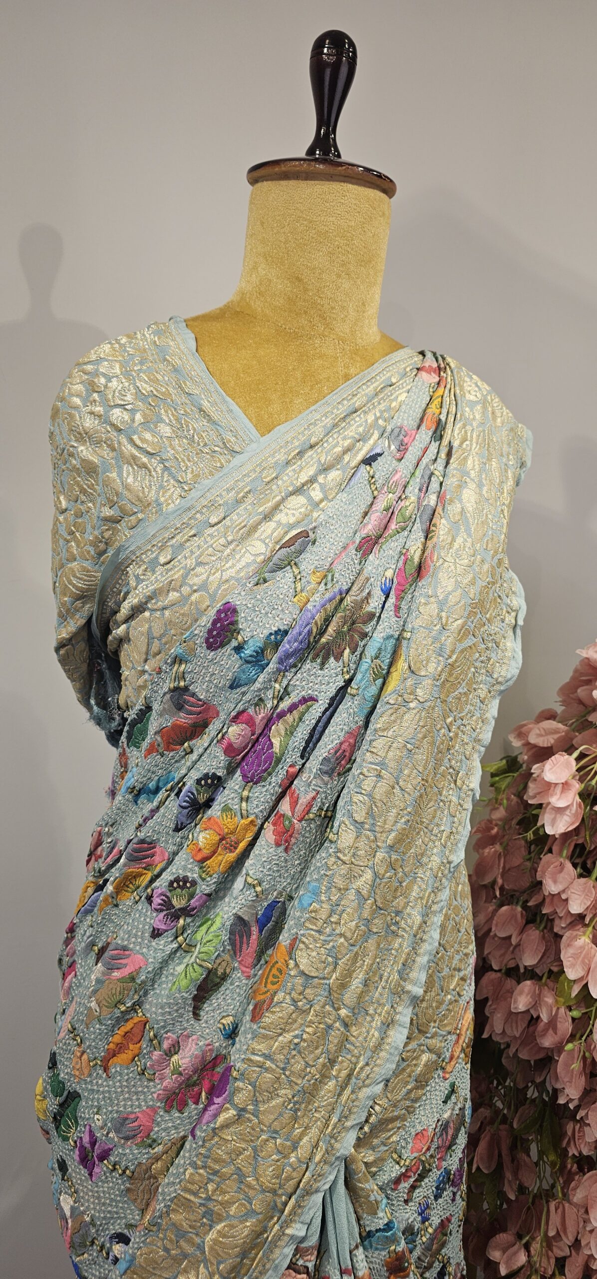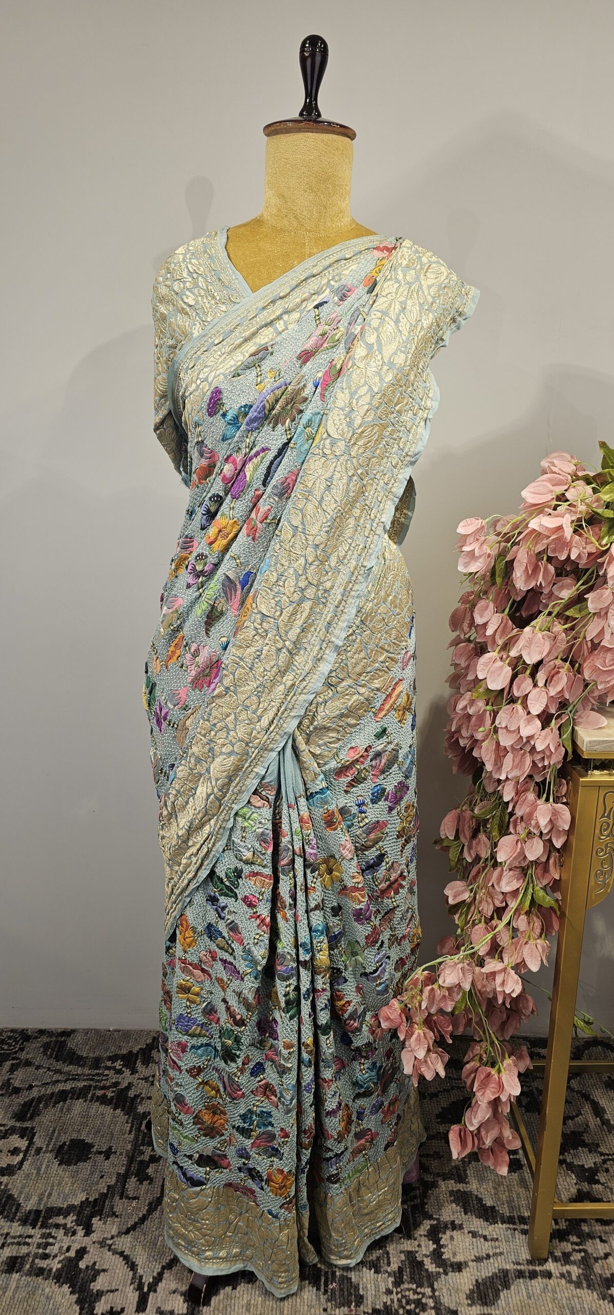 Sea blue colour bandhani saree with all over meenakari with floral and swan motifs with zari border