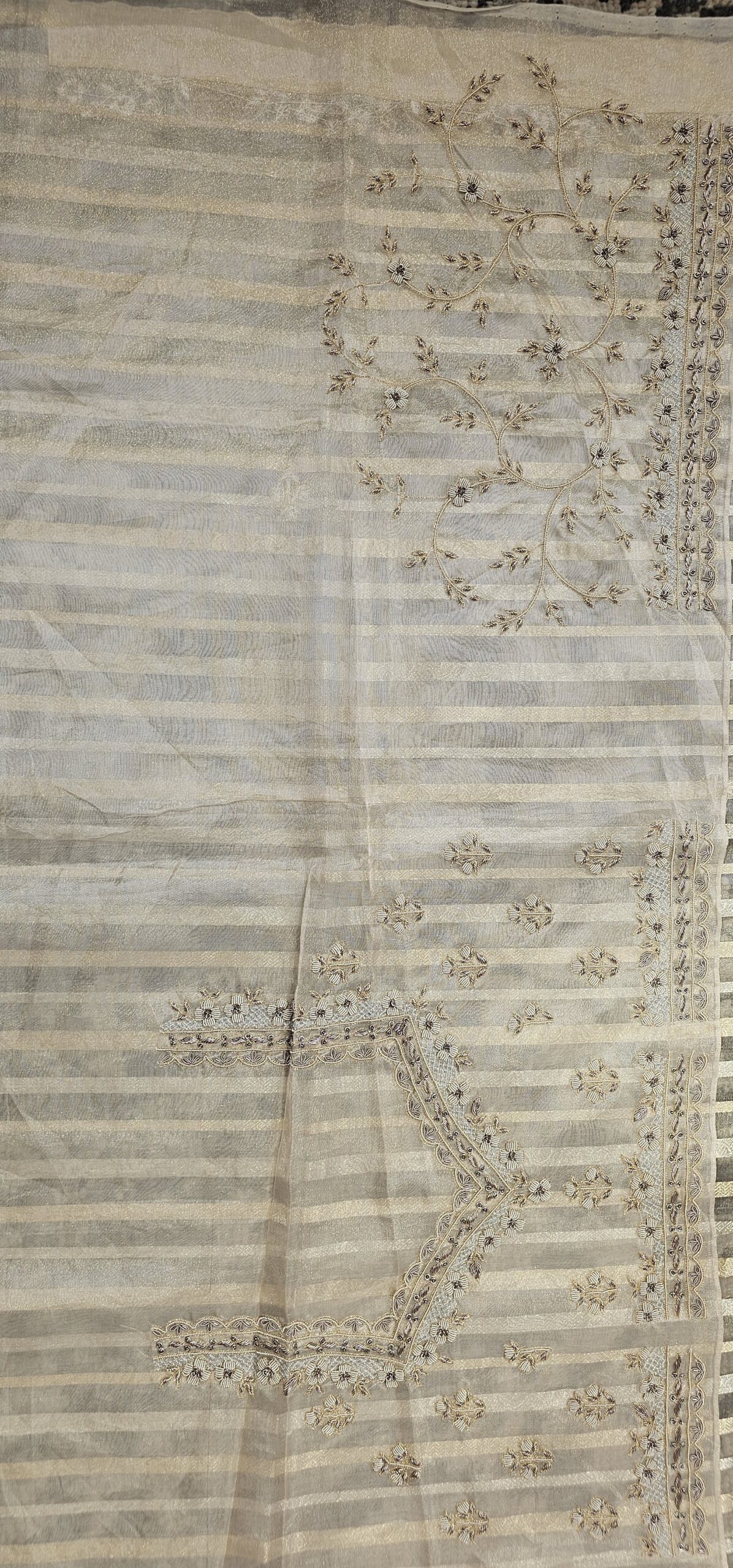 Silver tissue organza saree with beautiful hand done thread embroidery border and a heavy loaded zardosi work blouse.