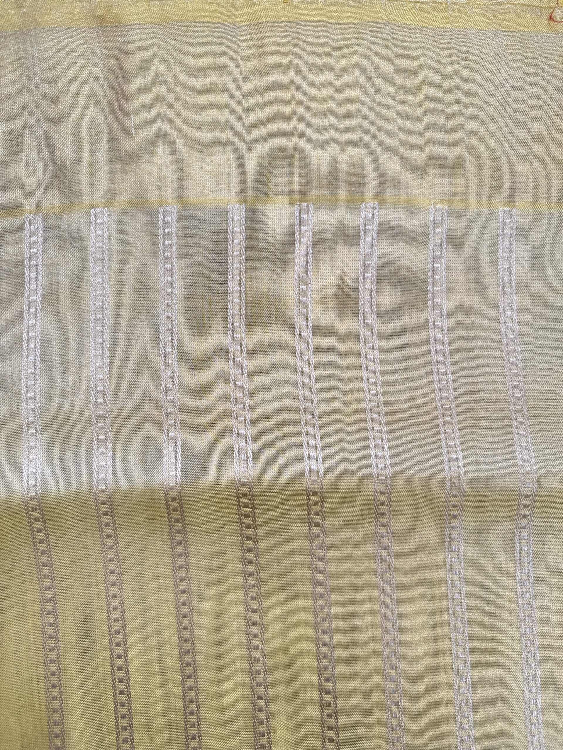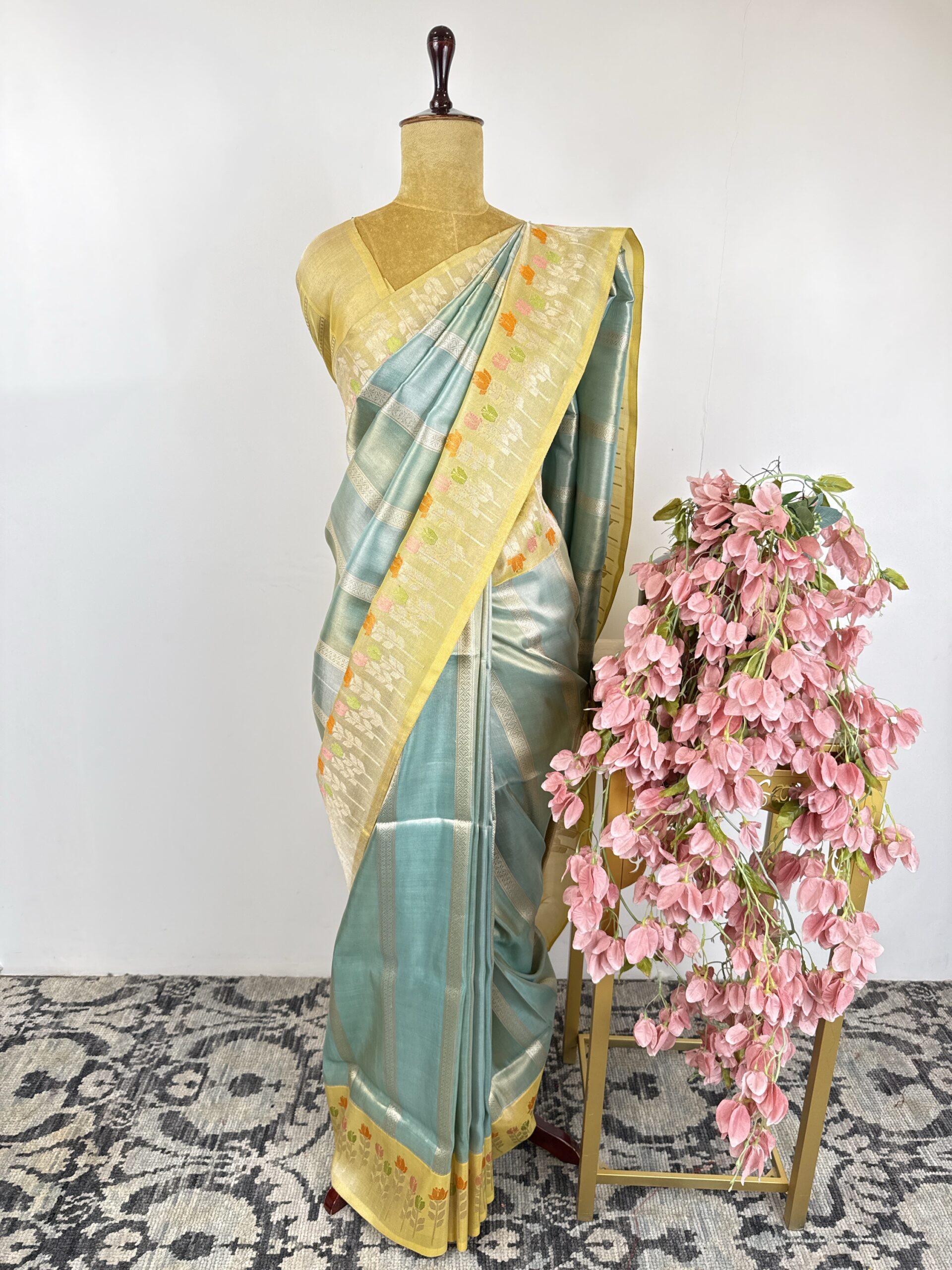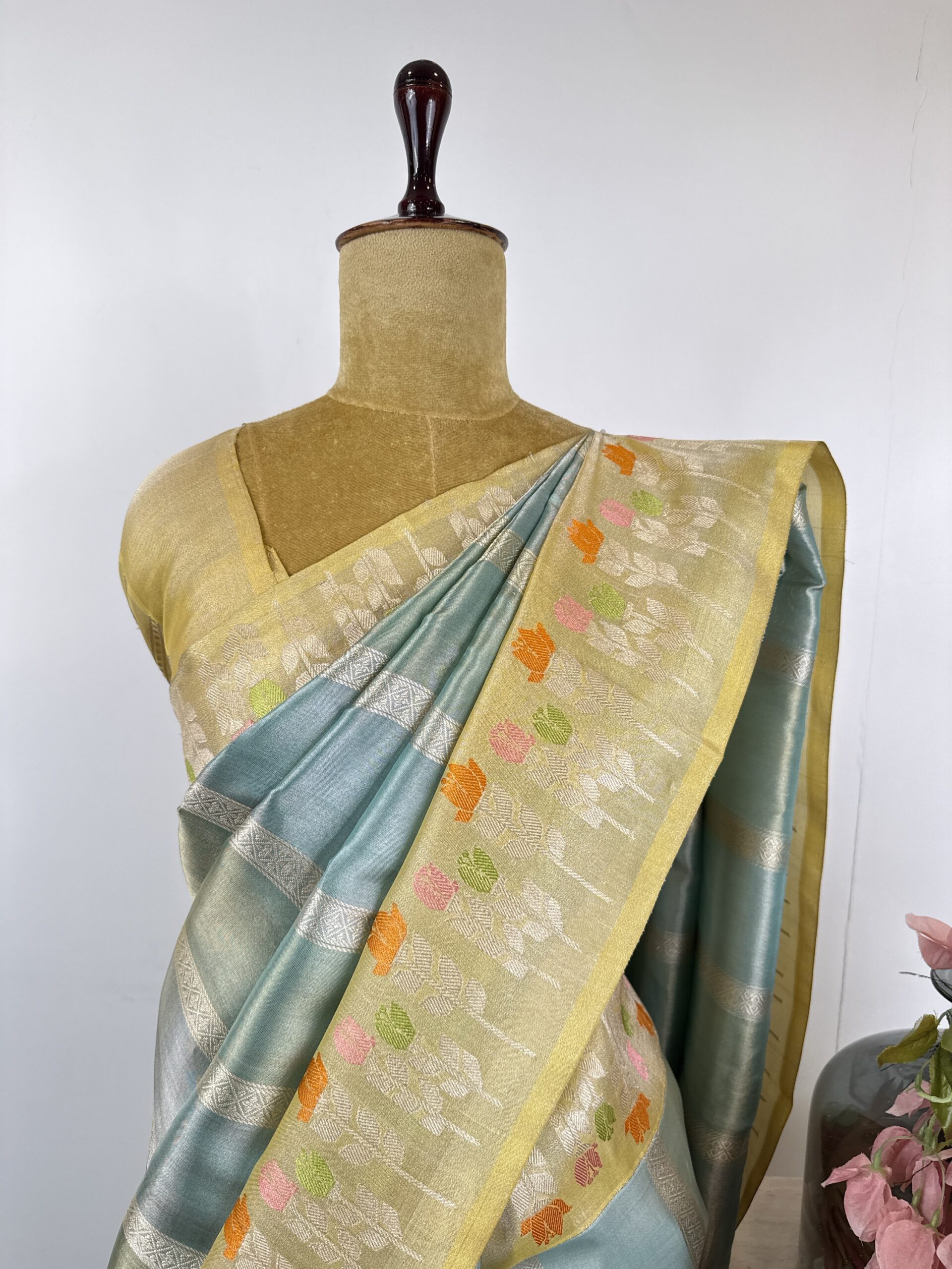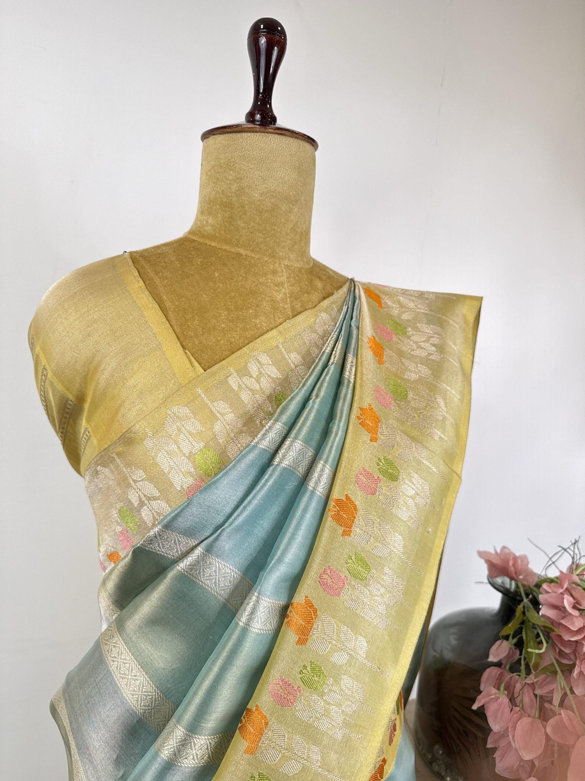 Sky blue colour Kora Banarasi saree with yellow colour border with floral motifs in the border
