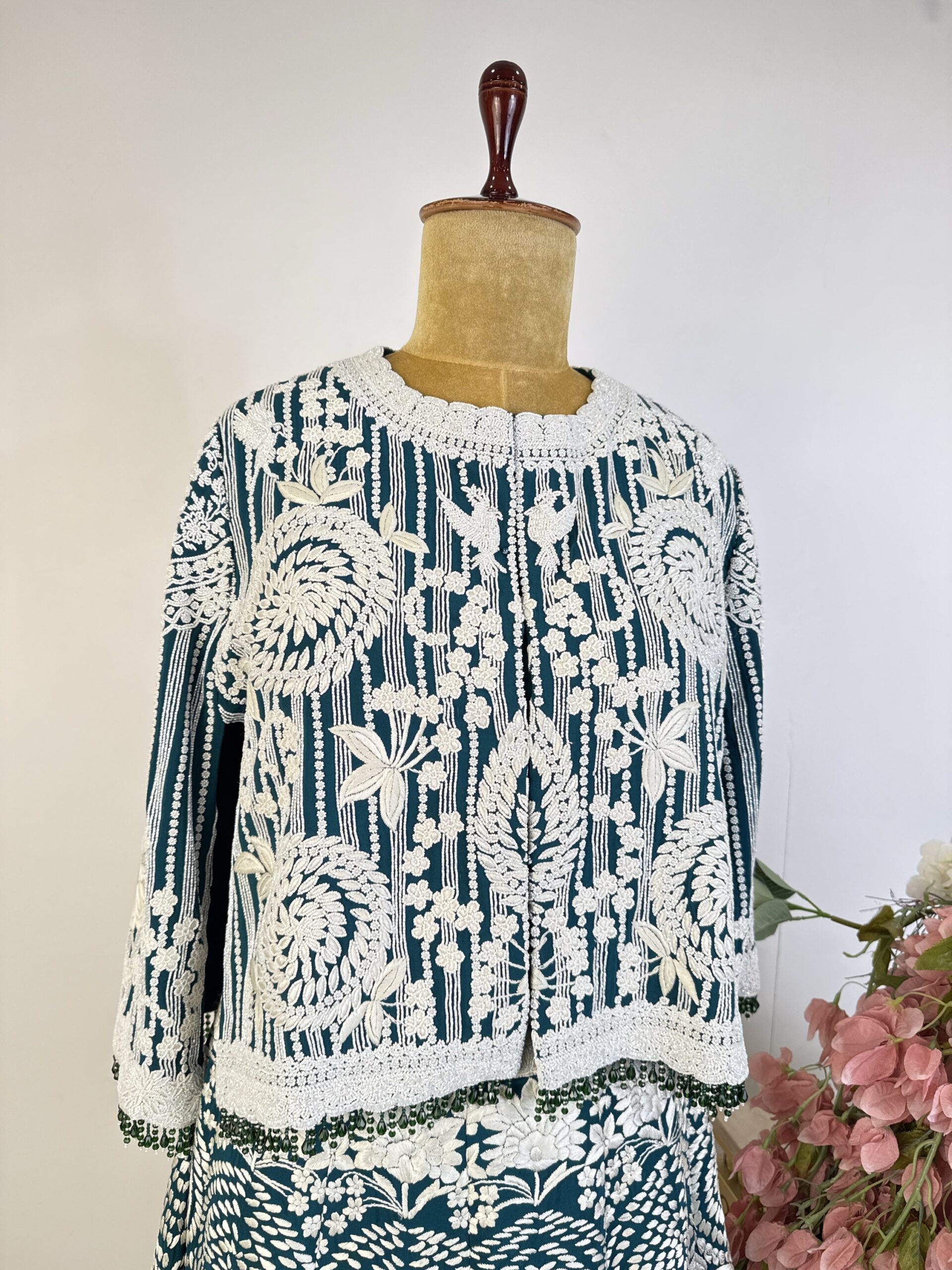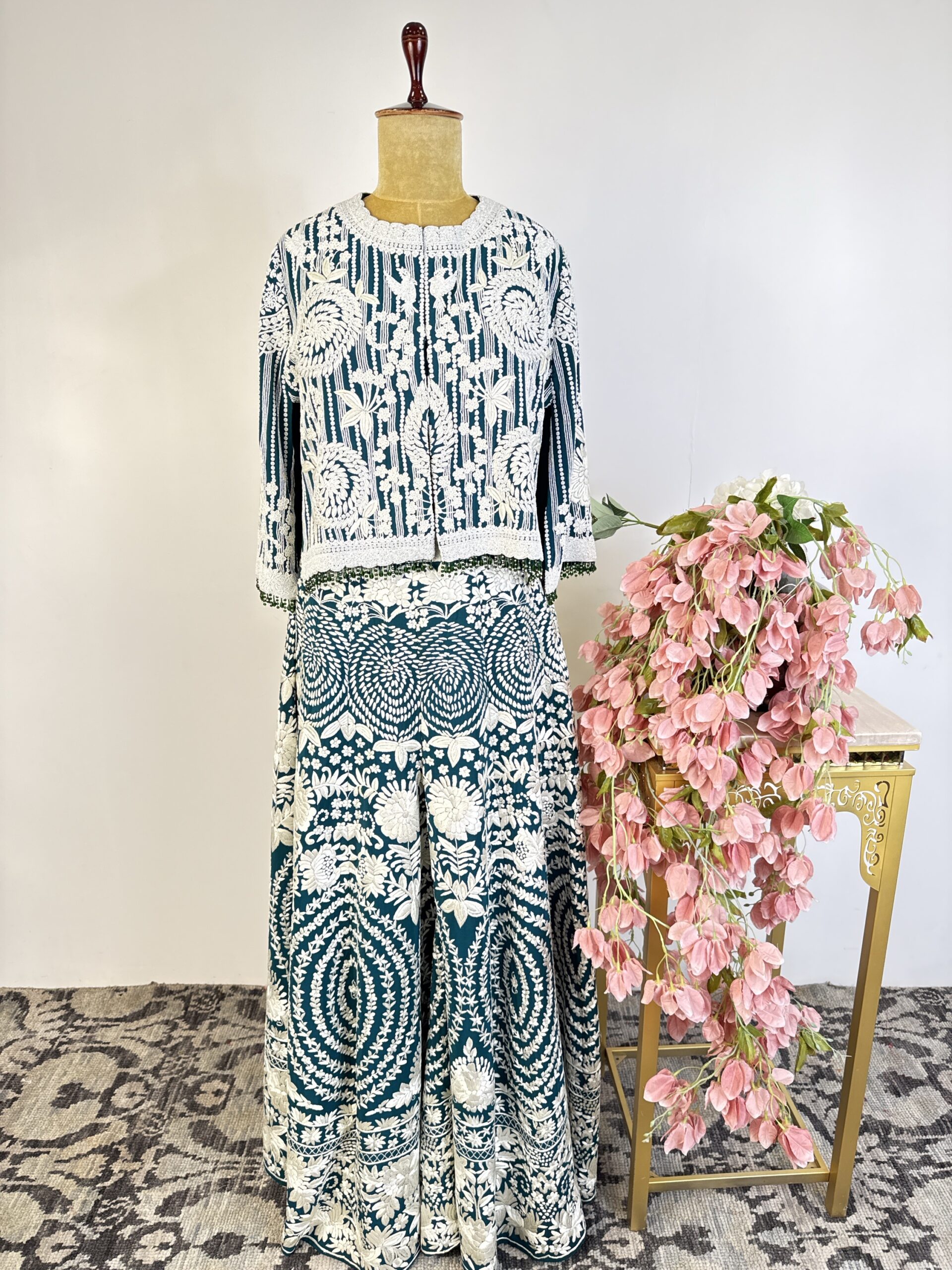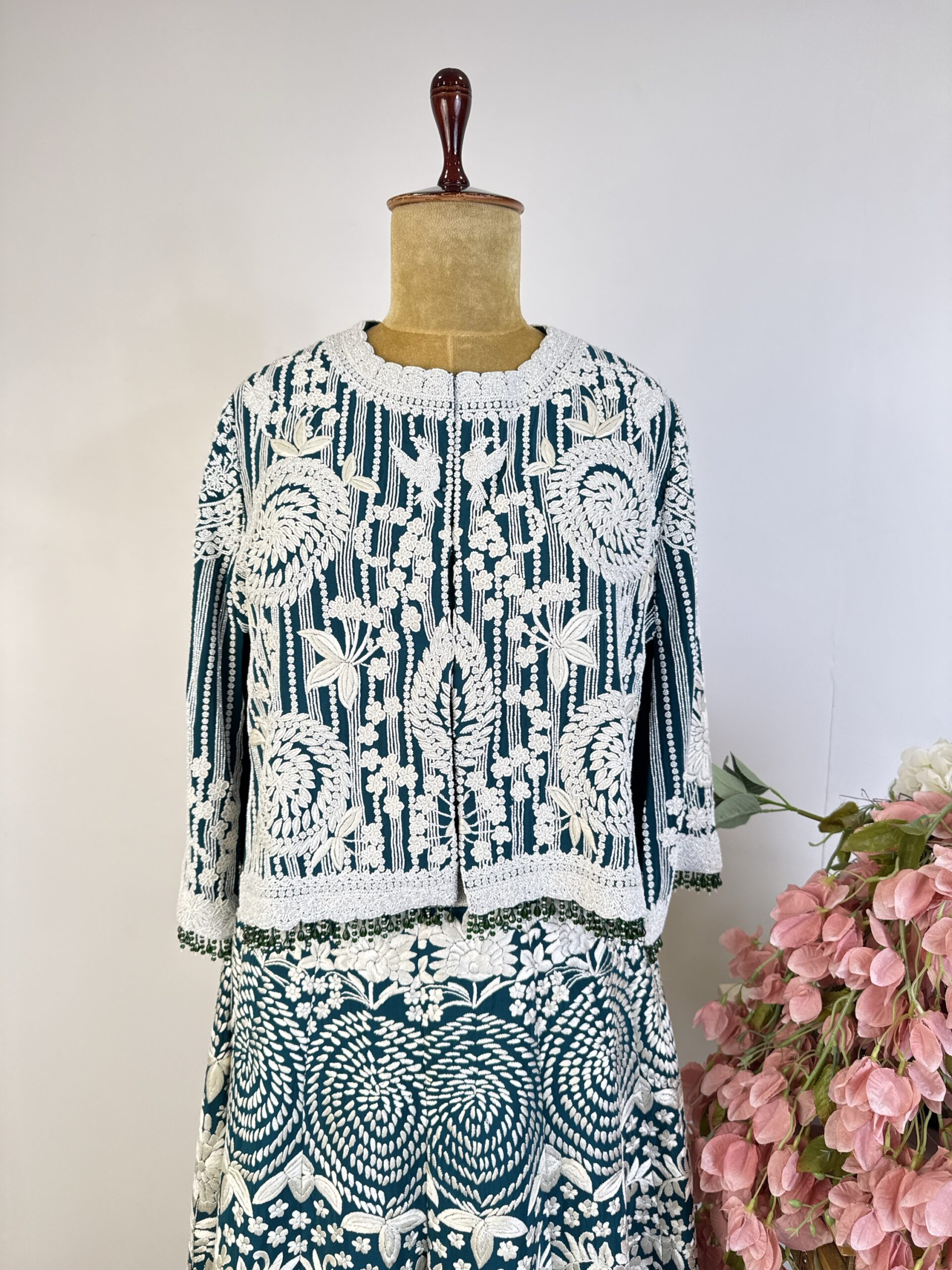 Teal green indo western cord set with flared pants and jacket detailed with Parsigara floral motifs and pearls embroidered and Scalap border with hangings