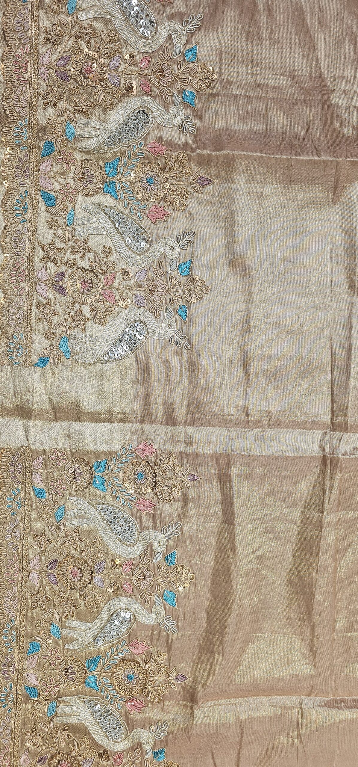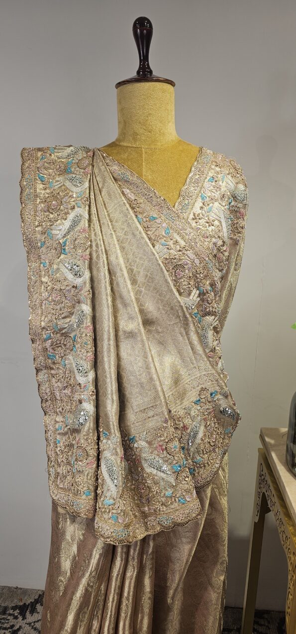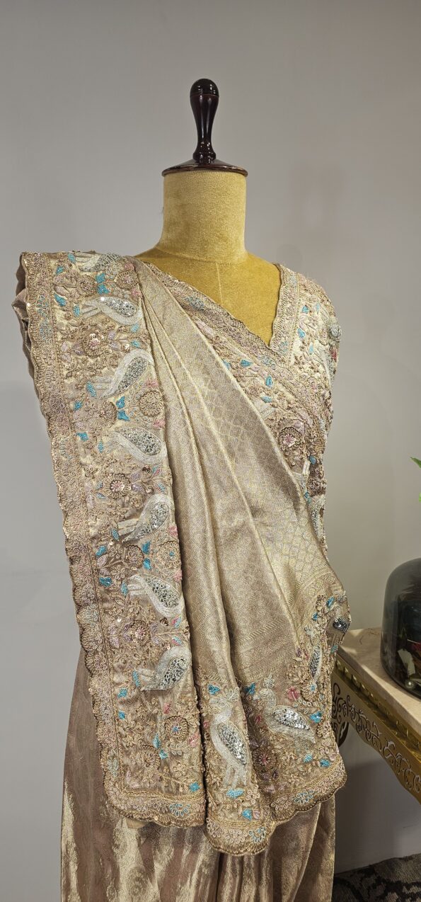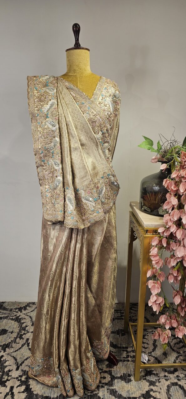 Rose gold Tissue saree with zardosi and Dori work and a stunning blouse.