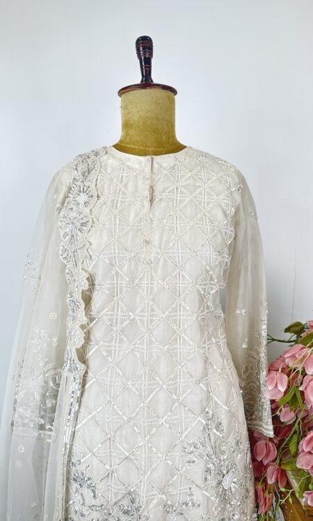 - Graceful Glimmers: Double-Shaded White & Peach Gown with Zari & Thread Embroidery