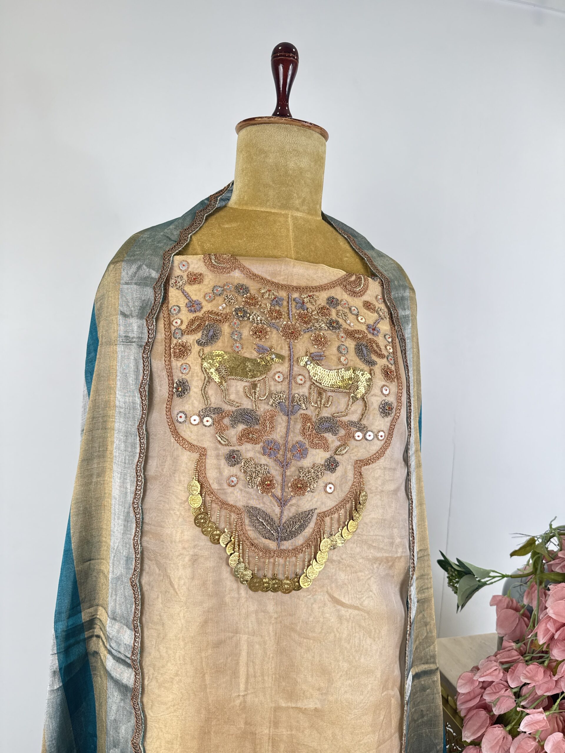 Tissue unstitched suit with deer’s and floral motifs detailed with Zardosi and sequins thread embroidery and paired with dupatta and bottom
